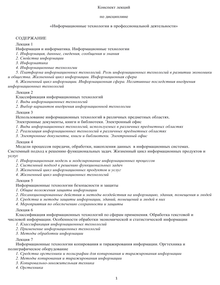 Конспект лекций по дисциплине «Информационные технологии в профессиональной деятельности» СОДЕРЖАНИЕ Лекция 1 Информация и информатика. Информационные технологии 1. Информация, данные, сведения, сообщения и знания 2. Свойства информации 3. Информатика 4. Информационные технологии 5. Платформа информационных технологий. Роль информационных технологий в развитии экономики и общества. Жизненный цикл информации. Информационная сфера 6. Жизненный цикл информации. Информационная сфера. Негативные последствия внедрения информационных технологий Лекция 2 Классификация информационных технологий 1. Виды информационных технологий 2. Выбор вариантов внедрения информационной технологии Лекция 3 Использование информационных технологий в различных предметных областях. Электронные документы, книги и библиотеки. Электронный офис 1. Виды информационных технологий, используемых в различных предметных областях 2. Реализация информационных технологий в различных предметных областях 3. Электронные документы, книги и библиотеки. Электронный офис Лекция 4 Модели процессов передачи, обработки, накопления данных в информационных системах. Системный подход к решению функциональных задач. Жизненный цикл информационных продуктов и услуг 1. Информационная модель и моделирование информационных процессов 2. Системный подход к решению функциональных задач 3. Жизненный цикл информационных продуктов и услуг 4. Жизненный цикл информационных технологий Лекция 5 Информационные технологии безопасности и защиты 1. Общие положения защиты информации 2. Несанкционированные действия и методы воздействия на информацию, здания, помещения и людей 3. Средства и методы защиты информации, зданий, помещений и людей в них 4. Мероприятия по обеспечению сохранности и защиты Лекция 6 Классификация информационных технологий по сферам применения. Обработка текстовой и числовой информации. Особенности обработки экономической и статистической информации 1. Классификация информационных технологий 2. Применение информационных технологий 3. Методы обработки информации Лекция 7 Информационные технологии копирования и тиражирования информации. Оргтехника и полиграфическое оборудование 1. Средства оргтехники и полиграфии для копирования и тиражирования информации 2. Методы копирования и тиражирования информации 3. Копировально-множительная техника 4. Оргтехника 1 Лекция 8 Программно-технические средства информационные технологии 1. Компоненты программно-аппаратных компьютерных средств 2. Программное обеспечение информационных технологий 3. Технические средства информационных технологий Лекция 9 Технологии открытых систем. Объектно-ориентированные информационные технологии. Распределенные системы обработки данных. Функционально-распределенные информационные технологии 1. Открытые системы 2. Объектно-ориентированные информационные технологии 3. Распределённые системы обработки данных Лекция 10 Информационные технологии конечного пользователя. Стандарты пользовательского интерфейса. Критерии оценки информационных технологий 1. Информационные технологии конечного пользователя 2. Пользовательский интерфейс 3. Стандарты пользовательского интерфейса 4. Оценка информационных технологий Лекция 11 Графическое изображение технологического процесса. Обработ
