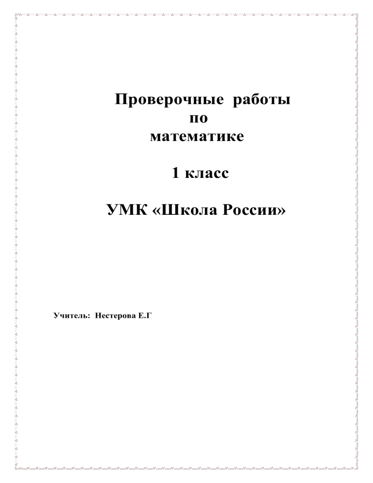 Проверочные работы по математике 1 класс УМК «Школа России» Учитель: Нестерова Е.Г АННОТАЦИЯ Данное пособие содержит тексты проверочных работ и тестов по математике для 1 класса начальной школы, составленные в полном соответствии с программой и учебно-методическим комплектом пособий по математике для 1 класса авторского коллектива под руководством М. И. Моро. Материал пособия представлен в определённой системе: проверочные работы составлены по отдельным, наиболее важным вопросам, на которые разбивается каждая тема первого года обучения. Материал расположен по темам в порядке прохождения его в 1 классе. Проверочные работы составлены в соответствии с требованиями минимума содержания образовательного стандарта. Пособие предназначено для реализации такого важного компонента учебной деятельности, как проведение самоконтроля и самооценки: дети выполняют предложенные работы, сами оценивают и фиксируют результаты своей учебной деятельности и продвижение по каждой из изучаемых тем. Использование материалов сборника «Проверочные работы» поможет заложить основу для формирования и последующего развития у школьников личностных и регулятивных учебных действий, а именно: — умений понимать, принимать и сохранять учебную цель, учебную задачу; — умений контролировать предметные результаты своей учебной деятельности, включая осуществление контроля в сотрудничестве с учителем; — умений анализировать полученные результаты, выявлять те разделы и способы действий, над которыми ещё надо работать, осознать, что ученик сам может управлять своей учебной деятельностью, улучшать свои результаты, работая над проблемными вопросами. Каждая работа выполняется за 1 урок. Время выполнения работы – 35-40 минут. Имеются критерии оценивания. Проверочная работа по теме: «Пространственные и временные представления» 1 вариант 1. Нарисуй квадрат. Слева от него нарисуй кружок __________________________________________________________________ 2. Нарисуй четыре яблочка. Закрась третий по счёту __________________________________________________________________ 3. Нарисуй столько грибов, сколько пальцев на левой руке ____________________________________________________________________ 4. Нарисуй 8 треугольников. Закрась каждый второй _______________________________________________________________ 5. Обозначь числом количество фигур: 6. Что на этом рисунке расположено правее: грибок или яблоко? Обведи правильный ответ красным карандашом. «Пространственные и временные представления» 2 вариант 1. Нарисуй в центре кружок. Треугольник нарисуй слева от кружка. Квадрат нарисуй справа от кружка. _______________________________________________________________ 2. Нарисуй шесть синих треугольников. Зачеркни третий по счёту. ________________________________________________________________ 3. У Светы груш больше 2 и меньше 4. Нарисуй эти груши ________________________________________________________________ 4. Нарисуй 7 мячей. Закрась в таком порядке: два красных, один зелёный и так далее _________________________________________________________________ 5. Дорисуй ещё три фигуры. Обозначь числом общее количество фигур: 6. Раскрась рыбки так, чтобы жёлтая была между синей и красной, а справа от жёлтой – синяя. Проверочная работа по теме: «Сравнение предметов и групп предметов. Пространственные и временные представления» 1. Раскрась игрушку, которая находится справа 2. Раскрась листик, который меньше 3. Раскрась картинку, которая находится между куклой и машинкой 4. Нарисуй столько квадратов, сколько самолетиков 5. На