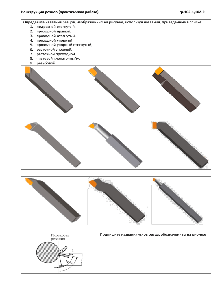 Конструкция резцов (практическая работа) гр.102-1,102-2 Определите названия резцов, изображенных на рисунке, используя названия, приведенные в списке: 1. подрезной отогнутый, 2. проходной прямой, 3. проходной отогнутый, 4. проходной упорный, 5. проходной упорный изогнутый, 6. расточной упорный, 7. расточной проходной, 8. чистовой «лопаточный», 9. резьбовой Подпишите названия углов резца, обозначенных на рисунке Задание Для обработки каких материалов применяют резцы с положительными передними углами? Для обработки каких материалов применяют резцы с отрицательными передними углами? Как классифицируются резцы по виду соединения пластины с державкой? Как устанавливаются в резцедержателе резцы с цилиндрическими державками? Сколько вспомогательных режущих кромок имеет проходной отогнутый резец? С какими направлениями подач работают проходные отогнутые резцы? (выберите правильный ответ) Чему равен главный угол в плане проходного упорного резца? Чему равен угол при вершине проходного упорного резца? Для обработки каких поверхностей предназначены проходные упорные резцы? Для обработки каких поверхностей предназначены проходные прямые резцы? Чему равен главный угол в плане подрезного резца? Чему равен угол при вершине подрезного резца? При каких условиях резания работает чистовой «лопаточный» резец? (выберите правильный ответ) Чему равен передний угол чистового «лопаточного» резца? Чему равен главный задний угол отрезного резца? Чему равен главный угол в плане отрезного резца? Какое обязательное условие должно быть выполнено при установке отрезного резца? Чем канавочные резцы отличаются от отрезных? Какому условию должна удовлетворять державка расточного резца? Чему равен главный угол в плане расточного отогнутого резца? Чему равен угол при вершине расточного отогнутого резца? Чему равен угол при вершине расточного упорного резца? Ответ а) Только на продольной подаче б) Только на поперечной подаче в) На продольной и на поперечной а) Точение с малой глубиной резания (менее 0,5 мм) с большой скоростью резания и подачей б) Точение с очень малой глубиной резания (менее 0,25 мм) на малой скорости резания с большой подачей в) Точение с глубиной резания до 1 мм на малой скорости резания с малой подачей