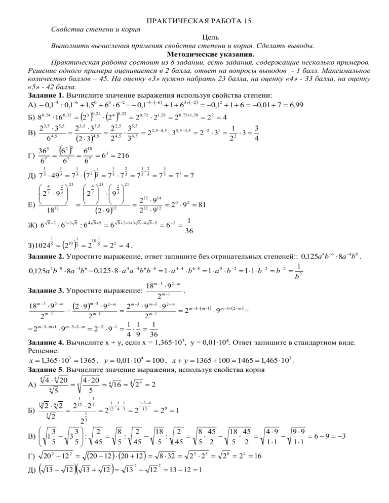 ПРАКТИЧЕСКАЯ РАБОТА 15 Свойства степени и корня Цель Выполнить вычисления применяя свойства степени и корня. Сделать выводы. Методические указания. Практическая работа состоит из 8 задании, есть задания, содержащие несколько примеров. Решение одного примера оценивается в 2 балла, ответ на вопросы выводов - 1 балл. Максимальное количество баллов – 45. На оценку «3» нужно набрать 23 балла, на оценку «4» - 33 балла, на оценку «5» - 42 балла. Задание 1. Вычислите значение выражения используя свойства степени: А) 0,14 : 0,16 1,50 63 62 = 0,14 6 1 63 2 0,12 1 6 0,01 7 6,99 Б) 80, 24 16 0,32 23 0 , 24 В) 24 0 , 32 2 0, 72 21, 28 2 0, 721, 28 2 2 4 23,5 35,5 23,5 35,5 2 2,5 35,5 1 3 4,5 4,5 2 2,54,5 35,54,5 2 2 31 2 3 4,5 4,5 6 2 3 2 4 2 3 5 365 62 610 Г) 7 7 7 63 216 6 6 6 Д) 7 3 49 3 7 3 7 2 3 7 3 7 3 7 3 3 7 3 71 7 1 1 1 74 23 2 9 Е) 12 18 21 1 1 21 74 23 2 9 12 2 9 2 1 2 3 21 212 914 2 0 9 2 81 12 12 2 9 1 Ж) 6 8 2 613 8 : 6 4 8 5 6 8 213 8 4 8 5 6 2 36 1 1 10 1 З) 10245 210 5 2 5 22 4 . Задание 2. Упростите выражение, ответ запишите без отрицательных степеней:: 0,125а 4b6 8a 4b8 . 1 0,125а 4b 8 8a 4b 6 = 0,125 8 a 4 a 4 b 6 b 8 1 a 44 b 68 1 a 0 b 2 1 1 b 2 b 2 2 b m 3 2m 18 9 Задание 3. Упростите выражение: . 2m 1 18m 3 92 m 2 9m3 9 2m 2 m3 9 m3 9 2m = 2 m3m1 9 m32m = m 1 m 1 m 1 2 2 2 1 1 1 = 2m3m1 9m32m 2 2 91 4 9 36 Задание 4. Вычислите х + у, если х = 1,365∙103, у = 0,01∙104. Ответ запишите в стандартном виде. Решение: x 1,365 103 1365 , y 0,01 104 100 , x y 1365 100 1465 1,465 103 . Задание 5. Вычислите значение выражения, используя свойства корня 4 4 4 20 4 4 20 4 16 4 2 4 2 А) 4 5 5 1 1 13 4 2 4 2 212 2 4 Б) 3 212 4 3 2 12 20 1 1 2 23 3 3 2 8 2 18 2 8 45 18 45 : : В) 1 3 : 5 45 5 45 5 45 5 2 5 2 5 1 1 1 12 Г) Д) 20 2 12 2 20 12 20 12 8 32 23 25 28 2 4 16 13 12 13 12 13 12 13 12 1 2 2 49 99 6 9 3 11 11 3 Е) 3 3 3 3 12 13 12 13 12 5 5 5 5 12 13 16 3621 64 5 5 5 6 5 2 25 6 5 1 5 6 5 3 1 Задание 6. Представьте в виде корня: m 2 : m2 . 3 1 2 3 1 Решение: m 2 : m2 = m 2 m1,5 m 4,5 m 2 9 m2 1 3 9 1 m9 . Задание 7. Вынесите множитель из-под знака корня: 3 64b 5c . 3 Решение: 3 64b 5c = 3 26 b3 b 2 c 26 3 b3 3 b 2 c 22 b 3 b 2c 4b 3 b 2c Задание 8. Внесите множитель под знак корня: am 2 4 b . b a mb. am 2 4 b = 4 a 4 4 m 2 4 4 4 4 8 Задачи для самостоятельного решения Вариант 1 Задание 1. Вычислите значение выражения используя свойства степени: А 0,23 0,2 2 53 55 6,24 . Д) Б) В) Е) Ж) Г) 3 З) 814 . Задание 2. Упростите выражение, ответ запишите без отрицательных степеней:: 0,25m6 n3 8m5n2 . 6 n 2 n 1 . 32 n Задание 4. Найдите х+у, если х=737∙10-2, у=0,52∙10 Задание 5. Вычислите значение выражения, используя свойства корня Задание 3. Упростите выражение: Г) А) Д) Б) Е) В) 2 5 Задание 6. Представьте в виде корня: k 2 : k 6 . Задание 7. Вынесите множитель из-под знака корня: 3 81x 4 y 6 . Задание 8. Внесите множитель под знак корня: a 6 b . Выводы 1. Какая функция называется степенной? 2. Какое значение всегда принимает корень четной степени? 3. Запишите свойства степени с натуральным показателем 4. Запишите свойства степени с отрицательным показателем 5. Запишите свойства корня Вариант 2 Задание 1. Вычислите значение выражения используя свойства степени: А 6,10 32 31 23 26 . Б) Е) В) Ж) 3 З) 16 4 . Г) Д) Задание 2. Упростите выражение, ответ запишите без отрицательных степеней:: 0,5a3 b3 4a 5b3 . 27 n 3n 4 . 92 n Задание 4. Найдите х+у, если х=0,235∙101, у=1700∙10-3 Задание 5. Вычислите значение выражения, используя свойства корня Задание 3. Упростите выражение: Г) А) Д) Б) Е) В) 2 2 56 Задание 6. Представьте в виде корня: t t . Задание 7. Вынесите множитель из-под знака корня: 5 64 x10 y 6 . Задание 8. Внесите множитель под знак корня: b3 c . Выводы 1. Какая функция называется степенной? 2. Какое значение всегда принимает корень четной степени? 3. Запишите свойства степени с натуральным показателем 4. Запишите свойства степени с отрицательным показателем 5. Запишите свойства корня. Вариант 3 Задание 1. Вычислите значение выражения используя свойства степени: А 4 2 4 3 1,50 2 : 2 2 . Д) Б) В) Е) 