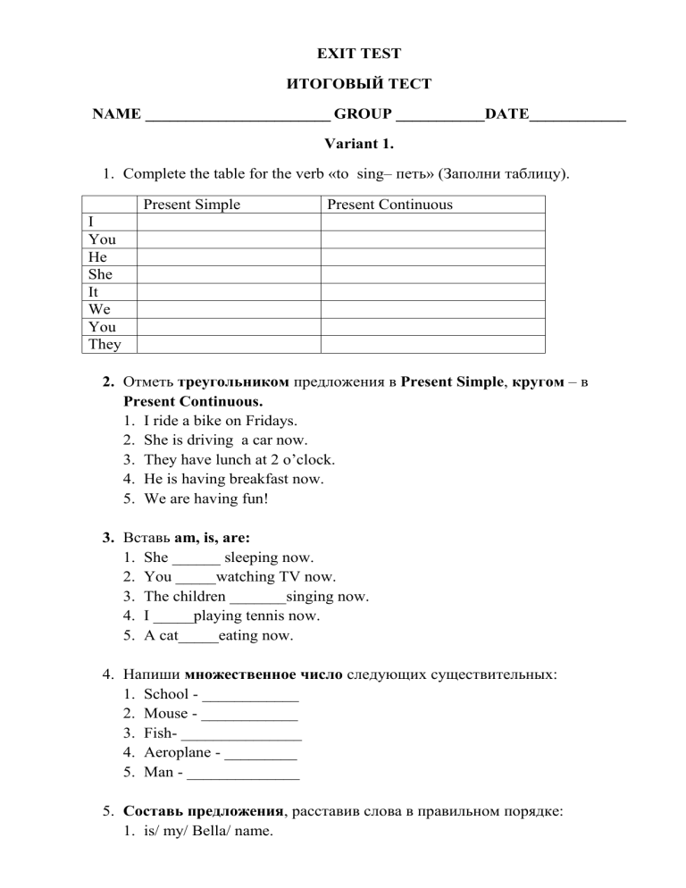 EXIT TEST ИТОГОВЫЙ ТЕСТ NAME _______________________ GROUP ___________DATE____________ Variant 1. 1. Complete the table for the verb «to sing– петь» (Заполни таблицу). Present Simple Present Continuous I You He She It We You They 2. Отметь треугольником предложения в Present Simple, кругом – в Present Continuous. 1. I ride a bike on Fridays. 2. She is driving a car now. 3. They have lunch at 2 o’clock. 4. He is having breakfast now. 5. We are having fun! 3. Вставь am, is, are: 1. She ______ sleeping now. 2. You _____watching TV now. 3. The children _______singing now. 4. I _____playing tennis now. 5. A cat_____eating now. 4. Напиши множественное число следующих существительных: 1. School - ____________ 2. Mouse - ____________ 3. Fish- _______________ 4. Aeroplane - _________ 5. Man - ______________ 5. Составь предложения, расставив слова в правильном порядке: 1. is/ my/ Bella/ name. _________________________________________ 2. nine/ old/ I/ years/ am. _______________________________________ 3. Maths / I/ Art/ and/ like. _______________________________________ 4. food/ favourite/ is/ pizza/ my. ________________________________________ 6. Выбери правильное слово и подчеркни его: 1. I’ve got some/any water in the glass. 2. We haven’t got some/any chairs in the room. 3. Has he got some/any toys in his bedroom? 4. Can I have some/any pasta? 7. Вставь артикль а или an. 1. _______mouse 2. _______ear 3. ________desk 4. __________armchair 5. _______garden 8. Подчеркни правильное слово: 1. A dog can/ have/ has got a long tail. 2. A bird can/ have/ has sing. 3. Can/ Have/ Has rabbits got long ears? 9. Вставь предлоги at, in, on: 1. ___________Sunday 2. ___________the morning 3. ___________5 o’clock 4. ___________Tuesday 5. ___________night 10.Вставь there is или there are: 1. _________________ a fridge in the kitchen. 2. _________________three toy-soldiers in the toy box. 3. _________________a tea set and five dolls in the children’s room. 4. _________________a sofa in the living-room. 5. _________________two chairs in my bedroom. 11.Составь отрицательные предложения: 1. They like apples. - ____________________________ 2. She runs on Sundays. -________________________________ 3. We are playing soccer now - ____________________________ 12.Составь вопросительные предложения: 1. He rides a bike on Saturdays. - ________________________ 2. They fly a kite in the evening. - _________________________ 3. We are painting pictures now. - _________________________ 13.Прочитай и напиши Yes или No. Max is a nice Russian boy. He is nine. He doesn’t like to paint pictures, but he likes to play computer games. Max likes to go to school. His favourite subject is Maths. Max has got a ball. He likes to go to the park and play soccer there. Max likes to visit his grandpa. He visits his grandpa on Fridays. They play and read books. Max likes to eat. His favourite food is pizza. He doesn’t like soup. 1. Max is from Russia. __________ 2. Max is 10. __________ 3. Max likes to paint pictures. __________ 4. Max visits his grandpa on Fridays. __________ 5. They fly a kite. __________ 6. Max likes to eat. __________ 7. His favourite food is sausages. __________ 14.Замени слова, выделенные жирным шрифтом на his, her, its. 1. Mum’s bag __________ 2. My sister’s doll________ 3. His dog’s toy__________ 4. Grandpa’s table________ 5. Tim’s mouse____________ 15.* Напиши о себе все, что можешь. (имя, возраст, что любишь и умеешь, любимая еда, игрушка, животное, что у тебя есть и нет, любимый предмет в школе и т.д.) EXIT TEST. YEAR 3. ИТОГОВЫЙ ТЕСТ. 3 класс. NAME _______________________________________CLASS___________DATE____________ Variant 2. 1. Complete the table for the verb «to jump – прыгать». Present Simple Present Continuous I You He She It We You They 2. Отметь треугольником предложения в Present Simple, кругом – в Present Continuous. 1. He watches TV in the evening. 2. They are playing tennis now. 3. I visit my grandma on Saturdays. 4. She is eating an apple now. 5. We like to paint pictures. 3. Вставь am, is, are: 1. Polina ______flying a kite now. 2. You _____ riding a bike now. 3. My little brother _____sleeping now. 4. I _____going to bed now. 5. We ______having lunch now. 4. Напиши множественное число следующих существительных: 1. Leg - ___________ 2. Sheep - _________ 3. Tooth - _________ 4. Elephant - ________________ 5. Woman - _________________ 5. Составь предложения, расставив слова в правильном порядке: 1. ten/ old/ years/ am/ I. ________________________________________ 2. is/ name/ Sam/ my. _________________________________________ 3. favourite/ is/ Sunday/ day/ my. _______________________________________________________ 4. like/ History/ English/ and/ I. __________________________________________ 6. Выбери правильное слово и подчеркни его: 1. They’ve got some/any vegetables in the fridge. 2. Can I have some/any chocolate cake? 3. Have you got some/any sausages in the lunch box? 4. She hasn’t got some/any flowers in her garden. 7. Вставь артикль а или an. 1. ______ruler 2. ______school 3. ______elephant 4. ______aeroplane 5. ______computer 8. Подчеркни правильное слово: 1. Cats can/ have/ has climb. 2. Can/ have/ has your parrot got a long tail? 3