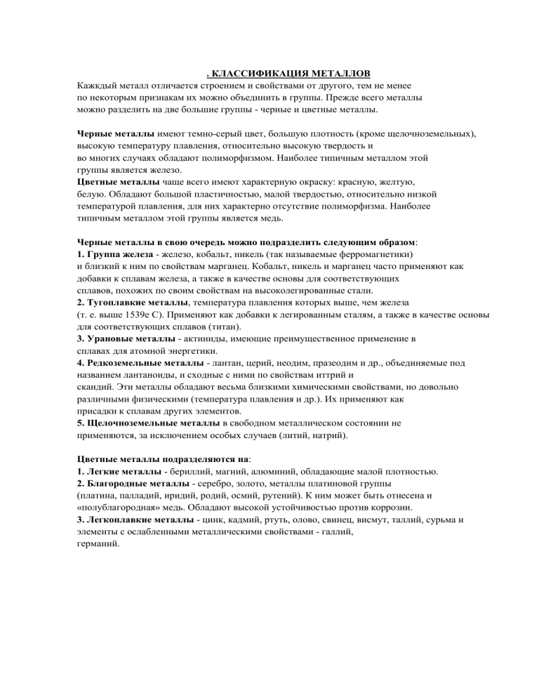 . КЛАССИФИКАЦИЯ МЕТАЛЛОВ Кажкдый металл отличается строением и свойствами от другого, тем не менее по некоторым признакам их можно объединить в группы. Прежде всего металлы можно разделить на две большие группы - черные и цветные металлы. Черные металлы имеют темно-серый цвет, большую плотность (кроме щелочноземельных), высокую температуру плавления, относительно высокую твердость и во многих случаях обладают полиморфизмом. Наиболее типичным металлом этой группы является железо. Цветные металлы чаще всего имеют характерную окраску: красную, желтую, белую. Обладают большой пластичностью, малой твердостью, относительно низкой температурой плавления, для них характерно отсутствие полиморфизма. Наиболее типичным металлом этой группы является медь. Черные металлы в свою очередь можно подразделить следующим образом: 1. Группа железа - железо, кобальт, никель (так называемые ферромагнетики) и близкий к ним по свойствам марганец. Кобальт, никель и марганец часто применяют как добавки к сплавам железа, а также в качестве основы для соответствующих сплавов, похожих по своим свойствам на высоколегированные стали. 2. Тугоплавкие металлы, температура плавления которых выше, чем железа (т. е. выше 1539е С). Применяют как добавки к легированным сталям, а также в качестве основы для соответствующих сплавов (титан). 3. Урановые металлы - актиниды, имеющие преимущественное применение в сплавах для атомной энергетики. 4. Редкоземельные металлы - лантан, церий, неодим, празеодим и др., объединяемые под названием лантаноиды, и сходные с ними по свойствам иттрий и скандий. Эти металлы обладают весьма близкими химическими свойствами, но довольно различными физическими (температура плавления и др.). Их применяют как присадки к сплавам других элементов. 5. Щелочноземельные металлы в свободном металлическом состоянии не применяются, за исключением особых случаев (литий, натрий). Цветные металлы подразделяются на: 1. Легкие металлы - бериллий, магний, алюминий, обладающие малой плотностью. 2. Благородные металлы - серебро, золото, металлы платиновой группы (платина, палладий, иридий, родий, осмий, рутений). К ним может быть отнесена и «полублагородная» медь. Обладают высокой устойчивостью против коррозии. 3. Легкоплавкие металлы - цинк, кадмий, ртуть, олово, свинец, висмут, таллий, сурьма и элементы с ослабленными металлическими свойствами - галлий, германий.