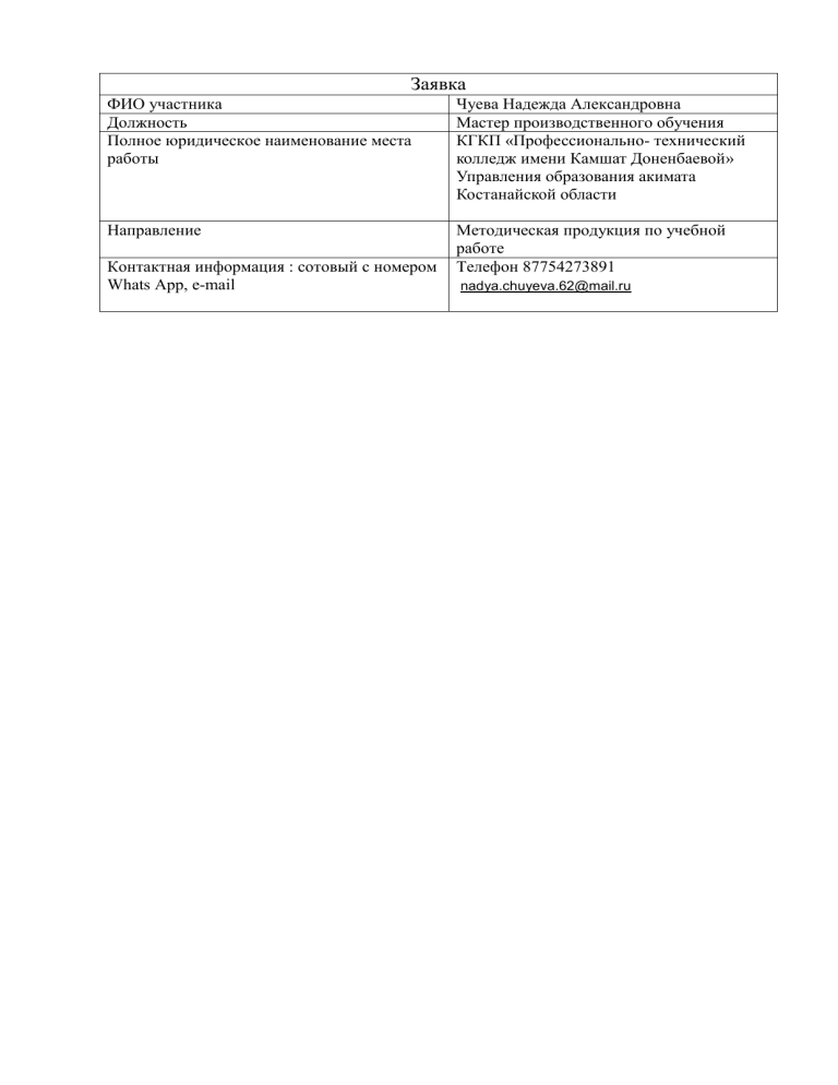 Заявка ФИО участника Должность Полное юридическое наименование места работы Чуева Надежда Александровна Мастер производственного обучения КГКП «Профессионально- технический колледж имени Камшат Доненбаевой» Управления образования акимата Костанайской области Направление Методическая продукция по учебной работе Телефон 87754273891 Контактная информация : сотовый с номером Whats App, e-mail nadya.chuyeva.62@mail.ru Костанай облысы әкімдігі білім басқармасының «Кәмшат Дөненбаева атындағы кәсіптіктехникалық колледж» КМҚК КГКП «Профессионально- технический колледж имени Камшат Доненбаевой» Управления образования акимата Костанайской области Методическая разработка урока производственного обучения Наименование модуля /дисциплины ПМ01. Выполнение первичной и тепловой кулинарной обработки продуктов с использованием различных способов Тема урока: Приготовление блюда « Шницель из капусты» Разработала Чуева Н.А. мастер производственного обучения _ КГКП «Профессионально-технический колледж имени Камшат Доненбаевой» (наименование организации образования) План учебного занятия Приготовление блюда «Шницель капустный» Оформление ,подача, требования качества (тема занятия) Наименование модуля /дисциплины_ ПМ01. Выполнение первичной и тепловой кулинарной обработки продуктов с использованием различных способов Подготовил педагог: ________________________________________ "__" _____________ 1. Общие сведения Курс, группа __________________ Тип занятия :Урок комбинированный 2. Цель, задачи : Научить самостоятельному (пользуясь инструкционно-технологической картой) приготовлению блюда, оформлению, подаче. Осуществлять контроль за технологическим процессом. Задачи: Усвоение знаний, полученных на уроках «Технологии приготовления пищи» прививать у студентов интерес к профессии ;развивать умение излагать мысли развивать умение самостоятельно работать 3. Ожидаемые результаты: Готовить блюда из овощей согласно инструкционнотехнологическим картам, осуществлять контроль за технологическим процессом. 4. Необходимые ресурсы: Сборник рецептур блюд, карточки-задания, ноутбук, дидактические материалы, филфорд, презентация, интерактивная доска. 5. Ход занятия Ход занятий Организационный момент (3мин) Цель: подготовить учащихся к работе Действие педагога Проверка явки обучающихся на урок, внешнего вида с учетом санитарных требований Проверка наличия дневников Назначение дежурных Действие студента Староста сдает рапорт о готовности к уроку, причинах отсутствия обучающихся, санитарном состоянии Вводный инструктаж : Цель: создание у обучающихся полного и развернутого представления учебнопроизводственного процесса, его условиях, средствах, способах контроля и самоконтроля Ознакомление с темой программы Сообщение цели урока Озвучивает название профессионального модуля программы Записывает на доске тему программы Мотивация учебной деятельности: Мастер предлагает узнать при помощи ребуса тему урока Вообще шницель – это мясное блюдо. Мясо нарезается тонко и хорошо обжаривается. Обучающиеся внимательно слушают, делают записи в дневник производственного обучения Ресурсы Разгадывают ребус Презентация, Вегетарианцы решили придумать свой шницель, который назвали капустным. Капуста вообще частый гость на многих столах, хоть в праздничные дни, а то и просто в будничные. Она сочна