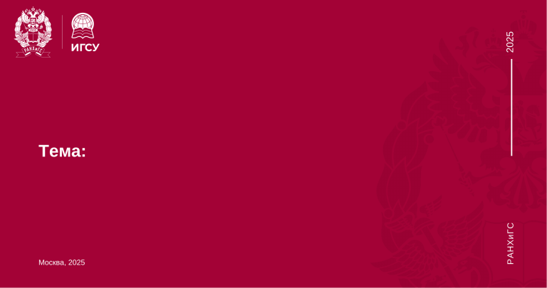 2025 Москва, 2025 РАНХиГС Тема: 2 Ключевые исторические факты о регионе Текст 2025 3 Символика региона (герб, флаг, гимн, столица) Текст 2025 4 Географическое положение региона Текст 2025 5 Роль региона в контексте испытаний и побед России Текст 2025 6 Демография региона Текст 2025 7 Приоритетные задачи развития региона Текст 2025 8 Основные сложности развития региона Текст 2025 9 Использованные источники информации 2025 2025 РАНХиГС СПАСИБО ЗА ВНИМАНИЕ!