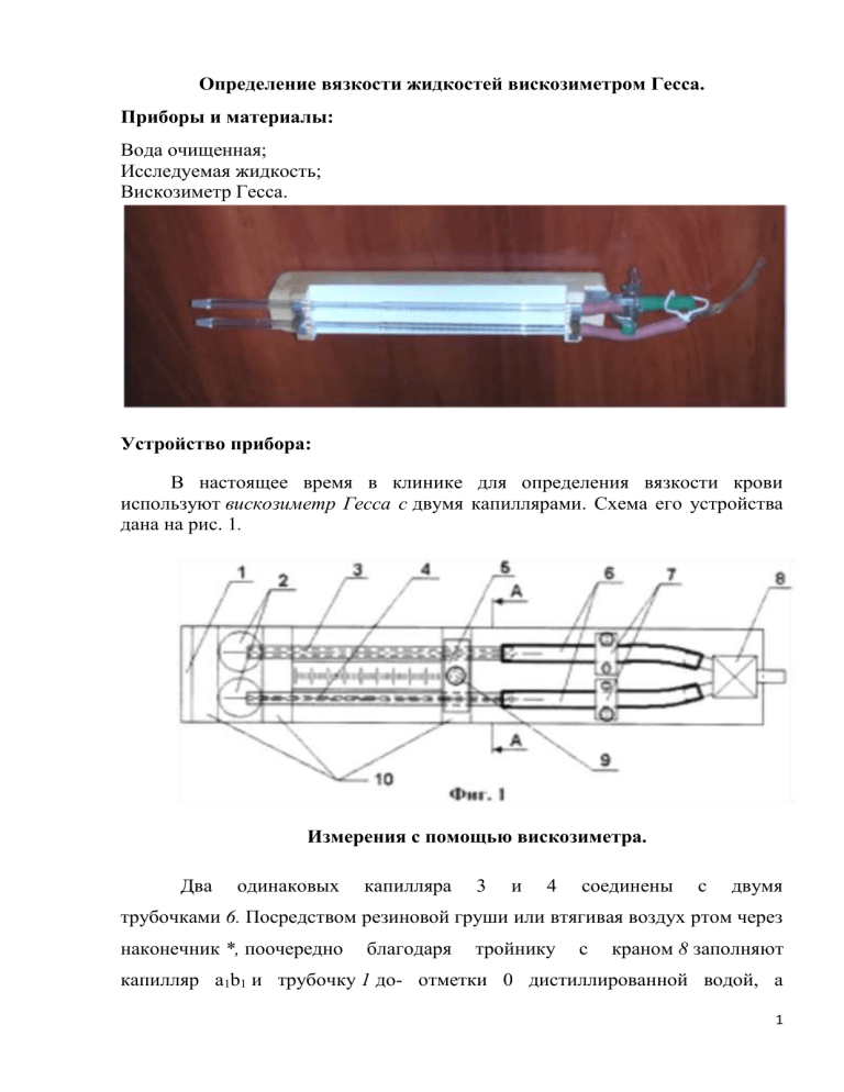 Определение вязкости жидкостей вискозиметром Гесса. Приборы и материалы: Вода очищенная; Исследуемая жидкость; Вискозиметр Гесса. Устройство прибора: В настоящее время в клинике для определения вязкости крови используют вискозиметр Гесса с двумя капиллярами. Схема его устройства дана на рис. 1. Измерения с помощью вискозиметра. Два одинаковых капилляра 3 и 4 соединены с двумя трубочками 6. Посредством резиновой груши или втягивая воздух ртом через наконечник *, поочередно благодаря тройнику с краном 8 заполняют капилляр a1b1 и трубочку 1 до- отметки 0 дистиллированной водой, а 1 капилляр а2,b2 и трубочку 2 до отметки 0 — исследуемой жидкостью. После этого теми же способами (Посредством резиновой груши или втягивая воздух ртом через наконечник *), одновременно перемещают обе жидкости до тех пор, пока исследуемая жидкость не достигнет цифры 1, а вода — другой отметки в своей трубке. Рабочая формула метода: Так как условия протекания воды и крови одинаковы, то объемы наполнения трубок 1 и 2 будут различными вследствие того, что вязкости этих жидкостей неодинаковы. Характер течения жидкости по трубам описывается формулой Пуазейля: Q= 𝝅𝒓𝟒 ∙∆𝑷 м3 𝟖𝜼𝓵 [ ], с (1) где r- радиус трубы, ∆𝑃- разность давления на концах трубы, 𝜂динамическая вязкость жидкости, ℓ- длина трубы. Хотя исследуемая жидкость (кровь) и является неньютоновской жидкостью, используем с некоторым приближением формулу Пуазейля (1) и запишем очевидную пропорцию: Qв/Qк= ηк/ηв (2) Учитывая, что общий объем V жидкости при равномерном ее течении связан с Q формулой V — Qt, где t — время, вместо (1) получаем Vв/Vк = ηк/ηв (3) где Vк — объем крови в трубке 2 от отметки 0 до отметки 1; Vв -объем воды в трубке 1 от отметки 0 до отметки, полученной при измерении; ηк и ηв — соответственно вязкость крови и воды. Отношение вязкости крови и вязкости воды при той же температуре называют относительной вязкостью крови. В вискозиметре Гесса объем крови всегда одинаков, а объем воды отсчитывают по делениям на трубке 1, поэтому непосредственно получают значение относительной вязкости крови. Для удобства отсчета сечения 2 трубок 1 и 2 делают различными так, что, несмотря на разные объемы крови и воды, их уровни в трубках будут примерно одинаковы. Вязкость крови человека в норме 4-5 мПа-с, при патологии колеблется от 1,7-22,9 мПа-с, что сказывается на скорости оседания эритроцитов (СОЭ). Венозная кровь обладает несколько большей вязкостью, чем артериальная. При тяжелой физической работе увеличивается вязкость крови. Некоторые инфекционные заболевания увеличивают вязкость, другие же, например, брюшной тиф и туберкулез – уменьшают. Результаты измерений. Таблица. Результаты измерений. № 1 2 3 Vв Vв/Vк ηк/ηв ηк Среднее значение Абсолютная погрешность Vв -объем воды в трубке 1 от отметки 0 до отметки, полученной при измерении; Vк — объем крови в трубке 2 от отметки 0 до отметки 1; ηк/ηв- относительная вязкость крови ηк- динамическая вязкость крови. ηв- динамическая вязкость воды при температуре 200С (табличное значение). Вывод: Записать ответ в видеОтносительная вязкость (исследуемой жидкости) равна: ηк/ηв=ηк/ηв ± ∆ηк/ηв. Динамическая вязкость (исследуемой жидкости) равна: ηк =ηк ± ∆ηк. Указать температуру измерений. 3 4 Работа и настройка вискозиметра Гесса (ВК-4) 5