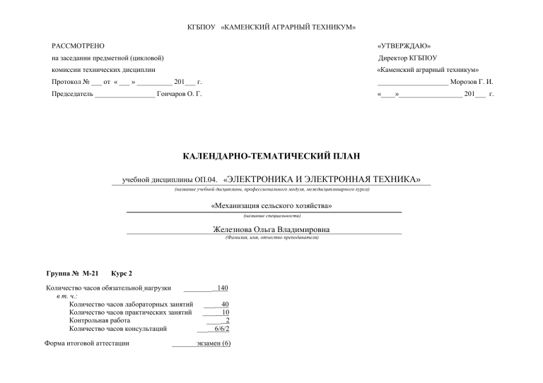 КГБПОУ «КАМЕНСКИЙ АГРАРНЫЙ ТЕХНИКУМ» РАССМОТРЕНО «УТВЕРЖДАЮ» на заседании предметной (цикловой) Директор КГБПОУ комиссии технических дисциплин «Каменский аграрный техникум» Протокол № ___ от « ___ » __________ 201___ г. ____________________ Морозов Г. И. Председатель _________________ Гончаров О. Г. «____»__________________ 201___ г. КАЛЕНДАРНО-ТЕМАТИЧЕСКИЙ ПЛАН учебной дисциплины ОП.04. «ЭЛЕКТРОНИКА И ЭЛЕКТРОННАЯ ТЕХНИКА» (название учебной дисциплины, профессионального модуля, междисциплинарного курса) «Механизация сельского хозяйства» (название специальности) Железнова Ольга Владимировна (Фамилия, имя, отчество преподавателя) Группа № М-21 Курс 2 Количество часов обязательной нагрузки ________ 140 в т. ч.: Количество часов лабораторных занятий ___ 40 Количество часов практических занятий ____ 10 Контрольная работа ____ 2 Количество часов консультаций ___ 6/6/2 Форма итоговой аттестации экзамен (6) № заня тия Наименование разделов и тем Кол-во часов Плановые сроки обучения Вид занятия (тип урока) Наглядные пособия Задания для обучающихся 01 02 03 04 05 06 07 сентябрь Урок изучение нового материала плакаты, схемы, модели, макеты стр. 6-10 [5] Комбинированный урок Комбинированный урок Комбинированный урок плакаты, схемы, модели, макеты плакаты, схемы, модели, макеты плакаты, схемы, модели, макеты стр. 10-16 [5] РАЗДЕЛ 1. ЭЛЕКТРОТЕХНИКА 1. Тема 1.1. Электрическое поле. Основные характеристики электрического поля. 1. Основные характеристики электрического поля. 2. Основные параметры электрического поля. 3. Закон Кулона. 2 2. Проводники и диэлектрики в электрическом поле. 2 сентябрь 3. Пробой диэлектрика. Электроемкость. 2 сентябрь 4. Конденсаторы. 2 сентябрь 2 сентябрь Комбинированный урок плакаты, схемы, модели, макеты стр. 28-31 [5] 2 сентябрь Комбинированный урок плакаты, схемы, модели, макеты стр. 31-34 [5] 2 сентябрь Комбинированный урок плакаты, схемы, модели, макеты стр. 34-38 [5] 1. Конденсаторы. 2. Соединение конденсаторов. 3. Энергия электрического поля заряженного конденсатора. 5. Тема 1.2. Электрические цепи постоянного тока. Элементы электрической цепи. Элементы электрической цепи. Параметры электрической цепи. Характеристики электрической цепи. Пассивные и активные элементы электрической цепи. 5. Элементы схемы электрической цепи: ветвь, узел, контур. 6. Электродвижущая сила (ЭДС). 1. 2. 3. 4. 6. Электрическое сопротивление. 1. Электрическое сопротивление. 2. Зависимость электрического сопротивления от температуры. 7. Электрическая проводимость. 1. Электрическая проводимость. 2. Резистор. стр. 18-22 [5] стр. 22-26 [5] 3. Соединение резисторов. 8. Основы расчета электрической цепи постоянного тока. 2 октябрь 9. Законы Ома и Кирхгофа. 2 октябрь 10. Опытная проверка свойств последовательного соединения резисторов. 2 октябрь 11. Опытная проверка свойств параллельного соединения резисторов. 2 октябрь Лабораторная работа 12. Расчет электрических цепей при смешанном соединении резисторов. 2 октябрь Практическое занятие 13. Расчет электрических цепей при смешанном соединении резисторов. 2 октябрь Практическое занятие 14. Расчет электрических цепей при смешанном соединении резисторов. 2 октябрь Практическое занятие 15. Расчет электрических цепей при смешанном соединении резисторов. 2 октябрь Практическое занятие 16. Расчет электрических цепей при смешанном соединении резисторов. 2 октябрь Практическое занятие 2 октябрь Урок изучение нового материа