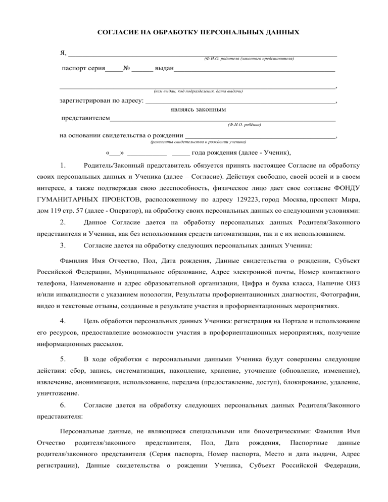 СОГЛАСИЕ НА ОБРАБОТКУ ПЕРСОНАЛЬНЫХ ДАННЫХ Я, ___________________________________________________________________________ (Ф.И.О. родителя (законного представителя) паспорт серия_____№ ______ выдан_____________________________________________ _____________________________________________________________________________, (кем выдан, код подразделения, дата выдачи) зарегистрирован по адресу: _____________________________________________________, являясь законным представителем_______________________________________________________________ (Ф.И.О. ребёнка) на основании свидетельства о рождении __________________________________________, (реквизиты свидетельства о рождении ученика) «___» ___________ _____ года рождения (далее - Ученик), Родитель/Законный представитель обязуется принять настоящее Согласие на обработку 1. своих персональных данных и Ученика (далее – Согласие). Действуя свободно, своей волей и в своем интересе, а также подтверждая свою дееспособность, физическое лицо дает свое согласие ФОНДУ ГУМАНИТАРНЫХ ПРОЕКТОВ, расположенному по адресу 129223, город Москва, проспект Мира, дом 119 стр. 57 (далее - Оператор), на обработку своих персональных данных со следующими условиями: Данное Согласие дается на обработку персональных данных Родителя/Законного 2. представителя и Ученика, как без использования средств автоматизации, так и с их использованием. Согласие дается на обработку следующих персональных данных Ученика: 3. Фамилия Имя Отчество, Пол, Дата рождения, Данные свидетельства о рождении, Субъект Российской Федерации, Муниципальное образование, Адрес электронной почты, Номер контактного телефона, Наименование и адрес образовательной организации, Цифра и буква класса, Наличие ОВЗ и/или инвалидности с указанием нозологии, Результаты профориентационных диагностик, Фотографии, видео и текстовые отзывы, созданные в результате участия в профориентационных мероприятиях. Цель обработки персональных данных Ученика: регистрация на Портале и использование 4. его ресурсов, предоставление возможности участия в профориентационных мероприятиях, получение информационных рассылок. В ходе обработки с персональными данными Ученика будут совершены следующие 5. действия: сбор, запись, систематизация, накопление, хранение, уточнение (обновление, изменение), извлечение, анонимизация, использование, передача (предоставление, доступ), блокирование, удаление, уничтожение. Согласие дается на обработку следующих персональных данных Родителя/Законного 6. представителя: Персональные данные, не являющиеся специальными или биометрическими: Фамилия Имя Отчество родителя/законного представителя, Пол, Дата рождения, Паспортные данные родителя/законного представителя (Серия паспорта, Номер паспорта, Место и дата выдачи, Адрес регистрации), Данные свидетельства о рождении Ученика, Субъект Российской Федерации, Муниципальное образование, Адрес электронной почты, Номер контактного телефона, Фотографии, видео и текстовые отзывы, созданные в результате участия в профориентационных мероприятиях. 7. Цель обработки персональных данных Родителя/Законного представителя: регистрация на Портале и использование его ресурсов, предоставление возможности участия в профориентационных мероприятиях, получение информационных рассылок. 8. В ходе обработки с персональными данными Родителя/Законного будут совершены следующие действия: сбор, запись, систематизация, накопление, хранение, уточнение (обновление, изменение), извлечение, ан