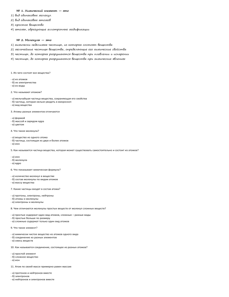 № 1. Химический элемент — это 1) вид одинаковых молекул 2) вид одинаковых атомов 3) простое вещество 4) атомы, образующие аллотропные модификации № 2. Молекулы — это 1) химически неделимые частицы, из которых состоят вещества 2) мельчайшие частицы вещества, определяющие его химические свойства 3) частицы, до которых разрушаются вещества при плавлении и испарении 4) частицы, до которых разрушаются вещества при химических явлениях 1. Из чего состоят все вещества? - а) из атомов - б) из электричества - в) из воды 2. Что называют атомом? - а) мельчайшая частица вещества, сохраняющая его свойства - б) частицу, которая нельзя увидеть в микроскоп - в) вид вещества 3. Атомы разных элементов отличаются - а) формой - б) массой и зарядом ядра - в) цветом 4. Что такое молекула? - а) вещество из одного атома - б) частица, состоящая из двух и более атомов - в) ион 5. Как называется частица вещества, которая может существовать самостоятельно и состоит из атомов? - а) ион - б) молекула - в) ядро 6. Что показывает химическая формула? - а) количество молекул в веществе - б) состав молекулы по видам атомов - в) массу вещества 7. Какие частицы входят в состав атома? - а) протоны, электроны, нейтроны - б) атомы и молекулы - в) электроны и молекулы 8. Чем отличаются молекулы простых веществ от молекул сложных веществ? - а) простые содержат один вид атомов, сложные – разные виды - б) простые больше по размеру - в) сложные содержат только один вид атомов 9. Что такое элемент? - а) химически чистое вещество из атомов одного вида - б) соединение из разных элементов - в) смесь веществ 10. Как называется соединение, состоящее из разных атомов? - а) простой элемент - б) сложное вещество - в) ион 11. Атом по своей массе примерно равен массам - а) протонов и нейтронов вместе - б) электронов - в) нейтронов и электронов вместе 13. Что показывает относительная атомная масса? - а) число протонов в ядре - б) сколько раз масса атома больше 1/12 массы атома углерода - в) количество электронов в атоме 14. Почему молекулы непрерывно движутся? - а) из-за температуры и кинетической энергии - б) из-за электричества - в) потому что вещество стареет 15.как называется модель вещества, которая объясняет его состав из атомов и молекул и их движение? - а) атомно-молекулярное учение - б) теория гравитации - в) биологическая теория 1. Вещества, образованные атомами одного и того же элемента — а) сложные б) одноатомные в) простые г) разные 2. Для разделения смеси алюминиевых и железных опилок можно использовать: а) выпаривание б) фильтрование в) отстаивание г) действие магнитом 4. Вода — вещество а) сложное б) совсем несложное в) простое г) аллотропное 5. По строению вещества делят на а) молярные и немолярные б) электронные и ионные в) атомные и неатомные г) молекулярные и немолекулярные 7. Для разделения смеси подсолнечного масла с водой необходимо использовать а) прибор для фильтрования б) прибор для дистилляции в) делительную воронку г) спиртовку 8. Химический элемент — это а) вид молекул б) вид модели молекулы в) определённый вид веществ г) определённый вид атомов 10. АМУ — а) атом, молекула, ученый б) аллотропия молекулярного учения в) атомно-молекулярное учение г) адсорбция молекул уксуса 11. Для выделения поваренной соли из ее раствора в воде можно использовать: а) выпаривание и кристаллизацию б) дистилляцию в) отстаивание г) фильтрование 12. Укажите все естественн