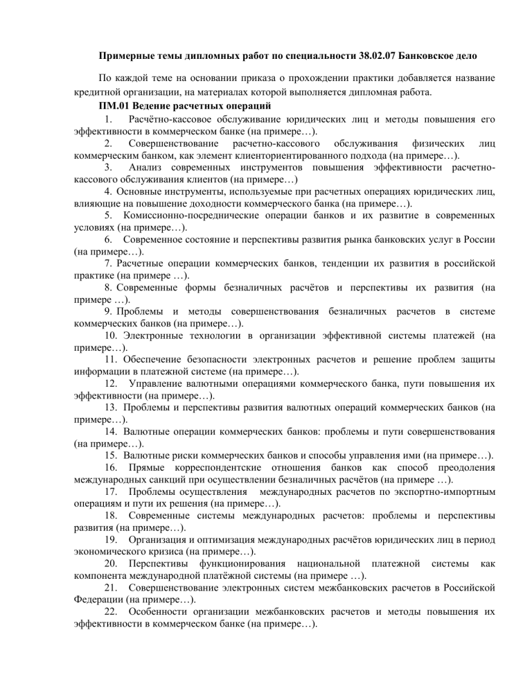 Примерные темы дипломных работ по специальности 38.02.07 Банковское дело По каждой теме на основании приказа о прохождении практики добавляется название кредитной организации, на материалах которой выполняется дипломная работа. ПМ.01 Ведение расчетных операций 1. Расчётно-кассовое обслуживание юридических лиц и методы повышения его эффективности в коммерческом банке (на примере…). 2. Совершенствование расчетно-кассового обслуживания физических лиц коммерческим банком, как элемент клиенториентированного подхода (на примере…). 3. Анализ современных инструментов повышения эффективности расчетнокассового обслуживания клиентов (на примере…) 4. Основные инструменты, используемые при расчетных операциях юридических лиц, влияющие на повышение доходности коммерческого банка (на примере…). 5. Комиссионно-посреднические операции банков и их развитие в современных условиях (на примере…). 6. Современное состояние и перспективы развития рынка банковских услуг в России (на примере…). 7. Расчетные операции коммерческих банков, тенденции их развития в российской практике (на примере …). 8. Современные формы безналичных расчётов и перспективы их развития (на примере …). 9. Проблемы и методы совершенствования безналичных расчетов в системе коммерческих банков (на примере…). 10. Электронные технологии в организации эффективной системы платежей (на примере…). 11. Обеспечение безопасности электронных расчетов и решение проблем защиты информации в платежной системе (на примере…). 12. Управление валютными операциями коммерческого банка, пути повышения их эффективности (на примере…). 13. Проблемы и перспективы развития валютных операций коммерческих банков (на примере…). 14. Валютные операции коммерческих банков: проблемы и пути совершенствования (на примере…). 15. Валютные риски коммерческих банков и способы управления ими (на примере…). 16. Прямые корреспондентские отношения банков как способ преодоления международных санкций при осуществлении безналичных расчётов (на примере …). 17. Проблемы осуществления международных расчетов по экспортно-импортным операциям и пути их решения (на примере…). 18. Современные системы международных расчетов: проблемы и перспективы развития (на примере…). 19. Организация и оптимизация международных расчётов юридических лиц в период экономического кризиса (на примере…). 20. Перспективы функционирования национальной платежной системы как компонента международной платёжной системы (на примере …). 21. Совершенствование электронных систем межбанковских расчетов в Российской Федерации (на примере…). 22. Особенности организации межбанковских расчетов и методы повышения их эффективности в коммерческом банке (на примере…). 23. Эффективность межбанковских расчетов и способы их совершенствования (на примере…). 24. Совершенствование системы дистанционного банковского обслуживания как перспективного направления деятельности банка (на примере…). 25. Анализ дистанционного банковского обслуживания юридических лиц (на примере …). 26. Значение системы дистанционного обслуживания в эффективном осуществлении расчетных операций корпоративных клиентов (на примере…). 27. Оптимизация дистанционного банковское обслуживания расчетных операций физических лиц в коммерческом банке (на примере…). 28. Банковские карты как инструме