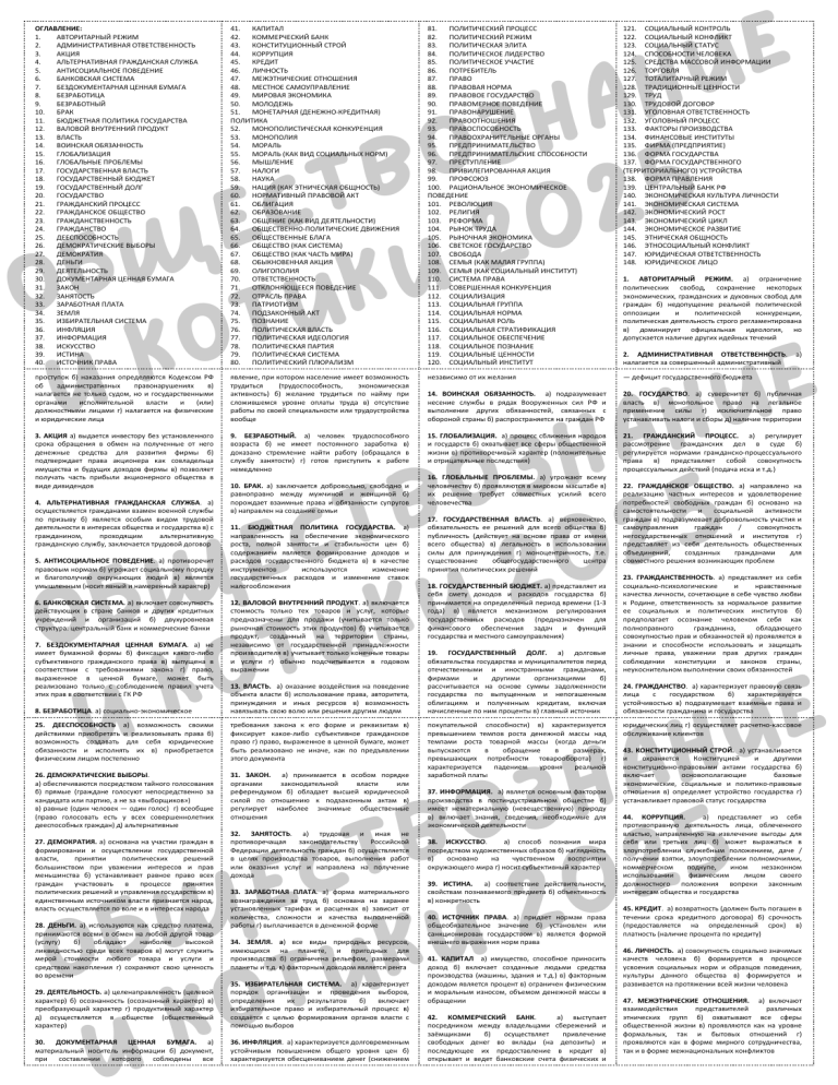 ОГЛАВЛЕНИЕ: 1. АВТОРИТАРНЫЙ РЕЖИМ 2. АДМИНИСТРАТИВНАЯ ОТВЕТСТВЕННОСТЬ 3. АКЦИЯ 4. АЛЬТЕРНАТИВНАЯ ГРАЖДАНСКАЯ СЛУЖБА 5. АНТИСОЦИАЛЬНОЕ ПОВЕДЕНИЕ 6. БАНКОВСКАЯ СИСТЕМА 7. БЕЗДОКУМЕНТАРНАЯ ЦЕННАЯ БУМАГА 8. БЕЗРАБОТИЦА 9. БЕЗРАБОТНЫЙ 10. БРАК 11. БЮДЖЕТНАЯ ПОЛИТИКА ГОСУДАРСТВА 12. ВАЛОВОЙ ВНУТРЕННИЙ ПРОДУКТ 13. ВЛАСТЬ 14. ВОИНСКАЯ ОБЯЗАННОСТЬ 15. ГЛОБАЛИЗАЦИЯ 16. ГЛОБАЛЬНЫЕ ПРОБЛЕМЫ 17. ГОСУДАРСТВЕННАЯ ВЛАСТЬ 18. ГОСУДАРСТВЕННЫЙ БЮДЖЕТ 19. ГОСУДАРСТВЕННЫЙ ДОЛГ 20. ГОСУДАРСТВО 21. ГРАЖДАНСКИЙ ПРОЦЕСС 22. ГРАЖДАНСКОЕ ОБЩЕСТВО 23. ГРАЖДАНСТВЕННОСТЬ 24. ГРАЖДАНСТВО 25. ДЕЕСПОСОБНОСТЬ 26. ДЕМОКРАТИЧЕСКИЕ ВЫБОРЫ 27. ДЕМОКРАТИЯ 28. ДЕНЬГИ 29. ДЕЯТЕЛЬНОСТЬ 30. ДОКУМЕНТАРНАЯ ЦЕННАЯ БУМАГА 31. ЗАКОН 32. ЗАНЯТОСТЬ 33. ЗАРАБОТНАЯ ПЛАТА 34. ЗЕМЛЯ 35. ИЗБИРАТЕЛЬНАЯ СИСТЕМА 36. ИНФЛЯЦИЯ 37. ИНФОРМАЦИЯ 38. ИСКУССТВО 39. ИСТИНА 40. ИСТОЧНИК ПРАВА 41. КАПИТАЛ 42. КОММЕРЧЕСКИЙ БАНК 43. КОНСТИТУЦИОННЫЙ СТРОЙ 44. КОРРУПЦИЯ 45. КРЕДИТ 46. ЛИЧНОСТЬ 47. МЕЖЭТНИЧЕСКИЕ ОТНОШЕНИЯ 48. МЕСТНОЕ САМОУПРАВЛЕНИЕ 49. МИРОВАЯ ЭКОНОМИКА 50. МОЛОДЕЖЬ 51. МОНЕТАРНАЯ (ДЕНЕЖНО-КРЕДИТНАЯ) ПОЛИТИКА 52. МОНОПОЛИСТИЧЕСКАЯ КОНКУРЕНЦИЯ 53. МОНОПОЛИЯ 54. МОРАЛЬ 55. МОРАЛЬ (КАК ВИД СОЦИАЛЬНЫХ НОРМ) 56. МЫШЛЕНИЕ 57. НАЛОГИ 58. НАУКА 59. НАЦИЯ (КАК ЭТНИЧЕСКАЯ ОБЩНОСТЬ) 60. НОРМАТИВНЫЙ ПРАВОВОЙ АКТ 61. ОБЛИГАЦИЯ 62. ОБРАЗОВАНИЕ 63. ОБЩЕНИЕ (КАК ВИД ДЕЯТЕЛЬНОСТИ) 64. ОБЩЕСТВЕННО-ПОЛИТИЧЕСКИЕ ДВИЖЕНИЯ 65. ОБЩЕСТВЕННЫЕ БЛАГА 66. ОБЩЕСТВО (КАК СИСТЕМА) 67. ОБЩЕСТВО (КАК ЧАСТЬ МИРА) 68. ОБЫКНОВЕННАЯ АКЦИЯ 69. ОЛИГОПОЛИЯ 70. ОТВЕТСТВЕННОСТЬ 71. ОТКЛОНЯЮЩЕЕСЯ ПОВЕДЕНИЕ 72. ОТРАСЛЬ ПРАВА 73. ПАТРИОТИЗМ 74. ПОДЗАКОННЫЙ АКТ 75. ПОЗНАНИЕ 76. ПОЛИТИЧЕСКАЯ ВЛАСТЬ 77. ПОЛИТИЧЕСКАЯ ИДЕОЛОГИЯ 78. ПОЛИТИЧЕСКАЯ ПАРТИЯ 79. ПОЛИТИЧЕСКАЯ СИСТЕМА 80. ПОЛИТИЧЕСКИЙ ПЛЮРАЛИЗМ 81. ПОЛИТИЧЕСКИЙ ПРОЦЕСС 82. ПОЛИТИЧЕСКИЙ РЕЖИМ 83. ПОЛИТИЧЕСКАЯ ЭЛИТА 84. ПОЛИТИЧЕСКОЕ ЛИДЕРСТВО 85. ПОЛИТИЧЕСКОЕ УЧАСТИЕ 86. ПОТРЕБИТЕЛЬ 87. ПРАВО 88. ПРАВОВАЯ НОРМА 89. ПРАВОВОЕ ГОСУДАРСТВО 90. ПРАВОМЕРНОЕ ПОВЕДЕНИЕ 91. ПРАВОНАРУШЕНИЕ 92. ПРАВООТНОШЕНИЯ 93. ПРАВОСПОСОБНОСТЬ 94. ПРАВООХРАНИТЕЛЬНЫЕ ОРГАНЫ 95. ПРЕДПРИНИМАТЕЛЬСТВО 96. ПРЕДПРИНИМАТЕЛЬСКИЕ СПОСОБНОСТИ 97. ПРЕСТУПЛЕНИЕ 98. ПРИВИЛЕГИРОВАННАЯ АКЦИЯ 99. ПРОФСОЮЗ 100. РАЦИОНАЛЬНОЕ ЭКОНОМИЧЕСКОЕ ПОВЕДЕНИЕ 101. РЕВОЛЮЦИЯ 102. РЕЛИГИЯ 103. РЕФОРМА 104. РЫНОК ТРУДА 105. РЫНОЧНАЯ ЭКОНОМИКА 106. СВЕТСКОЕ ГОСУДАРСТВО 107. СВОБОДА 108. СЕМЬЯ (КАК МАЛАЯ ГРУППА) 109. СЕМЬЯ (КАК СОЦИАЛЬНЫЙ ИНСТИТУТ) 110. СИСТЕМА ПРАВА 111. СОВЕРШЕННАЯ КОНКУРЕНЦИЯ 112. СОЦИАЛИЗАЦИЯ 113. СОЦИАЛЬНАЯ ГРУППА 114. СОЦИАЛЬНАЯ НОРМА 115. СОЦИАЛЬНАЯ РОЛЬ 116. СОЦИАЛЬНАЯ СТРАТИФИКАЦИЯ 117. СОЦИАЛЬНОЕ ОБЕСПЕЧЕНИЕ 118. СОЦИАЛЬНОЕ ПОЗНАНИЕ 119. СОЦИАЛЬНЫЕ ЦЕННОСТИ 120. СОЦИАЛЬНЫЙ ИНСТИТУТ 121. СОЦИАЛЬНЫЙ КОНТРОЛЬ 122. СОЦИАЛЬНЫЙ КОНФЛИКТ 123. СОЦИАЛЬНЫЙ СТАТУС 124. СПОСОБНОСТИ ЧЕЛОВЕКА 125. СРЕДСТВА МАССОВОЙ ИНФОРМАЦИИ 126. ТОРГОВЛЯ 127. ТОТАЛИТАРНЫЙ РЕЖИМ 128. ТРАДИЦИОННЫЕ ЦЕННОСТИ 129. ТРУД 130. ТРУДОВОЙ ДОГОВОР 131. УГОЛОВНАЯ ОТВЕТСТВЕННОСТЬ 132. УГОЛОВНЫЙ ПРОЦЕСС 133. ФАКТОРЫ ПРОИЗВОДСТВА 134. ФИНАНСОВЫЕ ИНСТИТУТЫ 135. ФИРМА (ПРЕДПРИЯТИЕ) 136. ФОРМА ГОСУДАРСТВА 137. ФОРМА ГОСУДАРСТВЕННОГО (ТЕРРИТОРИАЛЬНОГО) УСТРОЙСТВА 138. ФОРМА ПРАВЛЕНИЯ 139. ЦЕНТРАЛЬНЫЙ БАНК РФ 140. ЭКОНОМИЧЕСКАЯ КУЛЬТУРА ЛИЧНОСТИ 141. ЭКОНОМИЧЕСКАЯ СИСТЕМА 142. ЭКОНОМИЧЕСКИЙ РОСТ 143. ЭКОНОМИЧЕСКИЙ ЦИКЛ 144. ЭКОНОМИЧЕСКОЕ РАЗВИТИЕ 145. ЭТНИЧЕСКАЯ ОБЩНОСТЬ 146. ЭТНОСОЦИАЛЬНЫЙ КОНФЛИКТ 147. ЮРИДИЧЕСКАЯ ОТВЕТСТВЕННОСТЬ 148. ЮРИДИЧЕСКОЕ ЛИЦО проступок б) наказания определяются Кодексом РФ об административных правонарушениях 