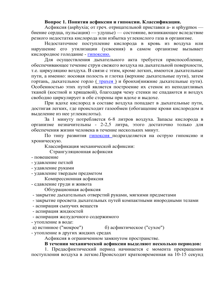 Вопрос 1. Понятия асфиксии и гипоксии. Классификация. Асфиксия (asphyxia; от греч. отрицательной приставки a- и sphygmos — биение сердца, пульсация) — удушье) — состояние, возникающее вследствие резкого недостатка кислорода или избытка углекислого газа в организме. Недостаточное поступление кислорода в кровь из воздуха или нарушение его утилизации (усвоения) в самом организме вызывает кислородное голодание - гипоксию. Для осуществления дыхательного акта требуется приспособление, обеспечивающее течение струи свежего воздуха на дыхательной поверхности, т.е. циркуляцию воздуха. В связи с этим, кроме легких, имеются дыхательные пути, а именно: носовая полость и глотка (верхние дыхательные пути), затем гортань, дыхательное горло ( трахея ) и бронхи(нижние дыхательные пути). Особенностью этих путей является построение их стенок из неподатливых тканей (костной и хрящевой), благодаря чему стенки не спадаются и воздух свободно циркулирует в обе стороны при вдохе и выдохе. При вдохе кислород в составе воздуха попадает в дыхательные пути, достигая легких, где происходит газообмен (обогащение крови кислородом и выделение из нее углекислоты). За 1 минуту потребляется 6-8 литров воздуха. Запасы кислорода в организме незначительны - 2-2,5 литра, этого достаточно только для обеспечения жизни человека в течение нескольких минут. По типу развития гипоксия подразделяется на острую гипоксию и хроническую. Классификация механической асфиксии: Странгуляционная асфиксия - повешение - удавление петлей - удавление руками - удавление твердым предметом Компрессионная асфиксия - сдавление груди и живота Обтурационная асфиксия - закрытие дыхательных отверстий руками, мягкими предметами - закрытие просвета дыхательных путей компактными инородными телами - аспирация сыпучих веществ - аспирация жидкостей - аспирация желудочного содержимого - утопление в воде: а) истинное ("мокрое") б) асфиктическое ("сухое") - утопление в других жидких средах Асфиксия в ограниченном замкнутом пространстве. В течении механической асфиксии выделяют несколько периодов: 1. Предасфиктический период начинается с момента прекращения поступления воздуха в легкие.Происходит кратковременная на 10-15 секунд остановка дыхания, иногда сопровождающаяся беспорядочными движениями. В этот период пока никаких признаков асфиксии еще не наблюдается. 2. Период инспираторной одышки. Недостаток кислорода в организме активирует инспираторный отдел дыхательного центра продолговатого мозга и приводит к возникновению инспираторной одышки. Наблюдается утрата сознания и выраженная гиподинамия, которые исключают самоспасение.в связи с накоплением углекислоты и недостатка кислорода дыхание учащается, становится бурным. Вначале вдохи становятся более глубокими и продолжительными, чем выдохи (инспираторная одышка). Примерно, через минуту инспираторная одышка сменяется экспираторной, при этом начинают преобладать выдыхательные движения. К концу экспираторной одышки наблюдаются сильные клонические судороги, часто сопровождающиеся выделением кала и мочи. 3. Период экспираторной одышки. Накопление в организме углекислоты приводит к активации экспираторного отдела дыхательного центра продолговатого мозга и экспираторной одышке. Возбуждение гладкой мускулатуры в сочетании с расслаблением сфинкте