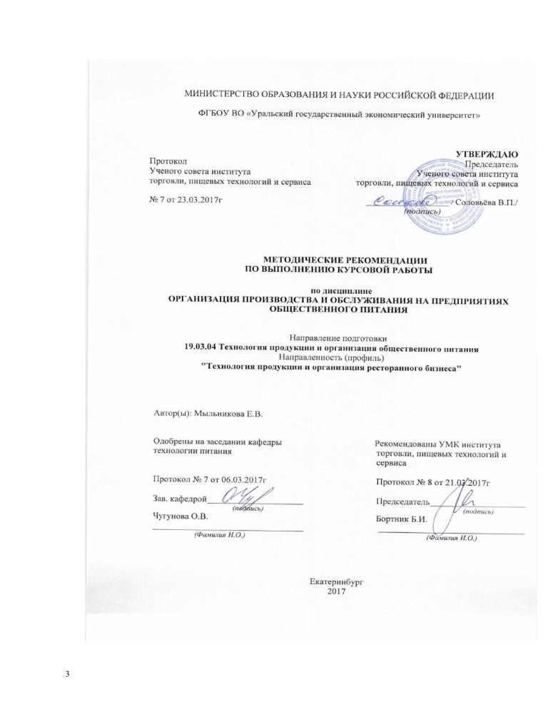 3 1. Цель и задачи курсовой работы Цель выполнения курсовой работы по дисциплине «Организация производства и обслуживания» на предприятиях общественного питания, расширение и закрепление полученных студентами теоретических знаний в процессе изучения курса. Задачи провести анализ организации деятельности предприятия, выделив его сильные и слабые стороны; разработать рекомендации по улучшению различных сфер деятельности предприятия; определить пути повышения эффективности производства и обслуживания на предприятии; развить навыки практического применения полученных знаний и умения решать актуальные проблемы; формирование творческого подхода к решению производственных и социальных задач. курсовая работа пишется по конкретному объекту (предприятию, организации любой формы собственности). проводя анализ деятельности предприятия, необходимо раскрыть и объективно оценить имеющиеся недостатки, обобщив передовой опыт, подготовить практические предложения по совершенствованию организации снабжения, внедрению новых технологических процессов, совершенствованию обслуживания и мобилизации внутренних резервов предприятия. на основе собранной статистической, экономической и оперативной информации о деятельности предприятия (организации) произвести расчет возможной экономической эффективности от внедрения предлагаемых мероприятий или определить их социальную значимость. необходимо использовать нормативные, статистические и справочные материалы, данные маркетинговых исследований, анкетирования, интервьюирования, фото и хронометража. 2. СТРУКТУРА КУРСОВОЙ РАБОТЫ Общий объем записи 35-40 страниц Содержание работы: Реферат Введение 5% Аналитический обзор 25-30% Экспериментальная часть 65-60% Заключение 5% Список использованных источников Приложения 4 В реферате описывают цель и новизну работы, эффективность работы; задачи курсовой работы, количество таблиц и рисунков, ключевые слова. Во введении обосновывается актуальность выбранной темы, современное состояние отрасли; проблемы которые могут быть решены в данной работе. В аналитическом разделе дается краткий обзор литературы по вопросам темы, излагаются теоретические положения по источникам отечественной и зарубежной литературы. Литература для обзора должна быть подобрана тщательно, так как она является теоретическим обоснованием необходимости решения конкретной проблемы. Необходимо изучить периодические издания: «Питание и общество», «Коммерческий вестник», «Товарный рынок», «Торговое оборудование», «Ресторанное дело», «Информационные бюллетени». В экспериментальной части разделе дается организационноэкономическая характеристика предприятия (организации). Она содержит наименование предприятия, состояние и перспективы его развития. Дается характеристика района деятельности, контингента потребителей, организационная и управленческая структура, форма собственности, численность работников, показатели хозяйственной деятельности. Для выявления тенденции развития желательно привести данные за несколько лет. В экспериментальном разделе необходимо привести анализ современного состояния объекта исследования по элементам его деятельности: типов предприятий и их соотношения по числу мест на территории города (района), организации снабжения продо