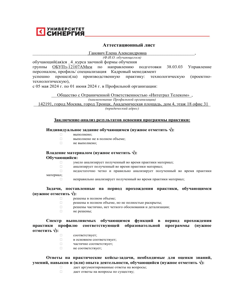 Аттестационный лист ________________________ Ганович Елена Александровна_____________________, (Ф.И.О. обучающегося) обучающий(ая)ся _4_курса заочной формы обучения группы ОБУПз-12107АМкм по направлению подготовки 38.03.03 Управление персоналом, профиль/ специализация Кадровый менеджмент успешно прошел(ла) производственную практику: технологическую (проектнотехнологическую), с 05 мая 2024 г. по 01 июня 2024 г. в Профильной организации: __ Общество с Ограниченной Ответственностью «Интеграл Телеком»_, (наименование Профильной организации) __142191, город Москва, город Троицк, Академическая площадь, дом 4, этаж 18 офис 31_ (юридический адрес) Заключение-анализ результатов освоения программы практики: Индивидуальное задание обучающимся (нужное отметить ): выполнено; выполнено не в полном объеме; не выполнено; Владение материалом (нужное отметить ): Обучающийся: материал; умело анализирует полученный во время практики материал; анализирует полученный во время практики материал; недостаточно четко и правильно анализирует полученный во время практики неправильно анализирует полученный во время практики материал; Задачи, поставленные на период прохождения практики, обучающимся (нужное отметить ): решены в полном объеме; решены в полном объеме, но не полностью раскрыты; решены частично, нет четкого обоснования и детализации; не решены; Спектр выполняемых обучающимся функций в период прохождения практики профилю соответствующей образовательной программы (нужное отметить ): соответствует; в основном соответствует; частично соответствует; не соответствует; Ответы на практические кейсы-задачи, необходимые для оценки знаний, умений, навыков и (или) опыта деятельности, обучающийся (нужное отметить ): дает аргументированные ответы на вопросы; дает ответы на вопросы по существу; дает ответы на вопросы не по существу; не может ответить на вопросы; Оформление обучающимся отчета по практике (нужное отметить ): отчет о прохождении практики оформлен правильно; отчет о прохождении практики оформлен с незначительными недостатками; отчет о прохождении практики оформлен с недостатками; отчет о прохождении практики оформлен неверно; Аттестуемый продемонстрировал владение следующими профессиональными компетенциями: Код Содержание компетенции Уровень освоения обучающимся (нужное отметить )* Профессиональные компетенции ОПК-2 ОПК-3 ОПК-4 Способен осуществлять сбор, обработку и анализ данных для решения задач в сфере управления персоналом; Способен разрабатывать и осуществлять мероприятия, направленные на реализацию стратегии управления персоналом, обеспечивать их документационное сопровождение и оценивать организационные и социальные последствия; Способен применять современные технологии и методы оперативного управления персоналом, вести документационное сопровождение и учет; высокий средний низкий высокий средний низкий высокий средний низкий Примечание: Высокий уровень – обучающийся уверенно демонстрирует готовность и способность к самостоятельной профессиональной деятельности не только в стандартных, но и во внештатных ситуациях. Средний уровень – обучающийся выполняет все виды профессиональной деятельности в стандартных ситуациях уверенно, добросовестно, эффективно. Низкий уровень – при выполнении профессиональной деятельности обучающийся нуждается во в