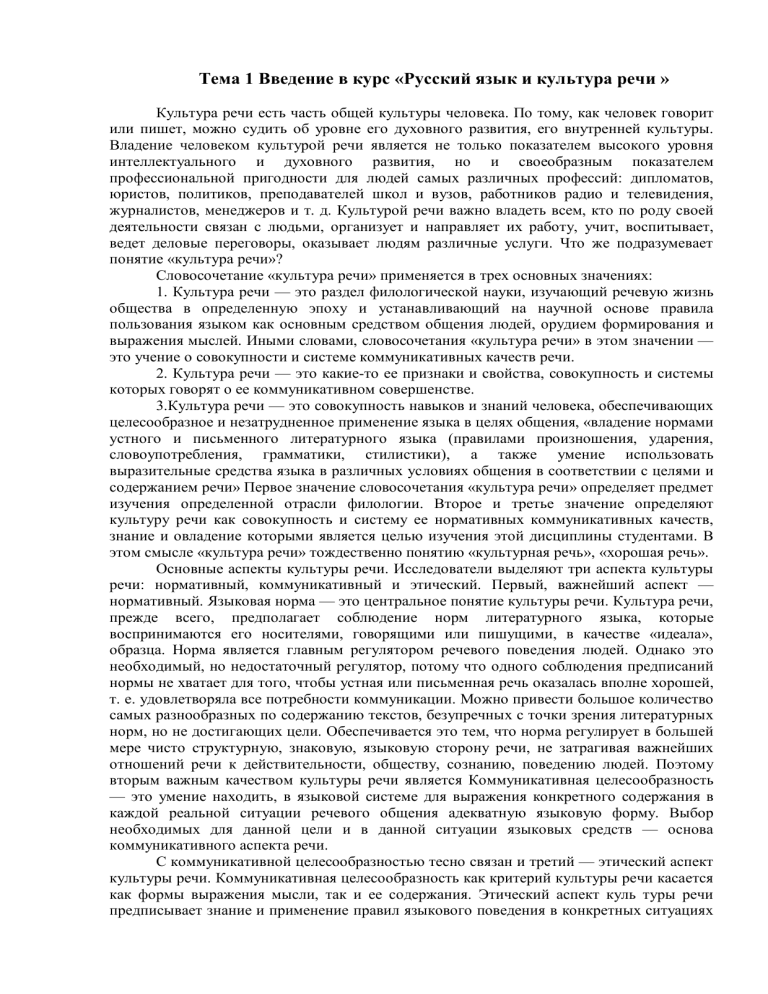 Тема 1 Введение в курс «Русский язык и культура речи » Культура речи есть часть общей культуры человека. По тому, как человек говорит или пишет, можно судить об уровне его духовного развития, его внутренней культуры. Владение человеком культурой речи является не только показателем высокого уровня интеллектуального и духовного развития, но и своеобразным показателем профессиональной пригодности для людей самых различных профессий: дипломатов, юристов, политиков, преподавателей школ и вузов, работников радио и телевидения, журналистов, менеджеров и т. д. Культурой речи важно владеть всем, кто по роду своей деятельности связан с людьми, организует и направляет их работу, учит, воспитывает, ведет деловые переговоры, оказывает людям различные услуги. Что же подразумевает понятие «культура речи»? Словосочетание «культура речи» применяется в трех основных значениях: 1. Культура речи — это раздел филологической науки, изучающий речевую жизнь общества в определенную эпоху и устанавливающий на научной основе правила пользования языком как основным средством общения людей, орудием формирования и выражения мыслей. Иными словами, словосочетания «культура речи» в этом значении — это учение о совокупности и системе коммуникативных качеств речи. 2. Культура речи — это какие-то ее признаки и свойства, совокупность и системы которых говорят о ее коммуникативном совершенстве. 3.Культура речи — это совокупность навыков и знаний человека, обеспечивающих целесообразное и незатрудненное применение языка в целях общения, «владение нормами устного и письменного литературного языка (правилами произношения, ударения, словоупотребления, грамматики, стилистики), а также умение использовать выразительные средства языка в различных условиях общения в соответствии с целями и содержанием речи» Первое значение словосочетания «культура речи» определяет предмет изучения определенной отрасли филологии. Второе и третье значение определяют культуру речи как совокупность и систему ее нормативных коммуникативных качеств, знание и овладение которыми является целью изучения этой дисциплины студентами. В этом смысле «культура речи» тождественно понятию «культурная речь», «хорошая речь». Основные аспекты культуры речи. Исследователи выделяют три аспекта культуры речи: нормативный, коммуникативный и этический. Первый, важнейший аспект — нормативный. Языковая норма — это центральное понятие культуры речи. Культура речи, прежде всего, предполагает соблюдение норм литературного языка, которые воспринимаются его носителями, говорящими или пишущими, в качестве «идеала», образца. Норма является главным регулятором речевого поведения людей. Однако это необходимый, но недостаточный регулятор, потому что одного соблюдения предписаний нормы не хватает для того, чтобы устная или письменная речь оказалась вполне хорошей, т. е. удовлетворяла все потребности коммуникации. Можно привести большое количество самых разнообразных по содержанию текстов, безупречных с точки зрения литературных норм, но не достигающих цели. Обеспечивается это тем, что норма регулирует в большей мере чисто структурную, знаковую, языковую сторону речи, не затрагивая важнейших отношений речи к действительности, обществу, сознанию, поведению людей. Поэтому вторым важным качес