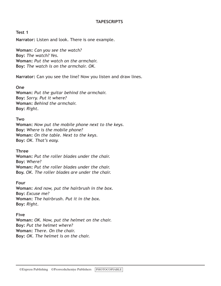 TAPESCRIPTS Test 1 Narrator: Listen and look. There is one example. Woman: Can you see the watch? Boy: The watch? Yes. Woman: Put the watch on the armchair. Boy: The watch is on the armchair. OK. Narrator: Can you see the line? Now you listen and draw lines. One Woman: Put the guitar behind the armchair. Boy: Sorry. Put it where? Woman: Behind the armchair. Boy: Right. Two Woman: Now put the mobile phone next to the keys. Boy: Where is the mobile phone? Woman: On the table. Next to the keys. Boy: OK. That’s easy. Three Woman: Put the roller blades under the chair. Boy: Where? Woman: Put the roller blades under the chair. Boy. OK. The roller blades are under the chair. Four Woman: And now, put the hairbrush in the box. Boy: Excuse me? Woman: The hairbrush. Put it in the box. Boy: Right. Five Woman: OK. Now, put the helmet on the chair. Boy: Put the helmet where? Woman: There. On the chair. Boy: OK. The helmet is on the chair. ©Express Publishing ©Prosveshcheniye Publishers PHOTOCOPIABLE Test 2 Narrator: Look at the pictures. What does Sandy do every day? Listen and look. There is one example. Man: What do you do on Mondays, Sandy? Girl: On Mondays I have a guitar lesson. Narrator: Can you see the line? On Mondays, Sandy has a guitar lesson. Now you listen and draw lines. Man: And what do you do on Wednesdays? Girl: Well, on Wednesdays I usually go to the park with my friends. Man: What about Fridays? Girl: On Fridays I play tennis. Man: Oh, that’s nice! And what about Tuesdays? Girl: Every Tuesday I go shopping. And on Saturdays I usually clean my room. Man: So what do you do on Sundays, then? Girl: Sunday is my favourite day of the week! I always go to the cinema! It’s great! I always have a lot of fun on Sundays! Test 3 Narrator: Listen and look. There is one example. Girl: Dad, I’m hungry. Man: Well, let’s make something to eat. What about an omelette? Girl: Mmm! That sounds good! Can I help you, Dad? Man: Sure! Have we got any eggs? Girl: Let me see. Yes, we have. Narrator: Can you see the tick? Now you listen and put a tick or a cross. Man: OK! Have we got any butter? Girl: Butter? Let me see. No, there isn’t any butter. Man: That’s OK! We’ve got some olive oil over there. Can you pass me the olive oil, please? Girl: Sure, Dad. Here you are! Man: Thanks. Are there any onions? Girl: Onions? No, there aren’t any onions. Sorry. Man: That’s OK! Have we got any potatoes? Girl: Hmm. Potatoes? Let me see. Sorry, no, but we’ve got a lot of cheese! Man: Great! I love cheese! I think we’re ready! Let’s make our omelette! ©Express Publishing ©Prosveshcheniye Publishers PHOTOCOPIABLE Test 4 Narrator: Listen and number. One Sound of birds chirping Two Sound of sheep Three Sound of chicken Four Sound of cow Five Sound of elephant Six Sound of cat Test 5 Narrator: Listen and find the bank robber. Police officer: One of you three was at the bank this morning. Now tell me the truth Sid, where were you? Sid: Well, I wasn’t at the bank. I was at the hospital with my brother. I’m not a robber. It wasn’t me! Police officer: And what about you, Fred? Fred: It wasn’t me. I was in the park with my dog! I wasn’t at the bank, honestly! Police officer: Hmm. And Bert? What’s your story? Bert: Well, I was at the cinema this morning. Police officer: The cinema? Bert: Yes, I was there with my friend, Gus. Police officer: But there wasn’t a film on at the cinema this morning. Bert: Oh, wasn’t there? Police officer: No, Bert, there wasn’t. You were at the bank, weren’t you? Come with me, Bert. Bert: Oh, all right! Test 6 Narrator: Listen and circle. Teacher: What did you do last Saturday, children? Brian? Did you listen to music? Boy: No, Miss. I played soccer with my friends. Teacher: Well done, Brian. ©Express Publishing ©Prosveshcheniye Publishers PHOTOCOPIABLE Narrator: Can you see the circle? Now you listen and circle. Teacher: What about you Susan? What did you do? Girl: I helped my mum. I washed the dishes and I walked the dog. Teacher: Excellent, Susan. You are a good girl. Teacher: Jenny? Girl: I visited my friend, Miss. It was great! Teacher: What about you, Danny? What did you do? Boy: I wanted to play basketball with my friends, Miss, but I cleaned my room. Teacher: We must clean our rooms, Danny. Teacher: What about you, Betty? Girl: I cooked dinner. Teacher: You cooked dinner? Wow! Teacher: Jason? What did you do? Boy: I played the violin, Miss. Teacher: Excellent, Jason. Test 7 Narrator: Where did Anna go last Saturday? Man: Do you go out a lot with Anna? Girl: Yes, on Saturdays and Sundays. Man: Were you with Anna last Saturday? Girl: No, I wasn’t. Man: Did she go to the cinema, then? Girl: No, Anna wanted to go to the funfair, but it was very cold so she went to the zoo with her mum and dad. Narrator: Can you see the tick? Now you listen and tick the box. One What did Billy buy? Man: Billy likes shopping for clothes. Did he buy a jacket? Girl: No, he didn’t. Man: Did he buy a new guitar? Girl: He wanted to buy a new guitar, but he bought a book about music. ©Express Publishing ©Prosveshcheniye Publishers PHOTOCOPIABLE Two Who came to Tina’s party? Man: Did you have fun at Tina’s party? Girl: Yes, I did. Guess who came to the party! Man: Tina’s grandma? Girl: No. Man: Tina’s cousin? Girl: No. A clown! Man: Wow! What a party! Three How many people were at the school party? Man: How many people were at the school party? 100? Girl: No. Our school is small. We invited 60 people, but some of them didn’t come. Man: How many of them came? Girl: 42. But that’s fine. Four Where did Tom go last weekend? Man: Did Tom go to the museum last weekend? Girl: No, he didn’t. Man: Did he go swimming? Girl: He went to the park with Steve. They played football. Five What did Helen cook for dinner? Man: Did Helen cook chicken for dinner? Girl: No, she didn’t. Man: Did she cook burgers? Girl: No, she cooked fish. Test 8 Narrator: Listen and match. Ma