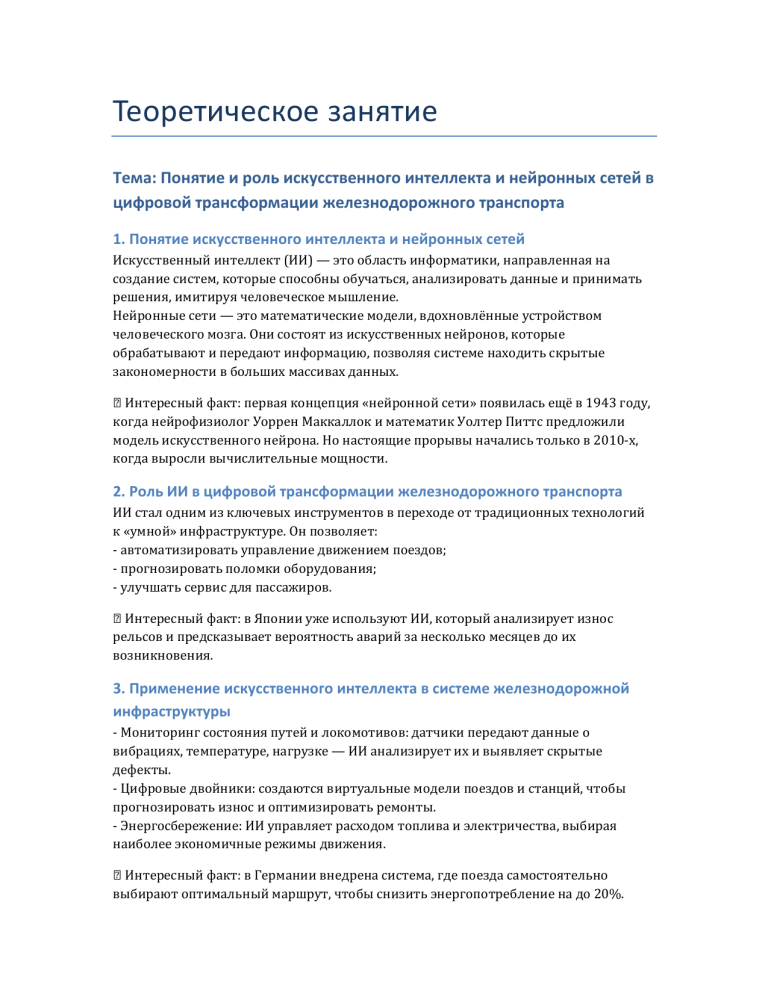 Теоретическое занятие Тема: Понятие и роль искусственного интеллекта и нейронных сетей в цифровой трансформации железнодорожного транспорта 1. Понятие искусственного интеллекта и нейронных сетей Искусственный интеллект (ИИ) — это область информатики, направленная на создание систем, которые способны обучаться, анализировать данные и принимать решения, имитируя человеческое мышление. Нейронные сети — это математические модели, вдохновлённые устройством человеческого мозга. Они состоят из искусственных нейронов, которые обрабатывают и передают информацию, позволяя системе находить скрытые закономерности в больших массивах данных. � Интересный факт: первая концепция «нейронной сети» появилась ещё в 1943 году, когда нейрофизиолог Уоррен Маккаллок и математик Уолтер Питтс предложили модель искусственного нейрона. Но настоящие прорывы начались только в 2010-х, когда выросли вычислительные мощности. 2. Роль ИИ в цифровой трансформации железнодорожного транспорта ИИ стал одним из ключевых инструментов в переходе от традиционных технологий к «умной» инфраструктуре. Он позволяет: - автоматизировать управление движением поездов; - прогнозировать поломки оборудования; - улучшать сервис для пассажиров. � Интересный факт: в Японии уже используют ИИ, который анализирует износ рельсов и предсказывает вероятность аварий за несколько месяцев до их возникновения. 3. Применение искусственного интеллекта в системе железнодорожной инфраструктуры - Мониторинг состояния путей и локомотивов: датчики передают данные о вибрациях, температуре, нагрузке — ИИ анализирует их и выявляет скрытые дефекты. - Цифровые двойники: создаются виртуальные модели поездов и станций, чтобы прогнозировать износ и оптимизировать ремонты. - Энергосбережение: ИИ управляет расходом топлива и электричества, выбирая наиболее экономичные режимы движения. � Интересный факт: в Германии внедрена система, где поезда самостоятельно выбирают оптимальный маршрут, чтобы снизить энергопотребление на до 20%. 4. Оптимизация транспортного потока и железнодорожных путей Использование ИИ позволяет распределять поезда по путям так, чтобы снизить пробки и задержки. Нейронные сети анализируют расписания, спрос пассажиров и даже погодные условия. � Интересный факт: в Китае ИИ управляет движением на крупнейшей в мире высокоскоростной железнодорожной сети (40 000 км путей). Система способна корректировать расписание поездов в реальном времени при любых сбоях. 5. Улучшение безопасности с помощью интеллектуальных систем - ИИ анализирует видеопотоки с камер на станциях и переездах, выявляя опасные ситуации (например, людей или автомобили на путях). - Предсказание аварийных ситуаций по данным датчиков. - Система автоматического торможения, основанная на ИИ, предотвращает столкновения. � Интересный факт: в Великобритании тестируется система ИИ, которая определяет усталость машиниста по мимике лица и предупреждает его о необходимости отдыха. 6. Повышение эффективности пассажирского транспорта с помощью ИИ - Персонализированные сервисы: ИИ может предлагать пассажирам удобные маршруты, билеты и пересадки. - Анализ пассажиропотока: прогноз загруженности вагонов, распределение ресурсов. - Умные чат-боты и голосовые помощники для справки и продажи билетов. � Интересный факт: в Мо