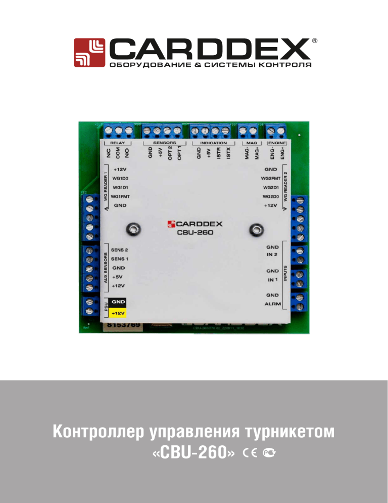 К СОДЕРЖАНИЮ Контроллер управления турникетом «CBU-260» Контроллер управления турникетом «CBU-260» К СОДЕРЖАНИЮ СОДЕРЖАНИЕ Контроллер управления турникетом «CBU-260» Нажмите на текст для перехода в нужный раздел 1 НАЗНАЧЕНИЕ . . . . . . . . . . . . . . . . . . . . . . . . . . . . . . . . . . . . . . . . . . . . . . . . . . . 2 2 ТЕХНИЧЕСКИЕ ХАРАКТЕРИСТИКИ . . . . . . . . . . . . . . . . . . . . . . . . . . . . . . . . . . 2 3 НАЗНАЧЕНИЕ РАЗЪЕМОВ . . . . . . . . . . . . . . . . . . . . . . . . . . . . . . . . . . . . . . . . . 3 4 ЗАПИСЬ ИДЕНТИФИКАТОРОВ. . . . . . . . . . . . . . . . . . . . . . . . . . . . . . . . . . . . . . 6 4.1 Запись идентификатора с типом «Мастер» . . . . . . . . . . . . . . . . . . . . . . . . . 6 4.2 Запись карт пользователей с помощью мастер-карты . . . . . . . . . . . . . . . . 6 5 СМЕНА ФОРМАТА СООБЩЕНИЙ . . . . . . . . . . . . . . . . . . . . . . . . . . . . . . . . . . . . 7 6 РЕЖИМЫ РАБОТЫ КОНТРОЛЛЕРА . . . . . . . . . . . . . . . . . . . . . . . . . . . . . . . . . . 7 6.1 Режим «Автономный». . . . . . . . . . . . . . . . . . . . . . . . . . . . . . . . . . . . . . . . . . . 7 6.2 Режим «Accept». . . . . . . . . . . . . . . . . . . . . . . . . . . . . . . . . . . . . . . . . . . . . . . . 7 6.3 Режим «Несанкционированный проход» . . . . . . . . . . . . . . . . . . . . . . . . . . . 8 6.4 Режим «Тревога». . . . . . . . . . . . . . . . . . . . . . . . . . . . . . . . . . . . . . . . . . . . . . . 8 7 СБРОС НАСТРОЕК КОНТРОЛЛЕРА К ЗАВОДСКИМ . . . . . . . . . . . . . . . . . . . . . 8 8 ГАРАНТИЙНЫЕ ОБЯЗАТЕЛЬСТВА . . . . . . . . . . . . . . . . . . . . . . . . . . . . . . . . . . . 8 ПРИЛОЖЕНИЯ Приложение 1. Схемы подключений . . . . . . . . . . . . . . . . . . . . . . . . . . . . . . . . . . 9 К СОДЕРЖАНИЮ Контроллер управления турникетом «CBU-260» 1 НАЗНАЧЕНИЕ Контроллер управления располагается внутри корпуса турникета и осуществляет управление его исполнительными устройствами, анализирует сигналы датчиков направления прохода, а также поддерживает подключение пульта дистанционного управления, бесконтактных считывателей и пожарной сигнализации. 2 ТЕХНИЧЕСКИЕ ХАРАКТЕРИСТИКИ Наименование характеристики Значение Напряжение питания контроллера, В 12 Номинальный потребляемый ток, А 0.3 Объем памяти для хранения идентификаторов с типом «Пользовательский», ед. 5000 Объем памяти для хранения идентификаторов с типом «Мастер», ед. 8 Интерфейс для подключения считывателей Wiegand 26/34 Средний срок службы 5 лет Диапазон температур, °С: эксплуатация транспортировка и хранение +1...+70 +1...+70 Габаритные размеры, ДхШхГ мм 115x115x20 К СОДЕРЖАНИЮ XS.12 XS.6 XS.7 XS.9 XS.8 1 NC 2 COM 3 NO 1 GND 2 +5V 3 OPT2 4 OPT1 1 GND 2 +5V 3 ISTR 4 ISTX 1 MAG2 MAG+ 1 ENG2 ENG+ Контроллер управления турникетом «CBU-260» 1 GND 2 +12V XS.10 Рисунок 2.1 Контроллер управления турникетом «CBU-260» 3 НАЗНАЧЕНИЕ РАЗЪЕМОВ Таблица 3.1 Назначение разъемов контроллера «CBU-260» Разъем XS1 Контакт Назначение GND Отрицательная линия питания считывателя WG2FMT Линия сигнала смены формата Wiegand считывателя WG2D1 Линия передачи данных по интерфейсу Wiegand D1 WG2D0 Линия передачи данных по интерфейсу Wiegand D0 +12V Линия питания считывателя 1 GND 2 IN1 XS.4 1 FORMAT 2 FW-UPD 3 M_CARD 4 H_RES 5 AUTO_MODE 6 BOOT0 7 ACCEPT 1 GND 2 ALARM XS.3 XS.1 1 GND 2 WG2FMT 3 WG2D1 4 WG2D0 5 +12V XS.5 1 GND 2 IN2 XS.2 1 +12V 2 WG1D0 3 WG1D1 4 WG1FMT 5 GND XS.11 1 SENS2 2 SENS1 3 GND 4 +5V 5 +12V К СОДЕРЖАНИЮ XS2 +12V Линия питания считывателя WG1D0 Линия передачи данных по интерфейсу Wiegand D0 WG1D1 Линия передачи данных по интерфейсу Wiegand D1 WG1FMT Линия сигнала смены формата Wiegand считывателя GND Отрицательная линия питания считывателя GND Общая шина ALARM Вход для подключения линий сигнала управления «Тревога». Активный уровень сигнала – низкий GND Общая шина IN1 Контакт для подключения линий сигнала управления «Открыть турникет в направлении №1». Активный уровень сигнала – низкий GND Общая шина IN2 Контакт для подключения линий сигнала управления «Открыть турникет в направлении 