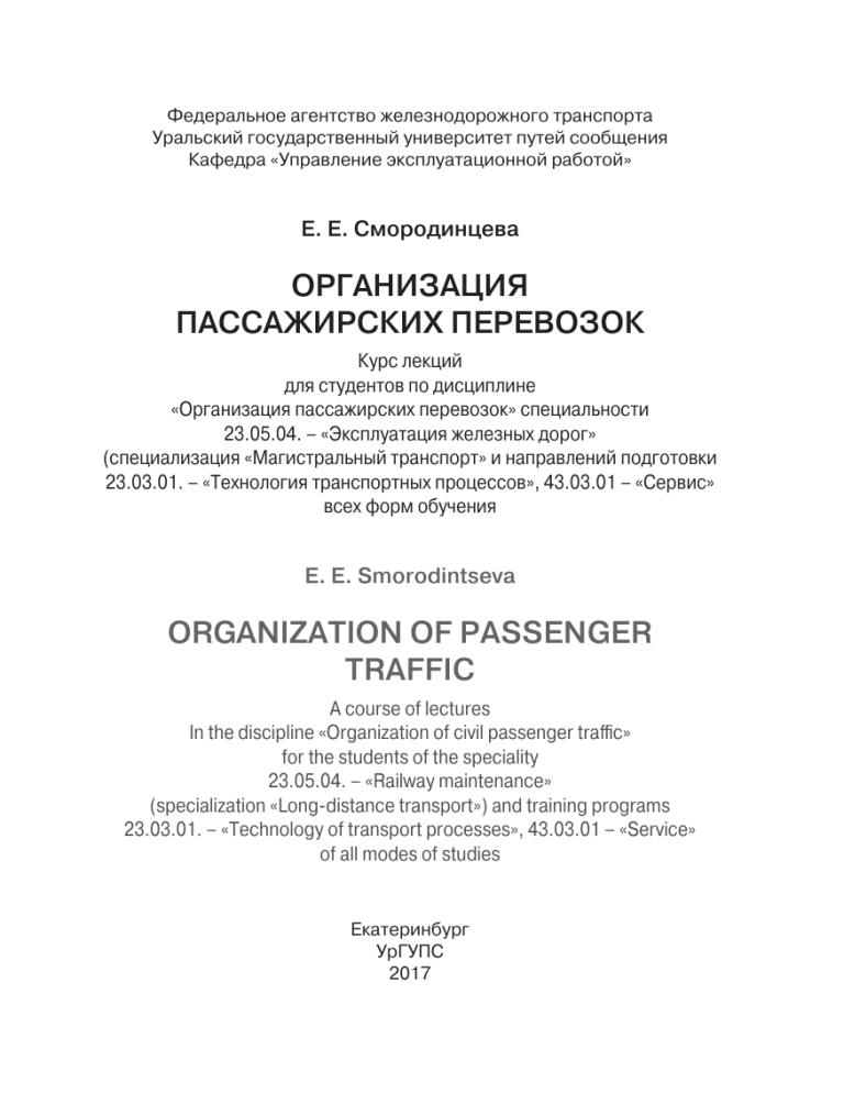 Федеральное агентство железнодорожного транспорта Уральский государственный университет путей сообщения Кафедра «Управление эксплуатационной работой» Е. Е. Смородинцева ОРГАНИЗАЦИЯ ПАССАЖИРСКИХ ПЕРЕВОЗОК Курс лекций для студентов по дисциплине «Организация пассажирских перевозок» специальности 23.05.04. – «Эксплуатация железных дорог» (специализация «Магистральный транспорт» и направлений подготовки 23.03.01. – «Технология транспортных процессов», 43.03.01 – «Сервис» всех форм обучения E. E. Smorodintseva ORGANIZATION OF passenger traffic A course of lectures In the discipline «Organization of civil passenger traffic» for the students of the speciality 23.05.04. – «Railway maintenance» (specialization «Long-distance transport») and training programs 23.03.01. – «Technology of transport processes», 43.03.01 – «Service» of all modes of studies Екатеринбург УрГУПС 2017 УДК 656.072 С51 Смородинцева, Е. Е. С51 Организация пассажирских перевозок : курс лекций / Е. Е. Смородинцева. – Екатеринбург : УрГУПС, 2017. –107, [1] с. ISBN 978-5-94614-411-7 Рассмотрены вопросы управления пассажирским комплексом, организации дальних, местных и пригородных пассажирских перевозок, организации работы пассажирских станций и вокзалов, автоматизации управления пассажирскими перевозками и сервисного обслуживания пассажиров. Курс лекций предназначен для самостоятельного освоения лекционного материала студентами всех форм обучения специальности 23.05.04 – «Эксплуатация железных дорог» и направлений подготовки 23.03.01 – «Технология транспортных процессов» (для всех профилей), 43.03.01 – «Сервис». Соответствует федеральному государственному образовательному стандарту высшего образования. There are questions of management of railway passenger service system, organization of long-distance and local passenger traffic and commutation service, management of passenger depots and buildings, automation of civil passenger traffic management and passenger maintenance service reviewed. A course of lectures is intended for self-directed learning of the lecture material by the students of all modes of study of the speciality 23.05.04 – «Railway maintenance» and training programs 23.03.01 – «Technology of transport processes» (for all programs), 43.03.01 – «Service». It satisfies Federal State Educational Standard of higher education. УДК 656.072 Издано по решению редакционно-издательского совета университета Автор: Е. Е. Смородинцева, доцент кафедры «Управление эксплуатационной работой», УрГУПС Рецензенты: Е. Н. Тимухина, профессор кафедры «Управление эксплуатационной работой», д-р техн. наук, УрГУПС Н. А. Тушин, генеральный директор транспортно-экспедиционной компании «Желдоринтеграция» © Уральский государственный университет путей сообщения (УрГУПС), 2017 Оглавление Введение . . . . . . . . . . . . . . . . . . . . . . . . . . . . . . . . . . . . . . . . . . . . . . . . . . 5 Тема 1. Основы организации пассажирских перевозок . . . . . . . . . . . . 6 1.1. Характеристика пассажирских перевозок . . . . . . . . . . . . . . . 6 1.2. Виды перевозок и классификация пассажирских поездов . . . . . . . . . . . . . . . . . . . . . . . . . . . . . . . . . . . . . . . . . . . . . . . 13 1.3. Композиция пассажирского поезда . . . . . . . . . . . . . . . . . . . 17 1.4. Особенности организации пассажирских перевозок . . . . . 21 1.5. Управление пассажирскими перевозками . . . . . . . . . . . . . . 26 1.6. Технические средства для пассажирских перевозок . . . . . 30 Тема 2. Технология работы пассажирской станции . . . . . . . . . . . . . . 33 2.1. Классификация пассажирских станций . . . . . . . . . . . . . . . 33 2.2. Устройства собственно пассажирских станций . . . . . . . . . 34 2.3. Технология работы пассажирской станции . . . . . . . . . . . . . 36 2.4. Технология обработки составов на технической станции . . . . . . . . . . . . . . . . . . . . . . . . . . . . . . . . . . . . . . . . . . . . . . . 44 Тема 3. План формирования пассажирских поездов . . . . . . . . . . . . . 45 3.1. Расчет густоты 