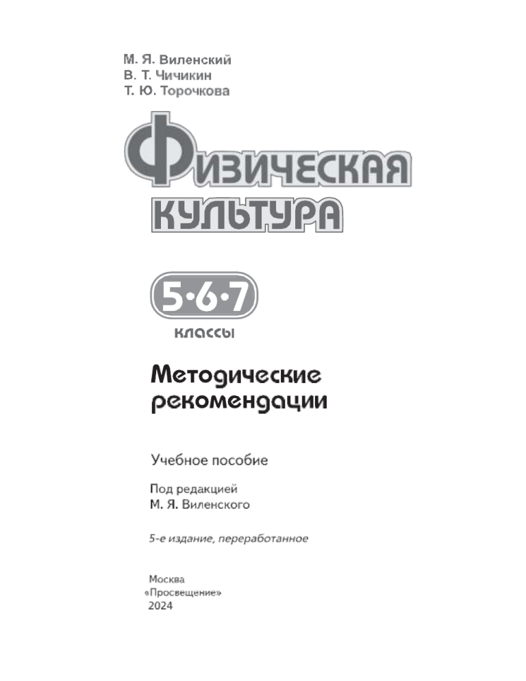 УДК 373.5.016:796 ББК 74.267.5 В44 В44 Виленский, Михаил Яковлевич. Физическая культура : 5—7-е классы : методические рекомендации / М. Я. Виленский, В. Т. Чичикин, Т. Ю. Торочкова ; под ред. М. Я. Виленского. — 5-е изд., перераб. — Москва : Просвещение, 2024. — 238, [2] с. ISBN 978-5-09-093834-1. Пособие разработано в соответствии с требованиями к результатам освоения основной образовательной программы основного общего образования Федерального государственного образовательного стандарта основного общего образования и направлено на достижение учащимися личностных, метапредметных и предметных результатов по физической культуре. В книгу включены теоретические сведения о психофизических особенностях учащихся 5–7 классов, о планировании и учебно-воспитательном процессе, методические рекомендации по преподаванию лёгкой атлетики, гимнастики, баскетбола, волейбола, футбола, лыжной подготовке в объёме учебной программы для образовательных организаций, а также по подготовке учащихся к сдаче нормативов Всероссийского физкультурно-спортивного комплекса «Готов к труду и обороне» (комплекса ГТО). УДК 373.5.016:796 ББК 74.267.5 ISBN 978-5-09-093834-1 © АО «Издательство «Просвещение», 2013, 2024 © Художественное оформление. АО «Издательство «Просвещение», 2013, 2024 Все права защищены Содержание .......................................... . 5 Глава 1. Пример рабочей программы . . . . . . . . . . . . . . . . . . 7 1.1. Пояснительная записка . . . . . . . . . . . . . . . . . . . . . . . . . . . . . 1.1.1. Общая характеристика учебного предмета «Физическая культура» . . . . . . . . . . . . . . . . . . . . . . . . . . . . . . . . . . . . . . . . 1.1.2. Цели изучения учебного предмета «Физическая культура», которые достигаются в результате реализации программы основного общего образования . . . . . . . . . . . . . . . . . . 1.1.3. Место учебного предмета «Физическая культура» в учебном плане . . . . . . . . . . . . . . . . . . . . . . . . . . . . . . . . . . . . . . . 1.2. Содержание учебного предмета «Физическая культура» по годам обучения . . . . . . . . . . . . . . . . . . . . . . . . . . . . . . . . . . . . . . . . . 1.3. Планируемые результаты освоения учебного предмета «Физическая культура» на уровне основного общего образования ... . 1.4. Тематическое планирование . . . . . . . . . . . . . . . . . . . . . . . . . 7 17 24 Глава 2. Регламентирующие основы методики физического воспитания . . . . . . . . . . . . . . . . . . . . . . . . . . . . . . . . . . . . . . . . . . . . 107 Предисловие 7 10 11 12 2.1. Теоретические представления о сущности методики и её реализации в образовательном процессе . . . . . . . . . . . . . . . . . . . . . 107 2.2. Характеристика методов физического воспитания ..... . 111 2.2.1. Метод слова . . . . . . . . . . . . . . . . . . . . . . . . . . . . . . . . . . . . . 111 2.2.2. Метод наглядности . . . . . . . . . . . . . . . . . . . . . . . . . . . . . . . 114 2.2.3. Метод упражнения . . . . . . . . . . . . . . . . . . . . . . . . . . . . . . . 116 Глава 3. Психофизические особенности учащихся 5–7 классов и возможности их учёта в процессе физического воспитания . . . . . . . . . . . . . . . . . . . . . . . . . . . . . . . . . . . . . . . . . . . . . . . . . . . . . . . . . . . 130 3.1. Характеристика психофизических особенностей учащихся 5–7 классов . . . . . . . . . . . . . . . . . . . . . . . . . . . . . . . . . . . . . . . . . . . . . . . 130 3.2. Формирование физкультурной активности учащихся 5–7 классов с учётом их психофизических особенностей . . . . . 135 3.3. Контроль интереса к физкультурной деятельности учащихся . . . . . . . . . . . . . . . . . . . . . . . . . . . . . . . . . . . . . . . . . . . . . . . . . . . . . 143 Глава 4. Содержание и организация теоретической подготовки учащихся в процессе физического воспитания ........ . 4.1. Содержательное обеспечение теоретической подготовки учащихся 5–7 