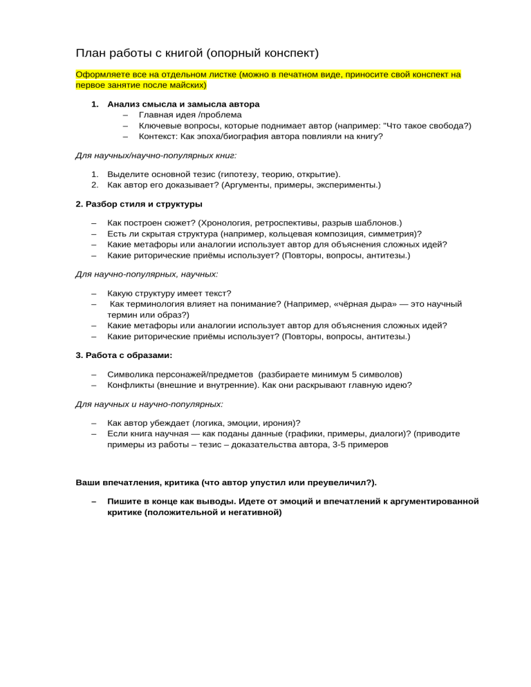 План работы с книгой (опорный конспект) Оформляете все на отдельном листке (можно в печатном виде, приносите свой конспект на первое занятие после майских) 1. Анализ смысла и замысла автора – Главная идея /проблема – Ключевые вопросы, которые поднимает автор (например: "Что такое свобода?) – Контекст: Как эпоха/биография автора повлияли на книгу? Для научных/научно-популярных книг: 1. Выделите основной тезис (гипотезу, теорию, открытие). 2. Как автор его доказывает? (Аргументы, примеры, эксперименты.) 2. Разбор стиля и структуры – – – – Как построен сюжет? (Хронология, ретроспективы, разрыв шаблонов.) Есть ли скрытая структура (например, кольцевая композиция, симметрия)? Какие метафоры или аналогии использует автор для объяснения сложных идей? Какие риторические приёмы использует? (Повторы, вопросы, антитезы.) Для научно-популярных, научных: – – – – Какую структуру имеет текст? Как терминология влияет на понимание? (Например, «чёрная дыра» — это научный термин или образ?) Какие метафоры или аналогии использует автор для объяснения сложных идей? Какие риторические приёмы использует? (Повторы, вопросы, антитезы.) 3. Работа с образами: – – Символика персонажей/предметов (разбираете минимум 5 символов) Конфликты (внешние и внутренние). Как они раскрывают главную идею? Для научных и научно-популярных: – – Как автор убеждает (логика, эмоции, ирония)? Если книга научная — как поданы данные (графики, примеры, диалоги)? (приводите примеры из работы – тезис – доказательства автора, 3-5 примеров Ваши впечатления, критика (что автор упустил или преувеличил?). – Пишите в конце как выводы. Идете от эмоций и впечатлений к аргументированной критике (положительной и негативной)