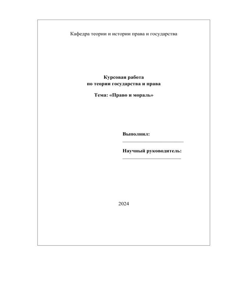 Кафедра теории и истории права и государства Курсовая работа по теории государства и права Тема: «Право и мораль» Выполнил: _______________________ Научный руководитель: ______________________ 2024 Введение Общество - это целая система сложных различных отношений, которая нуждающаяся в урегулировании и определенном упорядочивании. Такими регуляторами общества является система таких нормативных регуляторов как обычаи, нормы морали, религиозные нормы и нормы права. Одной из классических тем в мировой философско-правовой мысли является взаимоотношение права и морали. С античных времен до наших дней к этой теме не угасает исследовательский интерес. Нынешнее общество – это объединение граждан с разными моральными принципами, традициями, живущими на единой территории, которые имеют общие права и обязанности. Моральные и правовые взаимодействии между человеческого поведения фундаментальными нормы, собой, и находящиеся являются культуры. главными Право историческими и в теснейшем регуляторами мораль ценностями, выступают показателями цивилизованности общества его социального и культурного прогресса, в силу немаловажности они обладают наибольшим значением и социальным эффектом. Право и мораль в совокупности играют роль основы культуры общества и отражают уровень социального развития в обществе. Право и мораль-ценные формы существования, влияющие на судьбы государств и народов. История свидетельствует, что право и мораль попеременно играли ведущую роль и были реальными историческими силами, влиявшими мировоззрений. С на самых формирование государств, ранних человеческой этапов личностей и цивилизации мыслители пытались найти универсальные законы взаимодействия права и морали. На эту тему написано множество работ, но до окончательного решения еще далеко. В настоящий момент, актуальность выбранной темы исследования возрастает: вместо тоталитарного режима в современном мире появилось новое, объявившее своей главной целью обеспечить права и свободы граждан, что потребовало изменения идеологических основ в отношениях между гражданином и обществом, обществом и государством, а значит правом и моралью. Существует много причин, по которым актуальность темы также обусловлена. Это и появление в результате достижений научно-технического прогресса новых технологий - телевидения, интернета, компьютеров, генной инженерии и многого другого, что повлияло на поведение людей в современном обществе. Имеется возможность, что результаты некоторых новых технологий или продуктов прогресса могут быть получены только через несколько поколений. Ведь проблема состоит в том, что право и мораль не всегда дают своей оценки в виде запрета или дозволения до получения конкретных результатов, а также в возможной разности оценок правом и моралью одних и тех же новых явлений[5]. Очень важной и актуальной задачей национальной правовой политики является установление границ правового и нравственного регулирования новых и изменение закономерностей старых общественных правового и нравственного отношений, определение развития в условиях глобализации. Несмотря на значительное сходство понятий права и морали, тем не менее между ними существуют четкие разграничения, которые будут обозначены ниже. В последнее время в отечественной литературе наблюдается, что п