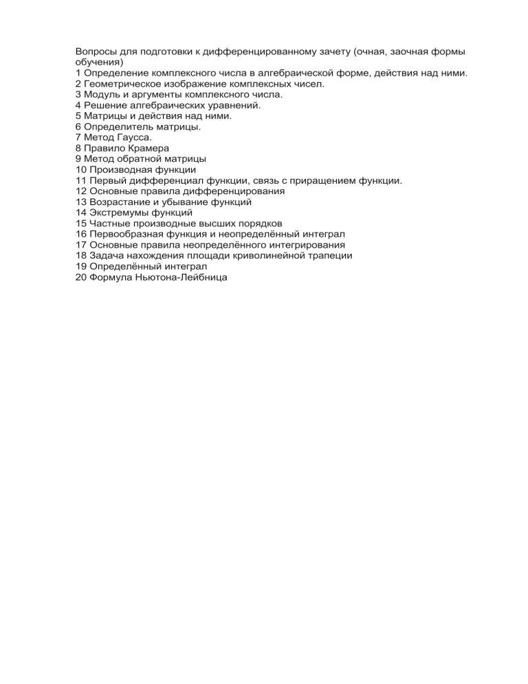 Вопросы для подготовки к дифференцированному зачету (очная, заочная формы обучения) 1 Определение комплексного числа в алгебраической форме, действия над ними. 2 Геометрическое изображение комплексных чисел. 3 Модуль и аргументы комплексного числа. 4 Решение алгебраических уравнений. 5 Матрицы и действия над ними. 6 Определитель матрицы. 7 Метод Гаусса. 8 Правило Крамера 9 Метод обратной матрицы 10 Производная функции 11 Первый дифференциал функции, связь с приращением функции. 12 Основные правила дифференцирования 13 Возрастание и убывание функций 14 Экстремумы функций 15 Частные производные высших порядков 16 Первообразная функция и неопределённый интеграл 17 Основные правила неопределённого интегрирования 18 Задача нахождения площади криволинейной трапеции 19 Определённый интеграл 20 Формула Ньютона-Лейбница