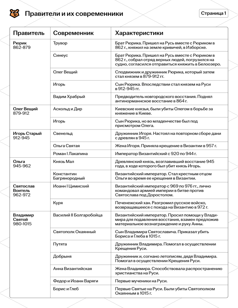 DocumentID: b'gAAAAABof0y1q27_kQRAMFKsSBhu4U6DeR2_MUTNCZ_mPwBcSaQcvVK8yl31J06fImAakROKEMzF0D25oRdYeZ2PdrlRkWmKng==' Правители и их современники Страница 1 Правитель Современник Характеристики Рюрик 862-879 Трувор Брат Рюрика. Пришел на Русь вместе с Рюриком в 862 г., княжил на земле кривичей, в Изборске. Синеус Брат Рюрика. Пришел на Русь вместе с Рюриком в 862 г., cобрал отряд верных людей, погрузился на судно, согласился отправиться княжить в Белоозеро. Олег Вещий Сподвижник и дружинник Рюрика, который затем стал князем в 879-912 гг. Игорь Сын Рюрика. Впоследствии стал князем на Руси в 912-945 гг. Вадим Храбрый Предводитель новгородского восстания. Поднял антинорманнское восстание в 864 г. Аскольд и Дир Киевские князья, были убиты Олегом в борьбе за княжение в Киеве. Игорь Сын Рюрика, но во младенчестве был под присмотром Олега. Свенельд Дружинник Игоря. Настоял на повторном сборе дани с древлян в 945 г. Ольга Святая Жена Игоря. Приняла крещение в Византии в 957 г. Роман I Лакапина Император Византийский с 920 по 944 г. Князь Мал Древлянский князь, возглавивший восстание 945 года, в ходе которого был убит князь Игорь. Константин Багрянородный Византийский император. Стал крестным отцом Ольги во время ее крещения в Византии. Иоанн I Цимисхий Византийский император с 969 по 976 гг., лично командовал армией империи в битве против Святослава под Доростолом. Куря Печенежский хан. Разгромил русское войско, возвращавшееся с похода на Византию в 972 г. Василий II Болгаробойца Византийский император. Просил помощи у Владимира для подавления восстания, взамен предложив материальное вознаграждение и руку Анны. Святополк Окаянный Сын Владимира Святославича. Приказал убить Бориса и Глеба в 1015 г. Путята Дружинник Владимира. Помогал в осуществлении Крещения Руси. Добрыня Дружинник и, согнано летописям, дядя Владимира. Помогал в осуществлении Крещения Руси. Анна Византийская Жена Владимира. Способствовала распространению Олег Вещий 879-912 Игорь Старый 912-945 Ольга 945-962 Святослав Воитель 962-972 Владимир Святой 980-1015 христианства на Руси. Федор и Иоанн Варяги Первые мученики на Руси. Борис и Глеб Первые Святые на Руси. Были убиты Святополком Окаянным в 1015 г. Страница 2 Правители и их современники Правитель Современник Характеристики Ян Усмошвец Летописный богатырь. Участвовал в битве на реке Трубеже и победил печенежского богатыря в 992 г. Митрополит Иларион Ярослав Первый митрополит русского происхождения. Мудрый Написал «Слово о законе и благодати», где обосновал 1019-1054 правильность принятия христианства на Руси. Святополк Окаянный Брат Ярослава Мудрого. Славился междоусобными войнами и особой жестокостью. Мстислав Тмутараканский Современник Ярослава Мудрого в борьбе за княжеский престол. Ингигерда Ш ведская Ж ена Ярослава. Способствовала установлению династических браков своих детей. Т 0 3 (Святослав, Изяслав, Всеволод Ярославичи) Период Болеслав II Польский король. Оказал помо риумвирата 1 щ ь Изяславу в междоусобной борьбе. 54-111 Всеволод Ярославич на Нежатиной Ниве Изяслав Ярославич 1078 Князь. Участвовал в Триумвирате. Участвовал в битве г. Князь. Вместе с братьями разрабатывал Правду Ярославичей. Святослав Ярославич Князь. Участвовал в Триумвирате. Владимир Мономах Князь. Выступил на Любечском с ъ с целью об В ладимир единения в 10 7 9 ъ езде князей г. Нестор Летописец. Написал Повесть временных лет. Путята Вышатич Киевский воевод