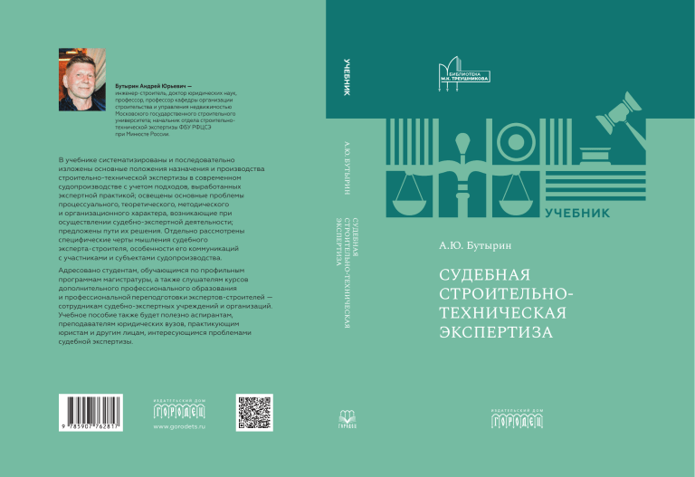 www.gorodets.ru СУДЕБНАЯ СТРОИТЕЛЬНО-ТЕХНИЧЕСКАЯ ЭКСПЕРТИЗА Адресовано студентам, обучающимся по профильным программам магистратуры, а также слушателям курсов дополнительного профессионального образования и профессиональной переподготовки экспертов-строителей — сотрудникам судебно-экспертных учреждений и организаций. Учебное пособие также будет полезно аспирантам, преподавателям юридических вузов, практикующим юристам и другим лицам, интересующимся проблемами судебной экспертизы. А.Ю. БУТЫРИН В учебнике систематизированы и последовательно изложены основные положения назначения и производства строительно-технической экспертизы в современном судопроизводстве с учетом подходов, выработанных экспертной практикой; освещены основные проблемы процессуального, теоретического, методического и организационного характера, возникающие при осуществлении судебно-экспертной деятельности; предложены пути их решения. Отдельно рассмотрены специфические черты мышления судебного эксперта-строителя, особенности его коммуникаций с участниками и субъектами судопроизводства. УЧЕБНИК Бутырин Андрей Юрьевич — инженер-строитель, доктор юридических наук, профессор, профессор кафедры организации строительства и управления недвижимостью Московского государственного строительного университета; начальник отдела строительнотехнической экспертизы ФБУ РФЦСЭ при Минюсте России. УЧЕБНИК А.Ю. Бутырин СУДЕБНАЯ СТРОИТЕЛЬНОТЕХНИЧЕСКАЯ ЭКСПЕРТИЗА A.U. BUTYRIN FORENSIC CONSTRUCTION AND TECHNICAL EXPERTISE Textbook Moscow • 2024 А.Ю. БУТЫРИН СУДЕБНАЯ СТРОИТЕЛЬНОТЕХНИЧЕСКАЯ ЭКСПЕРТИЗА Учебник Москва • 2024 УДК 343.148 ББК 67.53 Б93 Издательский дом «Городец» благодарит за оказанную помощь в выходе издания независимую частную российскую производственную компанию «Праймлайн». ПРАЙМЛАЙН: КОМПЛЕКСНЫЕ ЕРС-ПРОЕКТЫ Бутырин А.Ю. Б93 Судебная строительно-­техническая экспертиза: Учебник. — М.: Издательский дом «Городец», 2024. — 456 с. ISBN 978-5-907762-81-7 В учебнике систематизированы и последовательно изложены основные положения назначения и производства строительно-­технической экспертизы в современном судопроизводстве с учетом подходов, выработанных экспертной практикой; освещены основные проблемы процессуального, теоретического, методического и организационного характера, возникающие при осуществлении судебно-­экспертной деятельности; предложены пути их решения. Отдельно рассмотрены специфические черты мышления судебного эксперта-­строителя, особенности его коммуникаций с участниками и субъектами судопроизводства. Адресовано студентам, обучающимся по профильным программам магистратуры, а также слушателям курсов дополнительного профессионального образования и профессиональной переподготовки экспертов-­ строителей — сотрудникам судебно-­экспертных учреждений и организаций. Учебное пособие также будет полезно аспирантам, преподавателям юридических вузов, практикующим юристам и другим лицам, интересующимся проблемами судебной экспертизы. Ключевые слова: судебная строительно-­техническая экспертиза; судебный эксперт-­строитель; заключение эксперта; судебно-­экспертное исследование; судебно-­экспертная ситуация УДК 343.148 ББК 67.53 ISBN 978-5-907762-81-7 © Бутырин А.Ю., 2024 © ИД «Городец», оригинал-­макет (верстка, корректура, редактура, дизайн), полиграфическое исполнение, 2024 UDK 343.148 B