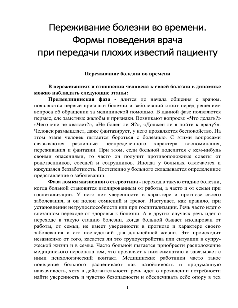 Переживание болезни во времени. Формы поведения врача при передачи плохих известий пациенту Переживание болезни во времени В переживаниях и отношении человека к своей болезни в динамике можно наблюдать следующие этапы: Предмедицинская фаза - длится до начала общения с врачом, появляются первые признаки болезни и заболевший стоит перед решением вопроса об обращении за медицинской помощью. В данной фазе появляются первые, еле заметные жалобы и признаки. Возникают вопросы: «Что делать?» «Чего мне не хватает?», «Не болен ли Я?», «Должен ли я пойти к врачу?». Человек размышляет, даже фантазирует, у него проявляется беспокойство. На этом этапе человек пытается бороться с болезнью. С этими вопросами связываются различные неопределенного характера воспоминания, переживания и фантазии. При этом, если больной поделится с кем-нибудь своими опасениями, то часто он получит противоположные советы от родственников, соседей и сотрудников. Иногда у больных отмечается и кажущаяся беззаботность. Постепенно у больного складывается определенное представление о заболевании. Фаза ломки жизненного стереотипа - переход в такую стадию болезни, когда больной становится изолированным от работы, а часто и от семьи при госпитализации. У него нет уверенности в характере и прогнозе своего заболевания, и он полон сомнений и тревог. Наступает, как правило, при установлении нетрудоспособности или при госпитализации. Речь часто идет о внезапном переходе от здоровья к болезни. А в других случаях речь идет о переходе в такую стадию болезни, когда больной бывает изолирован от работы, от семьи, не имеет уверенности в прогнозе и характере своего заболевания и его последствий для дальнейшей жизни. Это происходит независимо от того, касается ли это трудоустройства или ситуации в супружеской жизни и в семье. Часто больной пытается приобрести расположение медицинского персонала тем, что проявляет к ним симпатию и завязывает с ними психологический контакт. Медицинские работники часто такое поведение больного расценивают как назойливость и продуманную навязчивость, хотя в действительности речь идет о проявлении потребности найти уверенность и чувство безопасности и обеспечивать себе опору в тех 1 людях, от которых зависит здоровье и даже жизнь больного. У людей, бывших до этого времени вполне здоровыми, встречается повышенная неуверенность, опасения, страхи и тревога, так как болезнь для них явилась неожиданным психическим потрясением. Фаза адаптации к болезни, когда снижается чувство напряженности и безысходности, т.к. острые симптомы болезни постепенно уменьшаются, больной уже приспособился к факту заболевания. При этой фазе острые и мучительные симптомы болезни постепенно уменьшаются, а если они с начала заболевания имели более умеренный характер, то уже не беспокоят больного в такой степени. Пациент привыкает к ним, потому что приспособился к факту болезни. Он адаптируется также и к больничной среде. Поддерживает в себе надежду на выздоровление и создает при благоприятных условиях положительное отношение к медицинскому персоналу. Например, по данным исследования 276 больных, примерно около 75% госпитализированных пациентов адаптируется до 5 дней. Быстрее всего адаптируются рабочие, а затем больные, госпитализируемые повторно. Причем госпитализиров