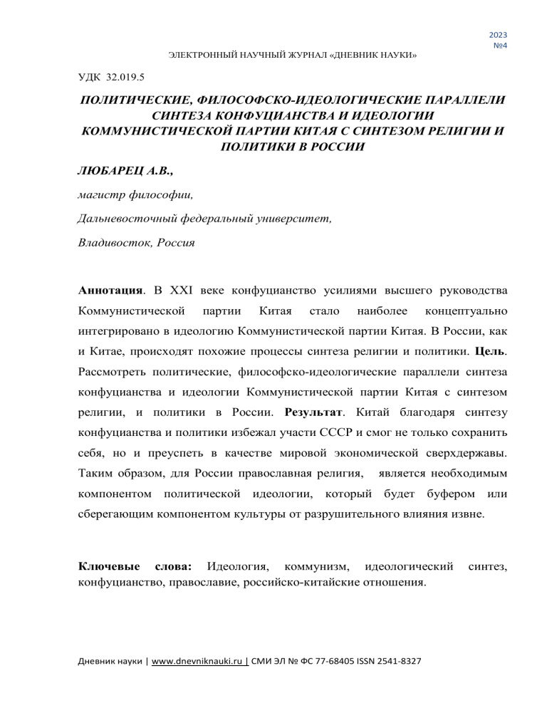 2023 №4 ЭЛЕКТРОННЫЙ НАУЧНЫЙ ЖУРНАЛ «ДНЕВНИК НАУКИ» УДК 32.019.5 ПОЛИТИЧЕСКИЕ, ФИЛОСОФСКО-ИДЕОЛОГИЧЕСКИЕ ПАРАЛЛЕЛИ СИНТЕЗА КОНФУЦИАНСТВА И ИДЕОЛОГИИ КОММУНИСТИЧЕСКОЙ ПАРТИИ КИТАЯ С СИНТЕЗОМ РЕЛИГИИ И ПОЛИТИКИ В РОССИИ ЛЮБАРЕЦ А.В., магистр философии, Дальневосточный федеральный университет, Владивосток, Россия Аннотация. В XXI веке конфуцианство усилиями высшего руководства Коммунистической партии Китая стало наиболее концептуально интегрировано в идеологию Коммунистической партии Китая. В России, как и Китае, происходят похожие процессы синтеза религии и политики. Цель. Рассмотреть политические, философско-идеологические параллели синтеза конфуцианства и идеологии Коммунистической партии Китая с синтезом религии, и политики в России. Результат. Китай благодаря синтезу конфуцианства и политики избежал участи СССР и смог не только сохранить себя, но и преуспеть в качестве мировой экономической сверхдержавы. Таким образом, для России православная религия, является необходимым компонентом политической идеологии, который будет буфером или сберегающим компонентом культуры от разрушительного влияния извне. Ключевые слова: Идеология, коммунизм, идеологический конфуцианство, православие, российско-китайские отношения. Дневник науки | www.dnevniknauki.ru | СМИ ЭЛ № ФС 77-68405 ISSN 2541-8327 синтез, ЭЛЕКТРОННЫЙ НАУЧНЫЙ ЖУРНАЛ «ДНЕВНИК НАУКИ» 2023 №4 POLITICAL, PHILOSOPHICAL AND IDEOLOGICAL PARALLELS OF THE SYNTHESIS OF CONFUCIANISM AND THE IDEOLOGY OF THE COMMUNIST PARTY OF CHINA WITH THE SYNTHESIS OF RELIGION AND POLITICS IN RUSSIA. LYUBARETS A.V., master of philosophy, Far Eastern Federal district University, Vladivostok, Russia Annotation. In the XXI century, Confucianism, through the efforts of the top leadership of the Communist Party of China, became the most conceptually integrated into the ideology of the Communist Party of China. In Russia, as well as in China, there are similar processes of synthesis of religion and politics. Goal. To consider the political, philosophical and ideological parallels of the synthesis of Confucianism and the ideology of the Communist Party of China with the synthesis of religion and politics in Russia. Goal. To consider the political, philosophical and ideological parallels of the synthesis of Confucianism and the ideology of the Communist Party of China with the synthesis of religion and politics in Russia. Result. Thanks to the synthesis of Confucianism and politics, China avoided the fate of the USSR and was able not only to preserve itself, but also to succeed as a global economic superpower. Thus, for Russia, the Orthodox religion is a necessary component of political ideology, which will be a buffer or a saving component of culture from destructive outside influence. Keywords: Ideology, communism, Orthodoxy, Russian-Chinese relations. ideological synthesis, Confucianism, В Китае еще с древних времен сформировался культ учителей, которые выступали, в том числе и в качестве нравственных наставников. В древнем Китае на основании учения Конфуция сформировался культ конфуцианства, который благодаря стараниям его учеников и последователей после смерти Дневник науки | www.dnevniknauki.ru | СМИ ЭЛ № ФС 77-68405 ISSN 2541-8327 2023 №4 ЭЛЕКТРОННЫЙ НАУЧНЫЙ ЖУРНАЛ «ДНЕВНИК НАУКИ» Конфуция распространился, и был интегрирован в государственную идеологию средневекового Китая. [2,7] Постепенно конфуцианство быстро распространилось и завоевало авторитет в среде государственных чиновников как низшего, так и высшего звена древнего Китая, также конфуцианского учения придерживались и правители Китая. После освободительной, народной революции в Китае Мао Цзэдун предпринимал попытки свести к минимуму влияние конфуцианства на новую, государственную идеологию коммунистического Китая. Но, не смотря на все, даже в эпоху Мао Цзэдуна конфуцианство не удалось уничтожить, оно так и осталось частично в китайской культуре коммунистического Китая. [3,172] В итоге уже при Мао Цзэдуне стал происходить синтез стар