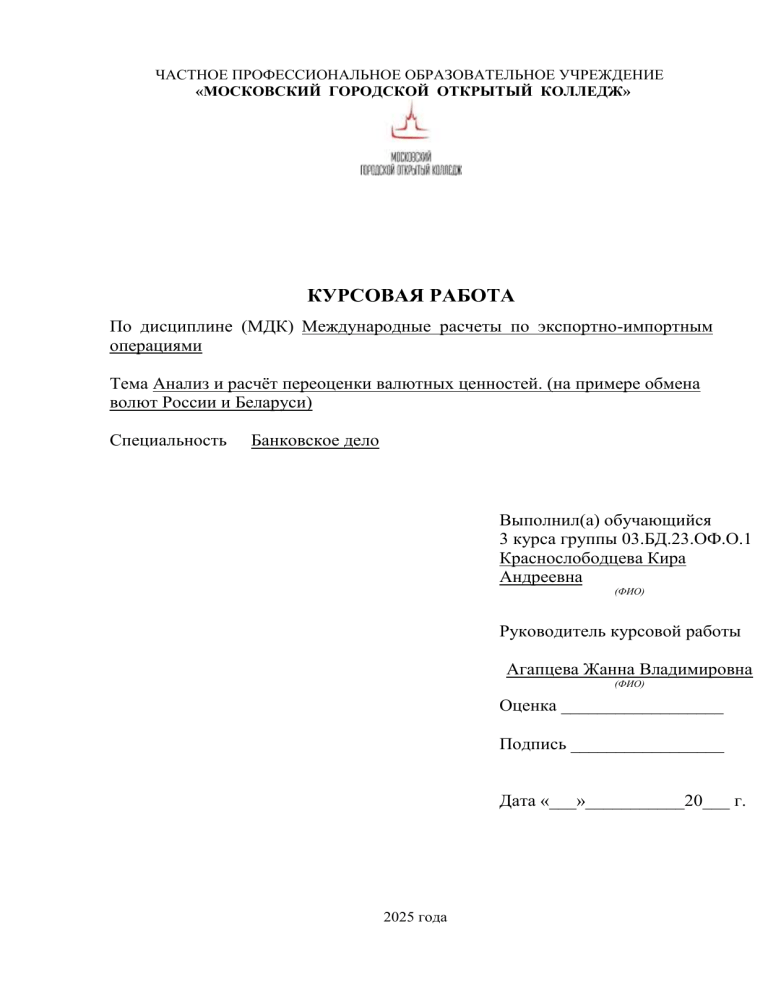 ЧАСТНОЕ ПРОФЕССИОНАЛЬНОЕ ОБРАЗОВАТЕЛЬНОЕ УЧРЕЖДЕНИЕ «МОСКОВСКИЙ ГОРОДСКОЙ ОТКРЫТЫЙ КОЛЛЕДЖ» КУРСОВАЯ РАБОТА По дисциплине (МДК) Международные расчеты по экспортно-импортным операциями Тема Анализ и расчёт переоценки валютных ценностей. (на примере обмена волют России и Беларуси) Специальность Банковское дело Выполнил(а) обучающийся 3 курса группы 03.БД.23.ОФ.О.1 Краснослободцева Кира Андреевна (ФИО) Руководитель курсовой работы Агапцева Жанна Владимировна (ФИО) Оценка __________________ Подпись _________________ Дата «___»___________20___ г. 2025 года СОДЕРЖАНИЕ ВВЕДЕНИЕ............................................................................................................. 3 ГЛАВА 1. ТРАНСФОРМАЦИЯ НОРМАТИВНО-ПРАВОВОГО РЕГУЛИРОВАНИЯ УЧЁТА ВАЛЮТНЫХ ОПЕРАЦИЙ В РОССИЙСКОЙ ФЕДЕРАЦИИ (2020-2024 ГГ.) .............................................. 6 1.1. Сущность курсовой разницы и её роль в формировании финансового результата в условиях высокой волатильности ................. 6 1.2. Эволюция подходов к учёту курсовых разниц: анализ изменений в ПБУ 3/2006 и Налоговом кодексе РФ ............................................................ 8 1.3. Влияние мер валютного контроля на учётные процессы (2022-2024 гг.)........................................................................................................................ 10 ГЛАВА 2. ПРАКТИЧЕСКИЙ АСПЕКТ РАСЧЁТА КУРСОВЫХ РАЗНИЦ В РОССИЙСКО-БЕЛОРУССКОЙ ТОРГОВЛЕ ........................ 14 2.1. Анализ современной структуры расчётов между РФ и РБ: динамика перехода на национальные валюты (на основе данных за 2020-2024 гг.) ..................................................................................................... 14 2.2. Моделирование практической ситуации: расчёт курсовых разниц по экспортному контракту, номинированному в белорусских рублях (BYN) .................................................................................................................. 16 2.3. Пошаговый расчёт и бухгалтерский учёт курсовых разниц у российской компании-экспортёра................................................................ 18 ГЛАВА 3. УПРАВЛЕНИЕ ВАЛЮТНЫМИ РИСКАМИ В СОВРЕМЕННЫХ УСЛОВИЯХ: ПРОБЛЕМЫ И РЕШЕНИЯ ................. 22 3.1. Ключевые риски участников ВЭД при расчётах в национальных валютах (2022-2024 гг.) ................................................................................... 22 3.2. Современные методы минимизации негативного влияния курсовых разниц .............................................................................................. 23 3.3. Перспективы развития платёжной инфраструктуры Союзного государства и их влияние на учёт ................................................................ 26 ЗАКЛЮЧЕНИЕ ................................................................................................... 29 СПИСОК ИСПОЛЬЗОВАННЫХ ИСТОЧНИКОВ ..................................... 31 ВВЕДЕНИЕ Актуальность темы исследования. Современный этап развития мировой экономики, начавшийся в 2020 году и получивший резкое ускорение в 2022-2024 годах, характеризуется фундаментальной трансформацией системы международных экономических отношений. В условиях беспрецедентного санкционного давления и геополитической турбулентности для Российской Федерации и Республики Беларусь критически важной задачей стало обеспечение устойчивости и безопасности взаимной торговли. Ключевым элементом этой стратегии является форсированный переход на расчёты в национальных валютах, что минимизирует риски, связанные с использованием платёжной инфраструктуры "недружественных" стран. Однако отказ от доллара США и евро не устраняет валютные риски как таковые, а лишь видоизменяет их. Колебания курса российского рубля по отношению к белорусскому макроэкономических рублю, факторов, обусловленные продолжают оказывать множе