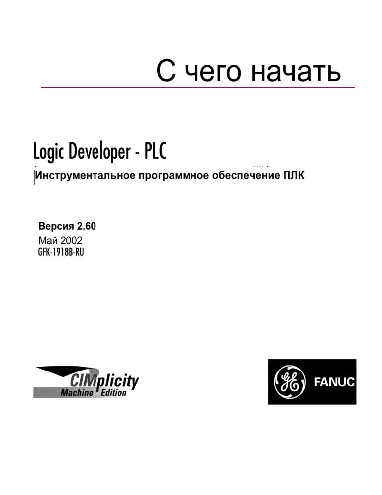 С чего начать Logic Developer - PLC Инструментальное программное обеспечение ПЛК Èíñòðóìåíòàëüíîå ïðîãðàììíîå îáåñïå÷åíèå ÏËÊ Версия 2.60 Май 2002 GFK-1918B-RU Все права защищены. Ни один раздел этой публикации не может воспроизводиться ни в печатной, ни в электронной форме, включая фотокопирование и запись, без письменного разрешения GE Fanuc Automation North America, Inc.. Ограничение гарантии и ответственность Информация, приведенная в этом руководстве, является точной и надежной. Однако, GE Fanuc Automation North America, Inc. не несет ответственности за какие-либо ошибки, упущения или неточности GE Fanuc Automation North America, Inc. отказывается от всех гарантий, высказанных или подразумевающихся, включая коммерческую гарантию и гарантию соответствия для конкретных целей, касающихся информации, содержащейся в этом руководстве, и программного обеспечения, описанного в нем. Все риски, касающиеся качества и функциональности информации, оборудования и программного обеспечения возлагаются на покупателя или пользователя. GE Fanuc Automation North America, Inc. не несет ответственности за любой ущерб, возникший в следствие использования этой информации или программного обеспечения, даже если GE Fanuc Automation North America, Inc. была уведомлена о возможности такого ущерба. Использование информации, содержащейся в руководстве, или программного обеспечения, описанного здесь, определяется стандартным лицензионным соглашением GE Fanuc Automation North America, Inc., которое должно быть выполнено покупателем или пользователем перед использованием этой информации или программного обеспечения. Примечание GE Fanuc Automation North America, Inc. оставляет за собой правило вносить улучшения в продукт, описанный в данной публикации, в любое время и без уведомления.. © 2001 GE Fanuc Automation North America, Inc. All rights reserved. Cimplicity является зарегестрированной торговой маркой GE Fanuc Automation North America, Inc. Любые другие торговые марки, на которые здесь имеются ссылки, используются исключительно для целей определения совместимости с продуктами GE Fanuc Automation North America, Inc. Мы хотим знать Вашу реакцию. Если у Вас есть какие-либо комментарии, вопросы или предложения по нашей документации, высылайте их нам по следующему адресу электронной почты. doc@gefanuc.com Содержание 1 Введение 1 Требования к системе . . . . . . . . . . . . . . . . . . . . . . . . . . . . . . . . .4 Установка . . . . . . . . . . . . . . . . . . . . . . . . . . . . . . . . . . . . . . . . . . .5 Авторизация продукта . . . . . . . . . . . . . . . . . . . . . . . . . . . . . . . . .6 Техническая поддержка . . . . . . . . . . . . . . . . . . . . . . . . . . . . . . . .9 2 CIMPLICITY Machine Edition 11 Быстрое начало . . . . . . . . . . . . . . . . . . . . . . . . . . . . . . . . . . . . .13 Проекты . . . . . . . . . . . . . . . . . . . . . . . . . . . . . . . . . . . . . . . . . . . .15 Глобальный поиск . . . . . . . . . . . . . . . . . . . . . . . . . . . . . . . . . . .17 Инструменты . . . . . . . . . . . . . . . . . . . . . . . . . . . . . . . . . . . . . . .18 Переменные . . . . . . . . . . . . . . . . . . . . . . . . . . . . . . . . . . . . . . . .20 Справка Machine Edition . . . . . . . . . . . . . . . . . . . . . . . . . . . . . .23 Справка Companion . . . . . . . . . . . . . . . . . . . . . . . . . . . . . . .23 Справка InfoViewer . . . . . . . . . . . . . . . . . . . . . . . . . . . . . . . .23 3 ПЛК GE Fanuc 27 Создание и конфигурирование целей . . . . . . . . . . . . . . . . . . .28 Создание целей . . . . . . . . . . . . . . . . . . . . . . . . . . . . . . . . . .28 Конфигурирование целей . . . . . . . . . . . . . . . . . . . . . . . . . .28 Конфигурирование коммуникаций . . . . . . . . . . . . . . . . . . .30 Взаимодействие с ПЛК . . . . . . . . . . . . . . . . . . . . . . . . . . . . . . .33 Проверка цели . . . . . . . . . . . . . . . . . . . . . . . . . . . . . . . . . . .33 Выгрузка/Загрузка . . . . . . . . . . . . . . . . . . . . . . . . . . . . . . . .33 Run/Stop . . . . . . . . . . . . . . . . . . . . . . . . . . . . . . . . . . . . . . . . .35 Online/Offline . . 