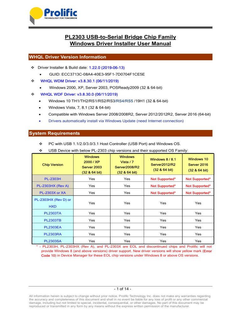 PL2303 USB-to-Serial Bridge Chip Family Windows Driver Installer User Manual WHQL Driver Version Information Driver Installer & Build date: 1.22.0 (2019-06-13) GUID: ECC3713C-08A4-40E3-95F1-7D0704F1CE5E WHQL WDM Driver: v3.8.30.1 (06/11/2019) Windows 2000, XP, Server 2003, POSReady2009 (32 & 64-bit) WHQL WDF Driver: v3.8.30.0 (06/11/2019) Windows 10 TH1/TH2/RS1/RS2/RS3/RS4/RS5 /19H1 (32 & 64-bit) Windows Vista, 7, 8.1 (32 & 64-bit) Compatible with Windows Server 2008/2008R2, Server 2012/2012R2, Server 2016 (64-bit) Drivers automatically install via Windows Update (need Internet connection) System Requirements PC with USB 1.1/2.0/3.0/3.1 Host Controller (USB Port) and Windows OS. USB Device with below PL-2303 chip versions and their supported OS Family: Windows Windows 2000 / XP Vista / 7 Server 2003 Server2008/R2 (32 & 64 bit) (32 & 64 bit) PL-2303H Yes PL-2303HX (Rev A) PL-2303X or XA Windows 8 / 8.1 Windows 10 Server2012/R2 Server 2016 (32 & 64 bit) (32 & 64 bit) Yes Not Supported* Not Supported* Yes Yes Not Supported* Not Supported* Yes Yes Not Supported* Not Supported* Yes Yes Yes Yes PL2303TA Yes Yes Yes Yes PL2303TB Yes Yes Yes Yes PL2303EA Yes Yes Yes Yes PL2303RA Yes Yes Yes Yes PL2303SA Yes Yes Yes Yes Chip Version PL-2303HX (Rev D) or HXD * - PL2303H, PL-2303HX (Rev A), and PL-2303X are EOL and discontinued chips and Prolific will not provide Windows 8 (and above versions) driver support. New driver versions will show yellow mark (Error Code 10) in Device Manager for these EOL chip versions under Windows 8 or above OS versions. - 1 of 14 All information herein is subject to change without prior notice. Prolific Technology Inc. does not make any warranties regarding the accuracy and completeness of this document and shall in no event be liable for any loss of profit or any other commercial damage, including but not limited to special, incidental, consequential, or other damages. No part of this document may be reproduced or transmitted in any form by any means without the express written permission of the manufacturer. Microsoft Hardware Certification Report Prolific driver has been tested and submitted for Microsoft Windows hardware certification. - 2 of 14 All information herein is subject to change without prior notice. Prolific Technology Inc. does not make any warranties regarding the accuracy and completeness of this document and shall in no event be liable for any loss of profit or any other commercial damage, including but not limited to special, incidental, consequential, or other damages. No part of this document may be reproduced or transmitted in any form by any means without the express written permission of the manufacturer. Windows Driver Installation This section will guide you on how to install the PL-2303 Windows Driver. You can download the latest Driver Installer program from Prolific Support website: http://www.prolific.com.tw/US/ShowProduct.aspx?p_id=225&pcid=41 The following steps will show how to install the device under Windows 7 (64-bit) OS as this is the most inquired driver installation support received by Prolific. The procedures are the same and straightforward for all other supported Windows operating system versions. 1. Power on your computer and boot to Windows. Run or double-click the PL-2303 Windows Driver Installer program. 2. The InstallShield Wizard will be displayed to inform you that the PL-2303 USB-to-Serial driver will be installed on your computer. Click Next to continue. - 3 of 14 All information herein is subject to change without prior notice. Prolific Technology Inc. does not make any warranties regarding the accuracy and completeness of this document and shall in no event be liable for any loss of profit or any other commercial damage, including but not limited to special, incidental, consequential, or other damages. No part of this document may be reproduced or transmitted in any form by any means without the express written permission of the manufacturer. 3. The PL-2303 Driver Installer program will then start to install the drivers needed. 4. Click the Finish button to close the InstallShield program. If you have plugged the cable into the PC while running the setup installation, please unplug and replug the cable for the system to detect the device. - 4 of 14 All information herein is subject to change without prior notice. Prolific Technology Inc. does not make any warranties regarding the accuracy and completeness of this document and shall in no event be liable for any loss of profit or any other commercial damage, including but not limited to special, incidental, consequential, or other damages. No part of this document may be reproduced or transmitted in any form by any means without the express written permission of the manufacturer. 5. Plug in the USB to Serial adapter to the PC USB port. Windows should detect the driver as Prolific USB-to-Serial Comm Port. Go to Device Manager and check for the “Prolific USB-to-Serial Comm Port” device and the COM port number assigned by Windows. 6. You can also check the driver version by right-clicking on the “Prolific USB-to-Serial Comm Port” device and select Properties and Driver tab. - 5 of 14 All information herein is subject to change without prior notice. Prolific Technology Inc. does not make any warranties regarding the accuracy and completeness of this document and shall in no event be liable for any loss of profit or any other commercial damage, including but not limited to special, incidental, consequential, or other damages. No part of this document may be reproduced or transmitted in any form by any means without the express written permission of the manufacturer. Warning!!! If you are encountering yellow mark (Error Code 10) for device in Device Manager under Windows XP, Vista, or Windows 7, you need to contact the cable vendor or manufacturer for possible counterfeit chip. Prolific does not manufacture or sell any end-user market products and will not provide o