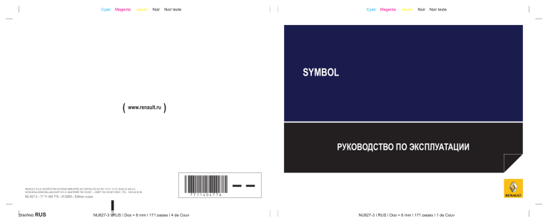 Cyan Magenta Jaune Noir Noir texte Cyan Magenta Jaune Noir Noir texte SYMBOL ( www.renault.ru ) РУКОВОДСТВО ПО ЭКСПЛУАТАЦИИ RENAULT S.A.S. SOCIÉTÉ PAR ACTIONS SIMPLIFIÉE AU CAPITAL DE 533 941 113 € / 13-15, QUAI LE GALLO 92100 BOULOGNE-BILLANCOURT R.C.S. NANTERRE 780 129 987 — SIRET 780 129 987 03591 / TÉL. : 0810 40 50 60 SiteWeb RUS RUS NU 827-3 – 77 11 404 776 – 01/2009 – Edition russe à7711404776ëëñä – – NU827-3 | RUS | Dos = 6 mm | 171 pages | 4 de Couv NU827-3 | RUS | Dos = 6 mm | 171 pages | 1 de Couv Cyan Magenta Jaune Noir Noir texte Cyan ɪɟɤɨɦɟɧɞɭɟɬ ELF ELF ɩɪɟɞɥɚɝɚɟɬ ɩɨɥɧɭɸ ɝɚɦɦɭ ɫɦɚɡɨɱɧɵɯ ɫɪɟɞɫɬɜ ɞɥɹ ɚɜɬɨɦɨɛɢɥɟɣ RENAULT: ɦɨɬɨɪɧɵɟ ɦɚɫɥɚ, ɬɪɚɧɫɦɢɫɫɢɨɧɧɵɟ ɦɚɫɥɚ ɤɚɤ ɞɥɹ ɚɜɬɨɦɨɛɢɥɟɣ ɫ ɪɭɱɧɨɣ, ɬɚɤ ɢ ɫ ɚɜɬɨɦɚɬɢɱɟɫɤɨɣ ɤɨɪɨɛɤɨɣ ɩɟɪɟɞɚɱ. Magenta Jaune Noir Noir texte 4 ɉɊɈɋɌɕɏ ȾȿɃɋɌȼɂə* ȾɅə ɈȻȿɋɉȿɑȿɇɂə ȼȺɒȿɃ ȻȿɁɈɉȺɋɇɈɋɌɂ ɉɪɟɞɭɩɪɟɠɞɟɧɢɟ! Ⱦɥɹ ɧɟɤɨɬɨɪɵɯ ɚɜɬɨɦɨɛɢɥɟɣ, ɜ ɰɟɥɹɯ ɨɩɬɢɦɢɡɚɰɢɢ ɪɚɛɨɬɵ ɞɜɢɝɚɬɟɥɹ, ɢɫɩɨɥɶɡɨɜɚɧɢɟ ɤɚɤɨɝɨ-ɥɢɛɨ ɫɦɚɡɨɱɧɨɝɨ ɫɪɟɞɫɬɜɚ ɦɨɠɟɬ ɛɵɬɶ ɨɝɪɚɧɢɱɟɧɨ. ɋɦ. ɪɭɤɨɜɨɞɫɬɜɨ ɩɨ ɫɟɪɜɢɫɧɨɦɭ ɨɛɫɥɭɠɢɜɚɧɢɸ. ɍɱɚɫɬɢɟ ɜ ɫɨɪɟɜɧɨɜɚɧɢɹɯ Ɏɨɪɦɭɥɵ 1 ɨɛɹɡɵɜɚɟɬ ELF ɫɨɡɞɚɜɚɬɶ ɫɦɚɡɨɱɧɵɟ ɫɪɟɞɫɬɜɚ ɫɚɦɨɝɨ ɜɵɫɨɤɨɝɨ ɤɚɱɟɫɬɜɚ. Ȼɥɚɝɨɞɚɪɹ ɬɟɫɧɨɦɭ ɫɨɬɪɭɞɧɢɱɟɫɬɜɭ ɫ ɬɟɯɧɢɱɟɫɤɢɦɢ ɨɬɞɟɥɚɦɢ RENAULT ɩɪɨɞɭɤɰɢɹ ELF ɛɥɟɫɬɹɳɟ ɨɬɜɟɱɚɟɬ ɜɫɟɦ ɨɫɨɛɟɧɧɨɫɬɹɦ ɚɜɬɨɦɨɛɢɥɟɣ ɷɬɨɣ ɦɚɪɤɢ. Ź ɋɦɚɡɨɱɧɵɟ ɫɪɟɞɫɬɜɚ ELF ɨɛɟɫɩɟɱɢɜɚɸɬ ɨɩɬɢɦɚɥɶɧɵɣ ɪɟɠɢɦ ɪɚɛɨɬɵ ɜɫɟɯ ɫɢɫɬɟɦ ȼɚɲɟɝɨ ɚɜɬɨɦɨɛɢɥɹ. 1 2 3 4 • ȼɫɟɝɞɚ ɩɪɢɫɬɟɝɢɜɚɣɬɟɫɶ ɪɟɦɧɟɦ ɛɟɡɨɩɚɫɧɨɫɬɢ, – ɞɚɠɟ ɩɪɢ ɩɟɪɟɞɜɢɠɟɧɢɢ ɧɚ ɧɟɛɨɥɶɲɢɟ ɪɚɫɫɬɨɹɧɢɹ, – ɞɚɠɟ ɟɫɥɢ ȼɚɲ ɚɜɬɨɦɨɛɢɥɶ ɨɛɨɪɭɞɨɜɚɧ ɩɨɞɭɲɤɚɦɢ ɛɟɡɨɩɚɫɧɨɫɬɢ. • ȼɫɟɝɞɚ ɩɪɢɫɬɟɝɢɜɚɣɬɟ ɞɟɬɟɣ, ɢɫɩɨɥɶɡɭɣɬɟ ɭɫɬɪɨɣɫɬɜɚ, ɫɨɨɬɜɟɬɫɬɜɭɸɳɢɟ ɢɯ ɜɟɫɭ ɢ ɪɨɫɬɭ (ɞɟɬɫɤɢɟ ɫɢɞɟɧɶɹ, ɫɢɞɟɧɶɹ ɤɨɪɡɢɧɨɱɧɨɝɨ ɬɢɩɚ ɢ ɬ. ɩ.). • Ɉɬɪɟɝɭɥɢɪɭɣɬɟ ɜɵɫɨɬɭ ɪɟɦɧɹ ɛɟɡɨɩɚɫɧɨɫɬɢ ɜ ɫɨɨɬɜɟɬɫɬɜɢɢ ɫ ȼɚɲɢɦ ɪɨɫɬɨɦ. • Ƚɪɨɦɨɡɞɤɢɟ ɩɪɟɞɦɟɬɵ ɢɥɢ ɬɹɠɟɥɵɣ ɛɚɝɚɠ ɭɤɥɚɞɵɜɚɣɬɟ ɧɚ ɞɧɨ ɛɚɝɚɠɧɨɝɨ ɨɬɞɟɥɟɧɢɹ. • ɍɛɟɞɢɬɟɫɶ, ɱɬɨ ɜɫɟ ɩɚɫɫɚɠɢɪɵ, ɜ ɬɨɦ ɱɢɫɥɟ ɧɚ ɡɚɞɧɟɦ ɫɢɞɟɧɶɟ, ɩɪɢɫɬɟɝɧɭɥɢ ɪɟɦɧɢ ɛɟɡɨɩɚɫɧɨɫɬɢ. • Ɉɬɪɟɝɭɥɢɪɭɣɬɟ ɧɚɤɥɨɧ • ɉɪɢ ɬɪɚɧɫɩɨɪɬɢɪɨɜɤɟ ɫɩɢɧɤɢ ɫɢɞɟɧɶɹ ɝɪɭɡɨɜ ɪɚɜɧɨɦɟɪɧɨ ɬɚɤ, ɱɬɨɛɵ ɪɟɦɟɧɶ ɪɚɫɩɪɟɞɟɥɹɣɬɟ ɢɯ ɛɟɡɨɩɚɫɧɨɫɬɢ ɤɚɤ ɦɨɠɧɨ ɬɹɠɟɫɬɶ ɦɟɠɞɭ ɥɟɜɨɣ • ȼɧɢɦɚɧɢɟ! ȿɫɥɢ ɩɥɨɬɧɟɟ ɩɪɢɥɟɝɚɥ ɤ ɬɟɥɭ. ɢ ɩɪɚɜɨɣ ɱɚɫɬɶɸ ɚɜɬɨɦɨɛɢɥɶ ɨɫɧɚɳɟɧ ɩɨɝɪɭɡɨɱɧɨɝɨ ɨɬɫɟɤɚ. • Ɉɬɪɟɝɭɥɢɪɭɣɬɟ ɜɵɫɨɬɭ ɨɞɧɨɣ ɢɥɢ ɧɟɫɤɨɥɶɤɢɦɢ ɩɨɞɝɨɥɨɜɧɢɤɚ: ɜɟɪɯɧɢɣ ɨɬɤɥɸɱɚɟɦɵɦɢ ɤɪɚɣ ɩɨɞɝɨɥɨɜɧɢɤɚ ɩɨɞɭɲɤɚɦɢ ɞɨɥɠɟɧ ɧɚɯɨɞɢɬɶɫɹ ɛɟɡɨɩɚɫɧɨɫɬɢ ɧɚ ɭɪɨɜɧɟ ɜɟɪɯɧɟɣ ɩɟɪɟɞɧɟɝɨ ɩɚɫɫɚɠɢɪɚ, ɱɚɫɬɢ ɝɨɥɨɜɵ. ɨɬɤɥɸɱɢɬɟ ɢɯ ɩɪɟɠɞɟ ɉɨɞɝɨɥɨɜɧɢɤ ɞɨɥɠɟɧ ɱɟɦ ɭɫɬɚɧɚɜɥɢɜɚɬɶ ɪɚɫɩɨɥɚɝɚɬɶɫɹ ɤɚɤ ɞɟɬɫɤɨɟ ɫɢɞɟɧɶɟ «ɩɪɨɬɢɜ ɦɨɠɧɨ ɛɥɢɠɟ ɤ ɝɨɥɨɜɟ. ɧɚɩɪɚɜɥɟɧɢɹ ɞɜɢɠɟɧɢɹ». * ȼɧɢɦɚɧɢɟ! ɉɟɪɟɱɢɫɥɟɧɧɵɟ ɞɟɣɫɬɜɢɹ ɹɜɥɹɸɬɫɹ ɧɟɨɛɯɨɞɢɦɵɦɢ, ɧɨ ɧɟɞɨɫɬɚɬɨɱɧɵɦɢ ɞɥɹ ɨɛɟɫɩɟɱɟɧɢɹ ȼɚɲɟɣ ɛɟɡɨɩɚɫɧɨɫɬɢ. Ɂɚ ɛɨɥɟɟ ɩɨɞɪɨɛɧɨɣ ɢɧɮɨɪɦɚɰɢɟɣ ɨɛɪɚɬɢɬɟɫɶ ɤ ɪɭɤɨɜɨɞɫɬɜɭ ɩɨ ɷɤɫɩɥɭɚɬɚɰɢɢ ɚɜɬɨɦɨɛɢɥɹ. RENAULT ɪɟɤɨɦɟɧɞɭɟɬ ɢɫɩɨɥɶɡɨɜɚɬɶ ɞɥɹ ɞɨɥɢɜɚ ɢ ɡɚɦɟɧɵ ɫɦɚɡɨɱɧɵɟ ɫɪɟɞɫɬɜɚ ELF. Ɉɛɪɚɳɚɣɬɟɫɶ ɧɚ ɫɟɪɜɢɫɧɭɸ ɫɬɚɧɰɢɸ RENAULT ɢɥɢ ɧɚ ɫɚɣɬ www.lubricants.elf.com The oil born in Formula One Elf RUS NU827-3 | RUS | Dos = 6 mm | 171 pages | 2 de Couv 4 Gestes RUS NU827-3 | RUS | Dos = 6 mm | 171 pages | 3 de Couv Добро пожаловать в Ваш автомобиль! Настоящее руководство по эксплуатации и обслуживанию автомобиля содержит информацию, которая позволит Вам: – ознакомиться с автомобилем, правильно его эксплуатировать и максимально использовать его возможности. – поддерживать его оптимальную работу посредством простого, но четкого соблюдения советов по техобслуживанию. – быстро устранить мелкие неисправности, не требующие вмешательства специалиста. То небольшое время, которое Вы потратите на чтение данного руководства, с лихвой окупится приобретенными сведениями, а также знаниями фун