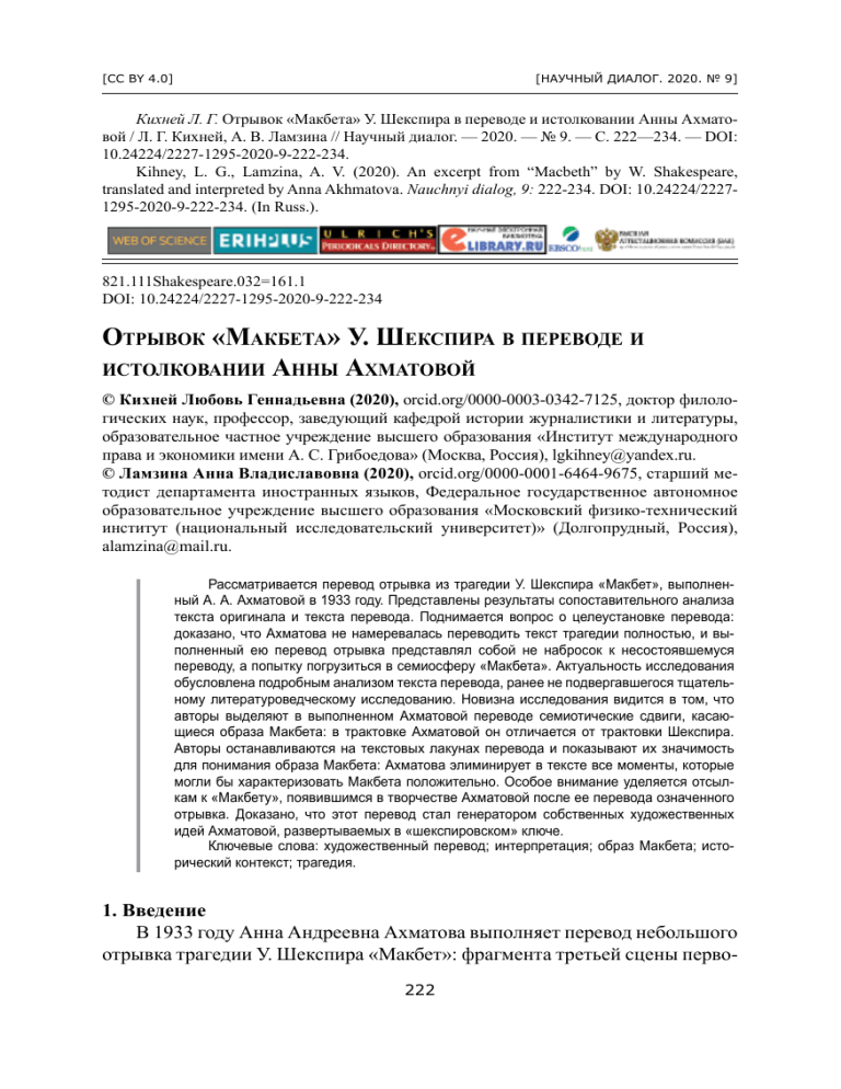 [CC BY 4.0] [НАУЧНЫЙ ДИАЛОГ. 2020. № 9] Кихней Л. Г. Отрывок «Макбета» У. Шекспира в переводе и истолковании Анны Ахматовой / Л. Г. Кихней, А. В. Ламзина // Научный диалог. — 2020. — № 9. — С. 222—234. — DOI: 10.24224/2227-1295-2020-9-222-234. Kihney, L. G., Lamzina, A. V. (2020). An excerpt from “Macbeth” by W. Shakespeare, translated and interpreted by Anna Akhmatova. Nauchnyi dialog, 9: 222-234. DOI: 10.24224/22271295-2020-9-222-234. (In Russ.). 821.111Shakespeare.032=161.1 DOI: 10.24224/2227-1295-2020-9-222-234 Отрывок «Макбета» У. Шекспира в переводе и истолковании Анны Ахматовой © Кихней Любовь Геннадьевна (2020), orcid.org/0000-0003-0342-7125, доктор филологических наук, профессор, заведующий кафедрой истории журналистики и литературы, образовательное частное учреждение высшего образования «Институт международного права и экономики имени А. С. Грибоедова» (Москва, Россия), lgkihney@yandex.ru. © Ламзина Анна Владиславовна (2020), orcid.org/0000-0001-6464-9675, старший методист департамента иностранных языков, Федеральное государственное автономное образовательное учреждение высшего образования «Московский физико-технический институт (национальный исследовательский университет)» (Долгопрудный, Россия), alamzina@mail.ru. Рассматривается перевод отрывка из трагедии У. Шекспира «Макбет», выполненный А. А. Ахматовой в 1933 году. Представлены результаты сопоставительного анализа текста оригинала и текста перевода. Поднимается вопрос о целеустановке перевода: доказано, что Ахматова не намеревалась переводить текст трагедии полностью, и выполненный ею перевод отрывка представлял собой не набросок к несостоявшемуся переводу, а попытку погрузиться в семиосферу «Макбета». Актуальность исследования обусловлена подробным анализом текста перевода, ранее не подвергавшегося тщательному литературоведческому исследованию. Новизна исследования видится в том, что авторы выделяют в выполненном Ахматовой переводе семиотические сдвиги, касающиеся образа Макбета: в трактовке Ахматовой он отличается от трактовки Шекспира. Авторы останавливаются на текстовых лакунах перевода и показывают их значимость для понимания образа Макбета: Ахматова элиминирует в тексте все моменты, которые могли бы характеризовать Макбета положительно. Особое внимание уделяется отсылкам к «Макбету», появившимся в творчестве Ахматовой после ее перевода означенного отрывка. Доказано, что этот перевод стал генератором собственных художественных идей Ахматовой, развертываемых в «шекспировском» ключе. Ключевые слова: художественный перевод; интерпретация; образ Макбета; исторический контекст; трагедия. 1. Введение В 1933 году Анна Андреевна Ахматова выполняет перевод небольшого отрывка трагедии У. Шекспира «Макбет»: фрагмента третьей сцены перво222 [CC BY 4.0] [НАУЧНЫЙ ДИАЛОГ. 2020. № 9] го акта. Этот перевод был впервые опубликован в 1980 году за рубежом и в 1989 году в России (Литературное обозрение. 1989. № 5. С. 18—21) с предисловием Р. Д. Тименчика [Тименчик, 1989, с. 18]. Переведенный Ахматовой отрывок «Макбета» в литературоведческом поле, за исключением комментария Р. Д. Тименчика [Тименчик, 1989, с. 18—21] и следующей в его фарватере Н. В. Королевой [Королева, 2004, с. 35], практически не подвергался анализу, хотя этот перевод весьма любопытен с нескольких точек зрения. Во-первых, он в какой-то мере ставит вопрос о мотивах, побудивших Ахматову к переводу именно этого фрагмента текста шекспировской трагедии. Во-вторых, в этом переводе ставится проблема ахматовской интерпретации шекспиров