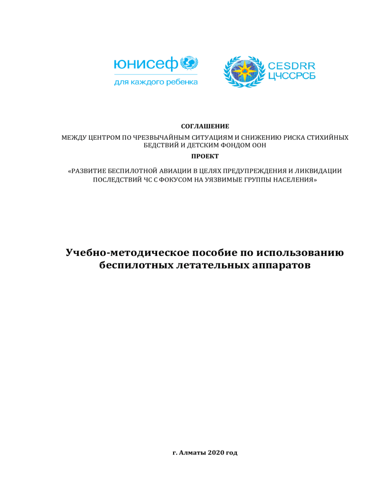 СОГЛАШЕНИЕ МЕЖДУ ЦЕНТРОМ ПО ЧРЕЗВЫЧАЙНЫМ СИТУАЦИЯМ И СНИЖЕНИЮ РИСКА СТИХИЙНЫХ БЕДСТВИЙ И ДЕТСКИМ ФОНДОМ ООН ПРОЕКТ «РАЗВИТИЕ БЕСПИЛОТНОЙ АВИАЦИИ В ЦЕЛЯХ ПРЕДУПРЕЖДЕНИЯ И ЛИКВИДАЦИИ ПОСЛЕДСТВИЙ ЧС С ФОКУСОМ НА УЯЗВИМЫЕ ГРУППЫ НАСЕЛЕНИЯ» Учебно-методическое пособие по использованию беспилотных летательных аппаратов г. Алматы 2020 год СОДЕРЖАНИЕ Обозначения и сокращения Введение 1. Сборка БПЛА и дистанционного пульта управления 1.1. Схема БПЛА 1.2 Схема дистанционного пульта управления 1.3. Режимы полета 1.4. Индикаторы статуса полета и состояния БПЛА 2. Инструкция по применению DJI Pilot 2.1 Настройки полетного контроллера 2.2 Система обнаружения препятствий 2.3 Настройки пульта управления 2.4 Уровень заряда батареи 2.5 Режимы настройки Подвеса Камеры 2.6 Общие настройки 2.7 Настройки фото 2.8 Настройки видео 3. Инструкция по применению Dji Pilot (полет по маршрутным точкам) 4. Обучение по использованию CTRL+DJI и Pix4d capture 4.1 Функционал работы на ПО «Pix4D Capture». 4.2 Построение маршрутного задания 5. Инструкция по применению DJI GO 4 5.1 Интеллектуальные режимы полета (Intelligent Flight Mode) 6. Государственное регулирование Ожидаемые результаты Вывод Используемая литература 5 9 10 12 15 16 22 24 27 29 30 31 33 36 37 42 43 45 48 50 53 61 63 64 Обозначения и сокращения БПЛА DJI Crystal Sky Matrice 210 V2 RTK Zenmuse XT2 Zenmuse Z30 ПО DJI Pilot Pix4d capture CTRL+DJI DJI Go 4 AIR MAP UAV Forecast Pix4d mapper Ортофотоплан ТВ-55 Cendence S ИК AirSense TimeSync Payload SDK Onboard SDK Беспилотный летательный аппарат Dajiang Innovation Technology-компания изготовитель БПЛА Сенсорный монитор для дистанционного пульта управления Модель беспилотного летательного аппарата Спутниковый приемник Тепловизорная камера Камера со 180-ти кратным зумом Программное обеспечение ПО для полетов на БПЛА в ручном и автоматическом режиме ПО для полетов в автоматическом режиме ПО для настройки БПЛА перед полетом ПО для полетов в ручном режиме полета ПО для просмотра запрещенных зон полета ПО для проверки всех погодных условий перед полетом ПО для послеполетной обработки данных Карта с максимальной детализацией объекта Модель аккумуляторов для БПЛА Пульт дистанционного управления Инфракрасные сенсоры Датчик отслеживающий все самолеты в радиусе 30км. Датчик который выравнивает полетный контроллер Дополнительные порты расширения Дополнительные порты расширения Введение В силу своего географического месторасположения территория Центрально-Азиатского региона подвержена многочисленным стихийным бедствиям. Серьезные геологические, техногенные, климатические угрозы и проблемы глобального изменения климата оказывают постоянное негативное воздействие на население, в особенности на его уязвимые группы (дети, инвалиды, пожилые), экономику и экологию региона. Территория Республики Казахстан подвержена практически всем видам стихийных и техногенных угроз, включая землетрясения, наводнения, оползни, грязевые потоки, сели, лавины, засухи, экстремальные температуры, эпидемии, прорывы плотин и выбросы опасных веществ. Помимо краткосрочных последствий, таких как прямые экономические потери, чрезвычайные ситуации оказывают негативное влияние на долгосрочное развитие общества и его безопасность. Вследствие чего снижение риска бедствий и устойчивое развитие являются взаимодополняющими целями. В этой связи решение вопросов о снижении риска бедствий должно иметь комплексный характер, с учетом будущих угроз и оп