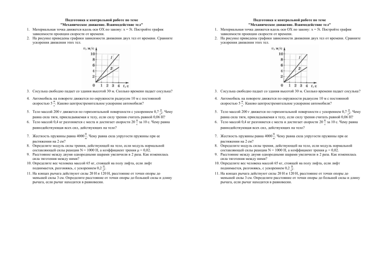 Подготовка к контрольной работе по теме "Механическое движение. Взаимодействие тел" 1. Материальная точка движется вдоль оси ОХ по закону: x = 5t. Постройте график зависимости проекции скорости от времени. 2. На рисунке приведены графики зависимости движения двух тел от времени. Сравните ускорения движения этих тел. Подготовка к контрольной работе по теме "Механическое движение. Взаимодействие тел" 1. Материальная точка движется вдоль оси ОХ по закону: x = 5t. Постройте график зависимости проекции скорости от времени. 2. На рисунке приведены графики зависимости движения двух тел от времени. Сравните ускорения движения этих тел. 3. Сосулька свободно падает со здания высотой 30 м. Сколько времени падает сосулька? 3. Сосулька свободно падает со здания высотой 30 м. Сколько времени падает сосулька? 4. Автомобиль на повороте движется по окружности радиусом 10 м с постоянной м скоростью 5 . Каково центростремительное ускорение автомобиля? 4. Автомобиль на повороте движется по окружности радиусом 10 м с постоянной м скоростью 5 . Каково центростремительное ускорение автомобиля? 5. Тело массой 200 г движется по горизонтальной поверхности с ускорением 0,7 . Чему с равна сила тяги, прикладываемая к телу, если силу трения считать равной 0,06 Н? м 6. Тело массой 0,4 кг разгоняется с места и достигает скорости 20 за 10 с. Чему равна 5. Тело массой 200 г движется по горизонтальной поверхности с ускорением 0,7 . Чему с равна сила тяги, прикладываемая к телу, если силу трения считать равной 0,06 Н? м 6. Тело массой 0,4 кг разгоняется с места и достигает скорости 20 за 10 с. Чему равна с м равнодействующая всех сил, действующих на тело? Н с 7. Жесткость пружины равна 4000 . Чему равна сила упругости пружины при ее м растяжении на 2 см? 8. Определите модуль силы трения, действующей на тело, если модуль нормальной составляющей силы реакции N = 1000 Н, а коэффициент трения μ = 0,02. 9. Расстояние между двумя однородными шарами увеличили в 2 раза. Как изменилась сила тяготения между ними? 10. Определите вес человека массой 65 кг, стоящей на полу лифта, если лифт м поднимается, разгоняясь, с ускорением 0,2 с . 11. На концах рычага действуют силы 20 Н и 120 Н, расстояние от точки опоры до меньшей силы 3 см. Определите расстояние от точки опоры до большей силы и длину рычага, если рычаг находится в равновесии. с м равнодействующая всех сил, действующих на тело? Н с 7. Жесткость пружины равна 4000 . Чему равна сила упругости пружины при ее м растяжении на 2 см? 8. Определите модуль силы трения, действующей на тело, если модуль нормальной составляющей силы реакции N = 1000 Н, а коэффициент трения μ = 0,02. 9. Расстояние между двумя однородными шарами увеличили в 2 раза. Как изменилась сила тяготения между ними? 10. Определите вес человека массой 65 кг, стоящей на полу лифта, если лифт м поднимается, разгоняясь, с ускорением 0,2 с . 11. На концах рычага действуют силы 20 Н и 120 Н, расстояние от точки опоры до меньшей силы 3 см. Определите расстояние от точки опоры до большей силы и длину рычага, если рычаг находится в равновесии.