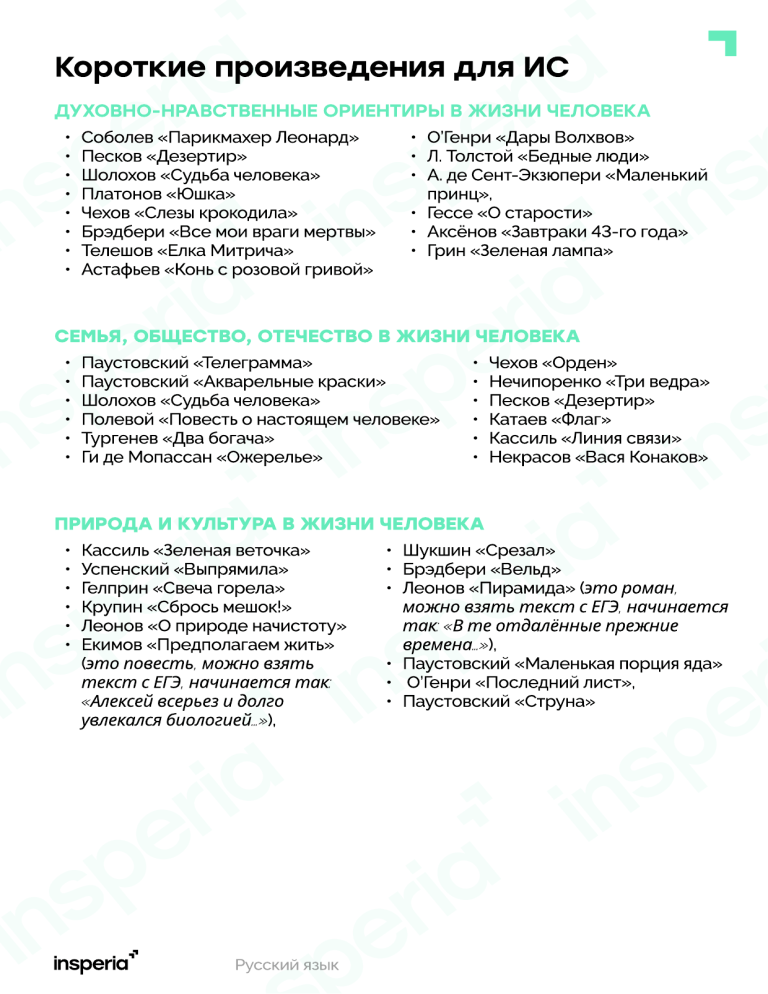 Короткие произведения для ИС Духовно-нравственные ориентиры в жизни человека Соболев «Парикмахер Леонард Песков «Дезертир Шолохов «Судьба человека Платонов «Юшка Чехов «Слезы крокодила Брэдбери «Все мои враги мертвы Телешов «Елка Митрича Астафьев «Конь с розовой гривой» О’Генри «Дары Волхвов Л. Толстой «Бедные люди А. де Сент-Экзюпери «Маленький принц», Гессе «О старости Аксёнов «Завтраки 43-го года Грин «Зеленая лампа» Семья, общество, Отечество в жизни человека Паустовский «Телеграмма Паустовский «Акварельные краски Шолохов «Судьба человека Полевой «Повесть о настоящем человеке Тургенев «Два богача Ги де Мопассан «Ожерелье» Чехов «Орден Нечипоренко «Три ведра Песков «Дезертир Катаев «Флаг Кассиль «Линия связи Некрасов «Вася Конаков» и о а и к льт а в жизни человека Пр р д у ур Кассиль «Зеленая веточка спенский «Выпрямила Гелприн «Свеча горела Крупин «Сбрось мешок Леонов «О природе начистоту Екимов «Предполагаем жить» У ! (это повесть, можно взять текст с ЕГЭ, начинается так: «Алексей всерьез и долго , увлекался биологией…») Шукшин «Срезал Брэдбери «Вельд Леонов «Пирамида» (это роман, можно взять текст с ЕГЭ, начинается так: «В те отдалённые прежние , Паустовский «Маленькая порция яда О’Генри «Последний лист», Паустовский «Струна» времена…»)
