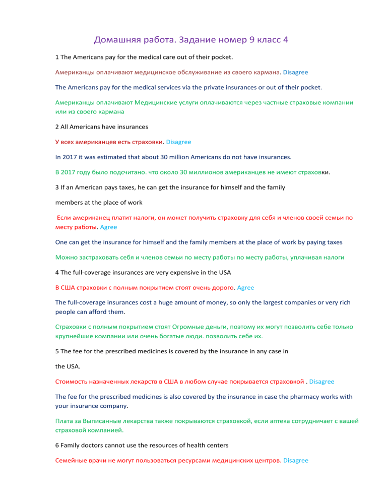 Домашняя работа. Задание номер 9 класс 4 1 The Americans pay for the medical care out of their pocket. Американцы оплачивают медицинское обслуживание из своего кармана. Disagree The Americans pay for the medical services via the private insurances or out of their pocket. Американцы оплачивают Медицинские услуги оплачиваются через частные страховые компании или из своего кармана 2 All Americans have insurances У всех американцев есть страховки. Disagree In 2017 it was estimated that about 30 million Americans do not have insurances. В 2017 году было подсчитано. что около 30 миллионов американцев не имеют страховки. 3 If an American pays taxes, he can get the insurance for himself and the family members at the place of work Если американец платит налоги, он может получить страховку для себя и членов своей семьи по месту работы. Agree One can get the insurance for himself and the family members at the place of work by paying taxes Можно застраховать себя и членов семьи по месту работы по месту работы, уплачивая налоги 4 The full-coverage insurances are very expensive in the USA В США страховки с полным покрытием стоят очень дорого. Agree The full-coverage insurances cost a huge amount of money, so only the largest companies or very rich people can afford them. Страховки с полным покрытием стоят Огромные деньги, поэтому их могут позволить себе только крупнейшие компании или очень богатые люди. позволить себе их. 5 The fee for the prescribed medicines is covered by the insurance in any case in the USA. Стоимость назначенных лекарств в США в любом случае покрывается страховкой . Disagree The fee for the prescribed medicines is also covered by the insurance in case the pharmacy works with your insurance company. Плата за Выписанные лекарства также покрываются страховкой, если аптека сотрудничает с вашей страховой компанией. 6 Family doctors cannot use the resources of health centers Семейные врачи не могут пользоваться ресурсами медицинских центров. Disagree Most physicians have private practices, but they may use the facilities of the hospital if they are registered and affiliated with it. Большинство врачей занимаются частной практикой, Но они могут пользоваться услугами больницы, если они зарегистрированы и связаны с ней с ней. 7.The emergency care in the USA is free for everyone Неотложная помощь в США бесплатна для всех. Disagree The emergency care is paid but the ambulances are staffed with paramedics only, so people should go to the nearest emergency room of a hospital. Скорая помощь платная, но в машинах скорой помощи работают только парамедики. поэтому люди должны обращаться в ближайшее отделение скорой помощи больницы. 8 Most of the hospitals in the UK are private Большинство больниц в Великобритании являются частными. Disagree Health care in the United Kingdom is mostly free, except for drugs and dental care. Медицинское обслуживание в Соединенном Королевстве в основном бесплатное, за исключением лекарств и стоматологических услуг. 9 Health service in Britain is free for everybody, even foreigners Медицинское обслуживание в Великобритании бесплатное для всех, даже для иностранцев. Agree\ Disagree 10 In the UK foreigners cannot receive any free medical service. В Великобритании иностранцы не могут получать никаких бесплатных медицинских услуг. Disagree Health care in the United Kingdom is mostly free, except for drugs and dental care. Медицинское обслуживание в Соединенном Королевстве в основном бесплатное, за исключением лекарств 11 A patient in the UK can choose between the NHS and private insurance programs. Пациент в Великобритании может выбирать между Национальной службой здравоохранения и частными страховыми программами. Agree A patient can choose between the NHS (National Health Service) and private insurance programs, but the majority prefers the NHS Пациент может выбирать между NHS (Национальной службой здравоохранения) и частными программами страхования. Национальная служба здравоохранения) и частными страховыми программами, но большинство предпочитает NHS 12 The GPs do very important work, which consists in filtering off 90% ofthe total medical workload Врачи общей практики выполняют оч