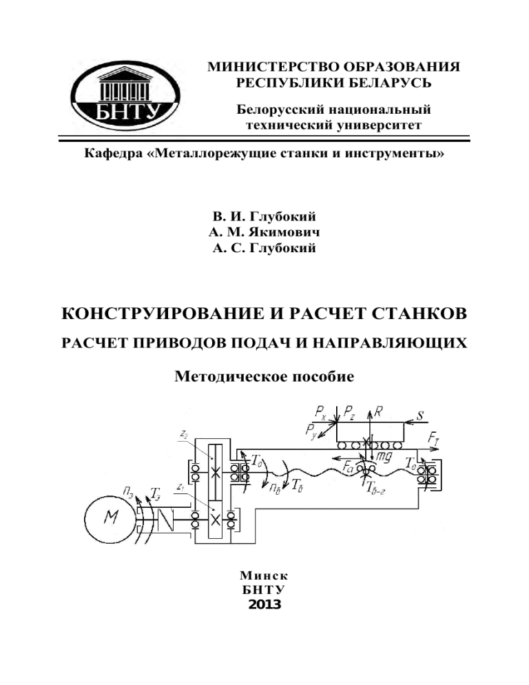 МИНИСТЕРСТВО ОБРАЗОВАНИЯ РЕСПУБЛИКИ БЕЛАРУСЬ Белорусский национальный технический университет Кафедра «Металлорежущие станки и инструменты» В. И. Глубокий А. М. Якимович А. С. Глубокий КОНСТРУИРОВАНИЕ И РАСЧЕТ СТАНКОВ РАСЧЕТ ПРИВОДОВ ПОДАЧ И НАПРАВЛЯЮЩИХ Методическое пособие Минск БНТУ 2013 МИНИСТЕРСТВО ОБРАЗОВАНИЯ РЕСПУБЛИКИ БЕЛАРУСЬ Белорусский национальный технический университет Кафедра «Металлорежущие станки и инструменты» В. И. Глубокий А. М. Якимович А. С. Глубокий КОНСТРУИРОВАНИЕ И РАСЧЕТ СТАНКОВ РАСЧЕТ ПРИВОДОВ ПОДАЧ И НАПРАВЛЯЮЩИХ Методическое пособие к практическим занятиям для студентов машиностроительных специальностей Минск БНТУ 2013 1 УДК 621.9.06-025.13(076.5)(075.8) ББК 34.63-5я7 Г55 Рецензенты: д-р техн. наук, проф. И. Л. Баршай; д-р техн. наук, проф. Н. В. Спиридонов Г55 Глубокий, В. И. Конструирование и расчет станков. Расчет приводов подач и направляющих : методическое пособие к практическим занятиям для студентов машиностроительных специальностей / В.И. Глубокий, А. М. Якимович, А. С. Глубокий. – Минск : БНТУ, 2013. – 97 с. ISBN 978-985-550-123-8. Методическое пособие по дисциплине «Конструирование и расчет станков. Расчет приводов подач и направляющих» предназначено для практических занятий студентов машиностроительных специальностей. В пособии приводятся основные этапы и последовательность выполнения расчетов и разработки конструкций приводов подач и направляющих металлорежущих станков с ЧПУ. Излагается методика составления расчетных схем нагрузок, действующих на рабочие органы приводов подач и направляющие станка, и расчета тяговых механизмов винт-гайка и направляющих скольжения и качения соответственно на износостойкость и долговечность. Данное методическое пособие также может быть использовано студентами при теоретической самостоятельной подготовке и выполнении курсовых проектов по проектированию приводов подач металлорежущих станков с ЧПУ. УДК 621.9.06-025.13(076.5)(075.8) ББК 34.63-5я7 ISBN 978-985-550-123-8 2 © Глубокий В. И., Якимович А. М., Глубокий А. С., 2013 © Белорусский национальный технический университет, 2013 Введение Приводы подач металлорежущих станков предназначены для обеспечения заданных диапазонов скоростей рабочих подач, перемещения рабочего органа станка с высокой скоростью при холостых и установочных движениях и создания необходимой тяговой силы. Таким образом, привод подач станка сообщает требуемые скорости подачи рабочему органу станка в виде стола, суппорта или шпиндельной бабки с обрабатываемой заготовкой или режущим инструментом и распространяет процесс резания на всю обрабатываемую поверхность заготовки. Кроме того, привод подач может обеспечивать определенную скорость быстрого перемещения рабочего органа при его вспомогательном движении во время холостого хода. При различных режимах обработки заготовок в зависимости от требуемого качества обрабатываемых поверхностей соответствующие значения подач обеспечиваются регулируемым приводом подач. По характеру переключения значений подач эти приводы могут быть с дискретным и с непрерывным переключением и являются приводами со ступенчатым и бесступенчатым регулированием коробкой подач или регулируемым электродвигателем. Ступенчатое регулирование значений подач механическое и осуществляется коробками подач, которые переключаются в основном передвижными бл