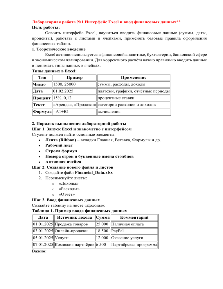 Лабораторная работа №1 Интерфейс Excel и ввод финансовых данных** Цель работы: Освоить интерфейс Excel, научиться вводить финансовые данные (суммы, даты, проценты), работать с листами и ячейками, применять базовые правила оформления финансовых таблиц. 1. Теоретическое введение Excel активно используется в финансовой аналитике, бухгалтерии, банковской сфере и экономическом планировании. Для корректного расчёта важно правильно вводить данные и понимать типы данных в ячейках. Типы данных в Excel: Тип Пример Применение Число 1500, 25000 суммы, расходы, доходы Дата 01.02.2025 платежи, графики, отчётные периоды Процент 15%, 0,12 Текст процентные ставки «Аренда», «Продажи» категории расходов и доходов Формула =A1+B1 вычисления 2. Порядок выполнения лабораторной работы Шаг 1. Запуск Excel и знакомство с интерфейсом Студент должен найти основные элементы: Лента (Ribbon) – вкладки Главная, Вставка, Формулы и др. Рабочий лист Строка формул Номера строк и буквенные имена столбцов Активная ячейка Шаг 2. Создание нового файла и листов 1. Создайте файл Financial_Data.xlsx 2. Переименуйте листы: o «Доходы» o «Расходы» o «Отчёт» Шаг 3. Ввод финансовых данных Создайте таблицу на листе «Доходы»: Таблица 1. Пример ввода финансовых данных Дата Источник дохода Сумма Комментарий 01.01.2025 Продажа товаров 25 000 Наличная оплата 03.01.2025 Онлайн-продажи 18 500 PayPal 05.01.2025 Услуги 12 000 Оказание услуги 07.01.2025 Комиссия партнёров 6 500 Важно: Партнёрская программа — Даты вводить в формате: дд.мм.гггг — Суммы вводить как числа, а не текст — Комментарий вводится как текст Шаг 4. Ввод процентов Создайте таблицу процентных ставок: Месяц Ставка банка Январь 12% Февраль 12,5% Март 13% Правила ввода процентов: Ввести 12%, а не «12» Excel автоматически преобразует в числовой формат 0,12 При необходимости включить форматирование: Главная → Число → Процент Шаг 5. Проверка типов данных Проверить: Выравнивание по правому краю = число/дата Выравнивание по левому краю = текст 3. Практическое задание Задание 1. Создать таблицу расходов На листе «Расходы» создайте таблицу: Дата Категория Сумма Способ оплаты 02.01.2025 Закупка товара 12 000 Наличные 04.01.2025 Аренда 8 500 Банковский перевод 06.01.2025 Зарплата 15 000 Карта 08.01.2025 Реклама 6 000 Kaspi Pay Задание 2. Проверка корректности данных Студент должен убедиться: что суммы — числа, даты — даты, проценты — в формате процента. Задание 3. Создать простой финансовый отчёт На листе «Отчёт»: Показатель Значение Общие доходы (ввести позже формулу) Общие расходы (ввести позже формулу) Чистая прибыль (доходы – расходы) (Формулы будут в следующих лабораторных работах.) 4. Контрольные вопросы 1. Какие типы данных используются в финансовых расчётах Excel? 2. Чем дата отличается от текста в Excel? 3. Как вводить процентные ставки? 4. Почему важно правильно задавать формат ячеек? 5. Что такое активная ячейка? 5. Ожидаемые результаты Студент должен уметь: ориентироваться в интерфейсе Excel; создавать рабочие листы; вводить финансовые данные (числа, суммы, даты, проценты); оформлять таблицы базового уровня. 6. Приобретаемые компетенции Компетенция Описание ИКТ-грамотность Умение работать с электронными таблицами Финансовая грамотность Корректный ввод сумм, дат, процентов Организация данных Создание структурированных таблиц Навыки обработки данных Правильное определение типов данных Подготовка аналитической информации Создание базового финансов