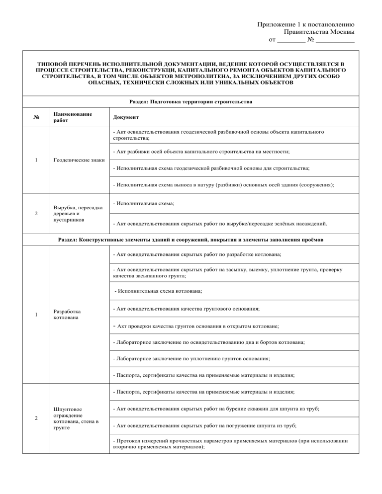 Приложение 1 к постановлению Правительства Москвы от ________ № ___________ ТИПОВОЙ ПЕРЕЧЕНЬ ИСПОЛНИТЕЛЬНОЙ ДОКУМЕНТАЦИИ, ВЕДЕНИЕ КОТОРОЙ ОСУЩЕСТВЛЯЕТСЯ В ПРОЦЕССЕ СТРОИТЕЛЬСТВА, РЕКОНСТРУКЦИ, КАПИТАЛЬНОГО РЕМОНТА ОБЪЕКТОВ КАПИТАЛЬНОГО СТРОИТЕЛЬСТВА, В ТОМ ЧИСЛЕ ОБЪЕКТОВ МЕТРОПОЛИТЕНА, ЗА ИСКЛЮЧЕНИЕМ ДРУГИХ ОСОБО ОПАСНЫХ, ТЕХНИЧЕСКИ СЛОЖНЫХ ИЛИ УНИКАЛЬНЫХ ОБЪЕКТОВ Раздел: Подготовка территории строительства № Наименование работ Документ - Акт освидетельствования геодезической разбивочной основы объекта капитального строительства; - Акт разбивки осей объекта капитального строительства на местности; 1 Геодезические знаки - Исполнительная схема геодезической разбивочной основы для строительства; - Исполнительная схема выноса в натуру (разбивки) основных осей здания (сооружения); 2 Вырубка, пересадка деревьев и кустарников - Исполнительная схема; - Акт освидетельствования скрытых работ по вырубке/пересадке зелёных насаждений. Раздел: Конструктивные элементы зданий и сооружений, покрытия и элементы заполнения проёмов - Акт освидетельствования скрытых работ по разработке котлована; - Акт освидетельствования скрытых работ на засыпку, выемку, уплотнение грунта, проверку качества засыпанного грунта; - Исполнительная схема котлована; 1 Разработка котлована - Акт освидетельствования качества грунтового основания; - Акт проверки качества грунтов основания в открытом котловане; - Лабораторное заключение по освидетельствованию дна и бортов котлована; - Лабораторное заключение по уплотнению грунтов основания; - Паспорта, сертификаты качества на применяемые материалы и изделия; - Паспорта, сертификаты качества на применяемые материалы и изделия; 2 Шпунтовое ограждение котлована, стена в грунте - Акт освидетельствования скрытых работ на бурение скважин для шпунта из труб; - Акт освидетельствования скрытых работ на погружение шпунта из труб; - Протокол измерений прочностных параметров применяемых материалов (при использовании вторично применяемых материалов); - Протокол измерений дозиметрического контроля применяемых материалов (при использовании вторично применяемых материалов); - Акт освидетельствования скрытых работ на устройство обвязочного пояса (устройство распределительной балки); - Акт освидетельствования скрытых работ по устройству грунтовых анкеров; - Акт испытаний контрольных образцов раствора на прочность при сжатии; - Исполнительная схема по устройству грунтовых анкеров; - Исполнительная схема по устройству стены в грунте; - Акт освидетельствования скрытых работ на устройство раскосов/подкосов распределительного пояса; - Акт освидетельствования скрытых работ на устройство шпунта Ларсена; - Акт освидетельствования скрытых работ на устройство шпунтового ограждения; - Акт освидетельствования скрытых работ на извлечение шпунтового ограждения (труб); - Исполнительная схема при организации шпунтового ограждения котлована; - Акт освидетельствования скрытых работ на устройство системы водопонижения; - Исполнительная схема на устройство системы водопонижения; - Паспорта и сертификаты качества на применяемые материалы; - Лабораторные заключения о наборе прочности бетона; - Документы о контроле качества сварных соединений; - Акт освидетельствования скрытых работ на устройство свайного основания; - Акт освидетельс
