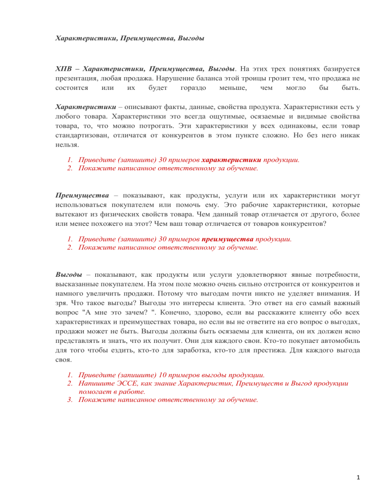 Характеристики, Преимущества, Выгоды ХПВ – Характеристики, Преимущества, Выгоды. На этих трех понятиях базируется презентация, любая продажа. Нарушение баланса этой троицы грозит тем, что продажа не состоится или их будет гораздо меньше, чем могло бы быть. Характеристики – описывают факты, данные, свойства продукта. Характеристики есть у любого товара. Характеристики это всегда ощутимые, осязаемые и видимые свойства товара, то, что можно потрогать. Эти характеристики у всех одинаковы, если товар стандартизован, отличатся от конкурентов в этом пункте сложно. Но без него никак нельзя. 1. Приведите (запишите) 30 примеров характеристики продукции. 2. Покажите написанное ответственному за обучение. Преимущества – показывают, как продукты, услуги или их характеристики могут использоваться покупателем или помочь ему. Это рабочие характеристики, которые вытекают из физических свойств товара. Чем данный товар отличается от другого, более или менее похожего на этот? Чем ваш товар отличается от товаров конкурентов? 1. Приведите (запишите) 30 примеров преимущества продукции. 2. Покажите написанное ответственному за обучение. Выгоды – показывают, как продукты или услуги удовлетворяют явные потребности, высказанные покупателем. На этом поле можно очень сильно отстроится от конкурентов и намного увеличить продажи. Потому что выгодам почти никто не уделяет внимания. И зря. Что такое выгоды? Выгоды это интересы клиента. Это ответ на его самый важный вопрос "А мне это зачем? ". Конечно, здорово, если вы расскажите клиенту обо всех характеристиках и преимуществах товара, но если вы не ответите на его вопрос о выгодах, продажи может не быть. Выгоды должны быть осязаемы для клиента, он их должен ясно представлять и знать, что их получит. Они для каждого свои. Кто-то покупает автомобиль для того чтобы ездить, кто-то для заработка, кто-то для престижа. Для каждого выгода своя. 1. Приведите (запишите) 10 примеров выгоды продукции. 2. Напишите ЭССЕ, как знание Характеристик, Преимуществ и Выгод продукции помогает в работе. 3. Покажите написанное ответственному за обучение. 1