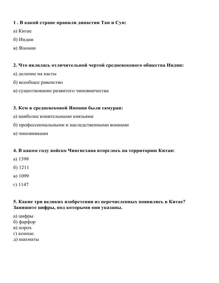 1 . В какой стране правили династии Тан и Сун: а) Китае б) Индии в) Японии 2. Что являлась отличительной чертой средневекового общества Индии: а) деление на касты б) всеобщее равенство в) существование развитого чиновничества 3. Кем в средневековой Японии были самураи: а) наиболее влиятельными князьями б) профессиональными и наследственными воинами в) чиновниками 4. В каком году войско Чингисхана вторглось на территорию Китая: а) 1398 б) 1211 в) 1099 г) 1147 5. Какие три великих изобретения из перечисленных появились в Китае? Запишите цифры, под которыми они указаны. а) цифры б) фарфор в) порох г) компас д) шахматы 6. Кем были сёгуны в средневековой Японии: а) императоры б) верховные военные правители в) чиновники 7. Социальные группы людей со схожим происхождением, профессиями, правами и обязанностями в Индии назывались: а) классами б) кастами в) сословиями 8. Особенностью географического положения Японии является: а) Япония расположена на островах б) значительная часть территории Японии — это пустыня в) территория Японии по площади во много раз превосходит территории Индии и Китая 9. Как именовали правителя Китая в Средневековье: а) фараоном б) Сыном Неба в) первым среди равных г) ханом 10. Отметьте три верных утверждения, применимых к средневековым Индии, Китаю и Японии. Запишите цифры, под которыми они указаны. а) в борьбе с монголами в XIII веке Китаю удалось сохранить независимость б) образованный китаец мог занять государственную должность в) положение человека в Китае было менее связано с его происхождением, чем в Индии г) в Индии сын прачки или уборщицы, получив образование, мог стать правителем страны д) на культуру и обычаи Японии оказал большое влияние буддизм