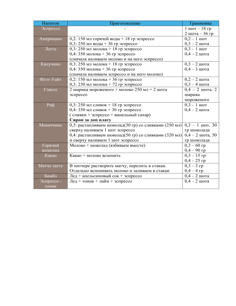 Напиток Эспрессо Американо Латте Капучино Флэт-Уайт Гляссе Раф Мокаччино Горячий шоколад Какао Матча латте Бамбл Эспрессо тоник Приготовление 0,2: 150 мл горячей воды + 18 гр эспрессо 0,3: 250 мл воды + 36 гр эспрессо 0,3: 250 мл молока + 18 гр эспрессо 0,4: 350 молока + 36 гр эспрессо (сначала наливаем молоко и на него эспрессо) 0,3: 250 мл молока + 18 гр эспрессо 0,4: 350 молока + 36 гр эспрессо (сначала наливаем эспрессо и на него молоко) 0,2: 150 мл молока + 36 гр эспрессо 0,3: 230 мл молока + 72 гр эспрессо 2 шарика мороженого + молоко 250 мл + 2 шота эспрессо Граммовка 1 шот – 18 гр 2 шота – 36 гр 0,2 – 1 шот 0,3 – 2 шота 0,3 – 1 шот 0,4 – 2 шота 0,3 – 2 шота 0,4 – 3 шота 0,2 – 2 шота 0,3 – 4 шота 0,4 – 2 шота, 2 шарика мороженого 0,3 – 1 шот 0,4 – 2 шота 0,3: 250 мл сливок + 18 гр эспрессо 0,4: 350 мл сливок + 36 гр эспрессо ( сливки + эспрессо + ванильный сахар) Сироп за доп плату 0,3: растапливаем шоколад(30 гр) со сливками (250 мл) и0,3 – 1 шот, 30 сверху наливаем 1 шот эспрессо гр шоколада 0,4: растапливаем шоколад(50 гр) со сливками (320 мл) 0,4 – 2 шота, 50 и сверху наливаем 1 шот эспрессо гр шоколада Молоко + шоколад (взбиваем вместе) 0,3 – 60 гр 0,4 – 90 гр Какао + молоко вспенить 0,3 – 15 гр 0,4 – 25 гр В питчере растворить матчу, перелить в стакан. 0,3 – 3 гр Отдельно вспенивать молоко и заливаем в стакан 0,4 – 4 гр Лед + апельсиновый сок + эспрессо 0,4 – 2 шота Лед + тоник + лайм + эспрессо 0,4 – 2 шота