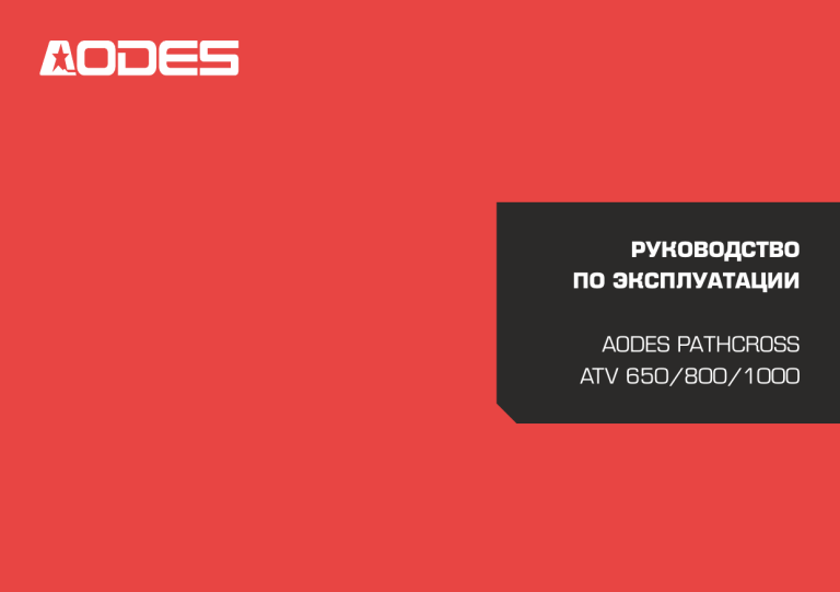РУКОВОДСТВО ПО ЭКСПЛУАТАЦИИ AODES PATHCROSS ATV 650/800/1000 КАНАЛ ОФИЦИАЛЬНОГО ДИСТРИБЬЮТОРА И ПРЕДСТАВИТЕЛЯ AODES Telegram-канал компании Formula7, официального дистрибьютора и представителя AODES в ЦФО, ПФО, ЮФО и СКФО. Здесь вы познакомитесь со свежими новостями, сможете задать вопрос о гарантии или ремонте техники AODES. Отвечают сотрудники дистрибьютора и представителя AODES. САЙТ ОФИЦИАЛЬНОГО ДИСТРИБЬЮТОРА И ПРЕДСТАВИТЕЛЯ AODES Актуальный каталог техники, карта дилеров в разных регионах России и другая необходимая информация. ПРЕДУПРЕЖДЕНИЕ • Эксплуатация данного снегоболотохода лицами моложе 16 лет может увеличить риск серьезной травмы или смерти!!! Данное транспортное средство может перевернуться, если им неправильно управлять!!! • Всегда требуется наблюдение взрослых. • Лица моложе 16 лет НЕ могут управлять данным снегоболотоходом. • Перегрузка снегоболотохода может отрицательно повлиять на управляемость этим транспортным средством. • Снегоболотоход разработан и изготовлен только для БЕЗДОРОЖЬЯ (ДОПУСКАЕТСЯ ДЛЯ РЫНКА РФ ПЕРЕМЕЩЕНИЕ ПО ДОРОГАМ ОБЩЕГО ПОЛЬЗОВАНИЯ). • Все гонщики ДОЛЖНЫ носить шлем и другое защитное снаряжение. • НЕ управляйте этим транспортным средством во время / после употребления алкоголя или наркотиков. • При заправке вы должны заглушить двигатель, чтобы избежать возникновения искры или возгорания. • Внимательно прочтите руководство по эксплуатации перед эксплуатацией снегоболотохода. Уважаемый клиент: Поздравляем и благодарим вас за то, что вы решили стать частью нашей семьи, купив новый снегоболотоход. Мы разработали его, думая о вас как о владельце, чтобы обеспечить вам отличную стабильность мощности и функциональность вашего квадроцикла. Этот снегоболотоход был разработан только для БЕЗДОРОЖЬЯ (ДОПУСКАЕТСЯ ДЛЯ РЫНКА РФ ПЕРЕМЕЩЕНИЕ ПО ДОРОГАМ ОБЩЕГО ПОЛЬЗОВАНИЯ). Настоящее Руководство Пользователя предназначено для ознакомления со всеми надлежащими рабочими процедурами. В нем также содержится важная и необходимая информация об общем уходе и техническом обслуживании вашего квадроцикла. Прочтите следующие страницы о предупреждениях о безопасности, навыках активной езды и мерах предосторожности для вашей собственной безопасности и безопасности окружающих вас людей. Детям в возрасте до 16 лет ЗАПРЕЩАЕТСЯ управлять этим транспортным средством. Вся информация в этом руководстве основана на последних данных и спецификациях продукта, доступных на момент печати. Производитель данного снегоболотохода оставляет за собой право вносить изменения и усовершенствования продукта, которые могут повлиять на иллюстрации, компоновку или пояснения без предварительного уведомления. Если у вас есть другие вопросы, касающиеся работы или обслуживания нашего снегоболотохода, обратитесь к любому авторизованному дилеру. Продукт и технические характеристики могут быть изменены без предварительного уведомления. ОГЛАВЛЕНИЕ ЭКСПЛУАТАЦИЯ СНЕГОБОЛОТОХОДА ............................................................................................................................ 8 ВОЖДЕНИЕ СНЕГОБОЛОТОХОДА .................................................................................................................................. 21 Контрольный список проверок перед поездкой ................................................................................................................ 22 Перевозка грузов .........................................................................................................................................