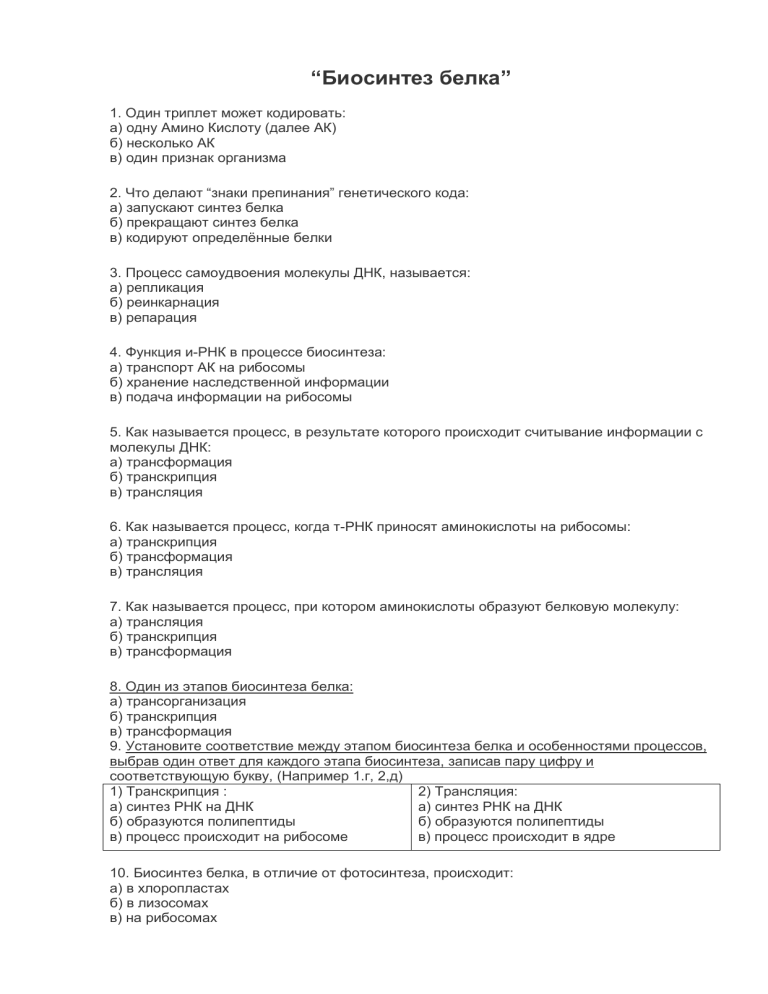 “Биосинтез белка” 1. Один триплет может кодировать: а) одну Амино Кислоту (далее АК) б) несколько АК в) один признак организма 2. Что делают “знаки препинания” генетического кода: а) запускают синтез белка б) прекращают синтез белка в) кодируют определённые белки 3. Процесс самоудвоения молекулы ДНК, называется: а) репликация б) реинкарнация в) репарация 4. Функция и-РНК в процессе биосинтеза: а) транспорт АК на рибосомы б) хранение наследственной информации в) подача информации на рибосомы 5. Как называется процесс, в результате которого происходит считывание информации с молекулы ДНК: а) трансформация б) транскрипция в) трансляция 6. Как называется процесс, когда т-РНК приносят аминокислоты на рибосомы: а) транскрипция б) трансформация в) трансляция 7. Как называется процесс, при котором аминокислоты образуют белковую молекулу: а) трансляция б) транскрипция в) трансформация 8. Один из этапов биосинтеза белка: а) трансорганизация б) транскрипция в) трансформация 9. Установите соответствие между этапом биосинтеза белка и особенностями процессов, выбрав один ответ для каждого этапа биосинтеза, записав пару цифру и соответствующую букву, (Например 1.г, 2,д) 1) Транскрипция : 2) Трансляция: а) синтез РНК на ДНК а) синтез РНК на ДНК б) образуются полипептиды б) образуются полипептиды в) процесс происходит на рибосоме в) процесс происходит в ядре 10. Биосинтез белка, в отличие от фотосинтеза, происходит: а) в хлоропластах б) в лизосомах в) на рибосомах ОтвОтветы: Биосинтез белка” 1. 2. 3. 4. 5. 6. 7. 8. 9. а б а в б в а б 1а2б т₽ 10. в