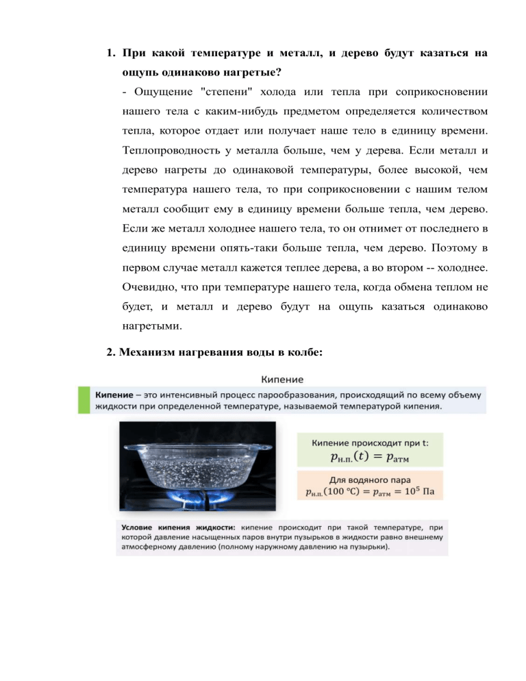 1. При какой температуре и металл, и дерево будут казаться на ощупь одинаково нагретые? - Ощущение "степени" холода или тепла при соприкосновении нашего тела с каким-нибудь предметом определяется количеством тепла, которое отдает или получает наше тело в единицу времени. Теплопроводность у металла больше, чем у дерева. Если металл и дерево нагреты до одинаковой температуры, более высокой, чем температура нашего тела, то при соприкосновении с нашим телом металл сообщит ему в единицу времени больше тепла, чем дерево. Если же металл холоднее нашего тела, то он отнимет от последнего в единицу времени опять-таки больше тепла, чем дерево. Поэтому в первом случае металл кажется теплее дерева, а во втором -- холоднее. Очевидно, что при температуре нашего тела, когда обмена теплом не будет, и металл и дерево будут на ощупь казаться одинаково нагретыми. 2. Механизм нагревания воды в колбе: 3. Действие тяги и когда она лучше: 4. Про конвекцию 5. Почему теплый воздух легче чем холодный: На самом деле, конечно, говорить о том, что горячий воздух “легче” холодного, несколько некорректно. Дело в том, что по мере повышения температуры газа скорость молекул нарастает. Следовательно, расстояние между ними будет тоже увеличиваться. А это означает, что горячий воздух станет занимать больше пространства.
