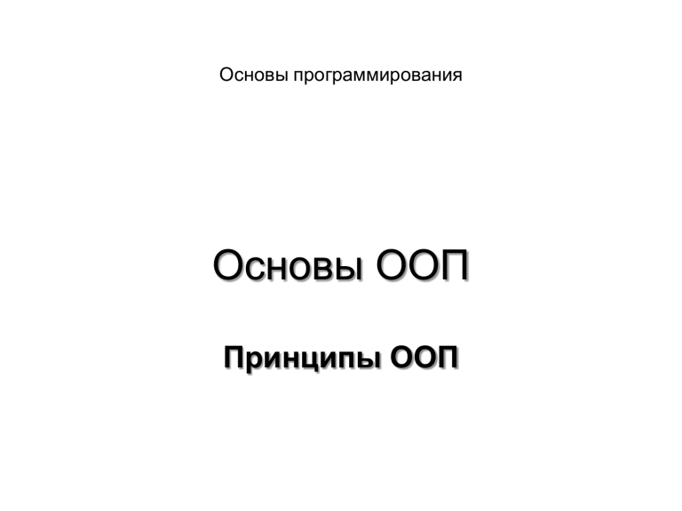 Основы программирования Основы ООП Принципы ООП Методологии программирования • • • • • • Процедурное программирование Структурное программирование Функциональное программирование Логическое программирование Объектно-ориентированное программирование … 2 Процедурное программирование Стиль программирование при котором последовательно выполняемые операторы можно собрать в подпрограммы, то есть более крупные целостные единицы кода, с помощью механизмов самого языка. Особенность: задачи разбиваются на шаги и решаются шаг за шагом -- определяются языковые конструкции для выполнения последовательности алгоритмических шагов. Си, Фортран, Pascal, Kotlin и другие. 3 Структурное программирование В основе парадигмы (совокупности идей и понятий, определяющих стиль написания компьютерных программ ) структурного программирования, лежит представление программы в виде иерархической структуры блоков. Появилось как следствие возрастания сложности решаемых на компьютерах задач, и соответственно, усложнения программного обеспечения в конце 1960-х — начале 1970-х годов 4 Функциональное программирование Процесс вычисления трактуется как вычисление значений функций в математическом понимании последних (в отличие от функций как подпрограмм в процедурном программировании). Лисп, APL, Haskell и другие. 5 Объектно-ориентированное программирование Основано на представлении программы в виде совокупности объектов, каждый из которых является экземпляром определѐнного класса, а классы образуют иерархию наследования. Возникло в результате развития идеологии процедурного программирования, где данные и подпрограммы (процедуры, функции) их обработки формально не связаны. Smalltalk, Python, Ruby, … C++, Visual Basic, Delphi, Java, C#, PHP,… 6 … • В каждой из рассмотренных методологий задача должна быть разбита на более мелкие единицы. • Разработчики программного обеспечения могут выбрать одну или комбинацию из более чем одной из этих методологий для разработки программного обеспечения. 7 ООП. Определение Объектно-ориентированное программирование — одна из методологий программирования, основанная на представлении программы в виде совокупности объектов, каждый из которых является экземпляром определѐнного класса, а классы образуют иерархию наследования. 8 ООП ООП подход к написанию программ, основывается на объектах, а не на функциях и процедурах. Эта модель ставит в центр внимания объекты, а не действия, данные, логику. Объект — реализация класса. Все реализации одного класса похожи друг на друга, но могут иметь разные параметры и значения. Объекты могут задействовать методы, специфичные для них. 9 Основные принципы ООП (от Алана Кэя) • Всѐ является объектом. • Вычисления осуществляются путѐм взаимодействия (обмена данными) между объектами, при котором один объект требует, чтобы другой объект выполнил некоторое действие. Объекты взаимодействуют, посылая и получая сообщения. Сообщение — это запрос на выполнение действия, дополненный набором аргументов, которые могут понадобиться при выполнении действия. • Каждый объект имеет независимую память, которая состоит из других объектов. 10 Основные принципы ООП (от Алана Кэя) • Каждый объект -- представитель класса, выражающего общие свойства объектов (таких, как целые числа). • В классе задаѐтся поведение (функциональност