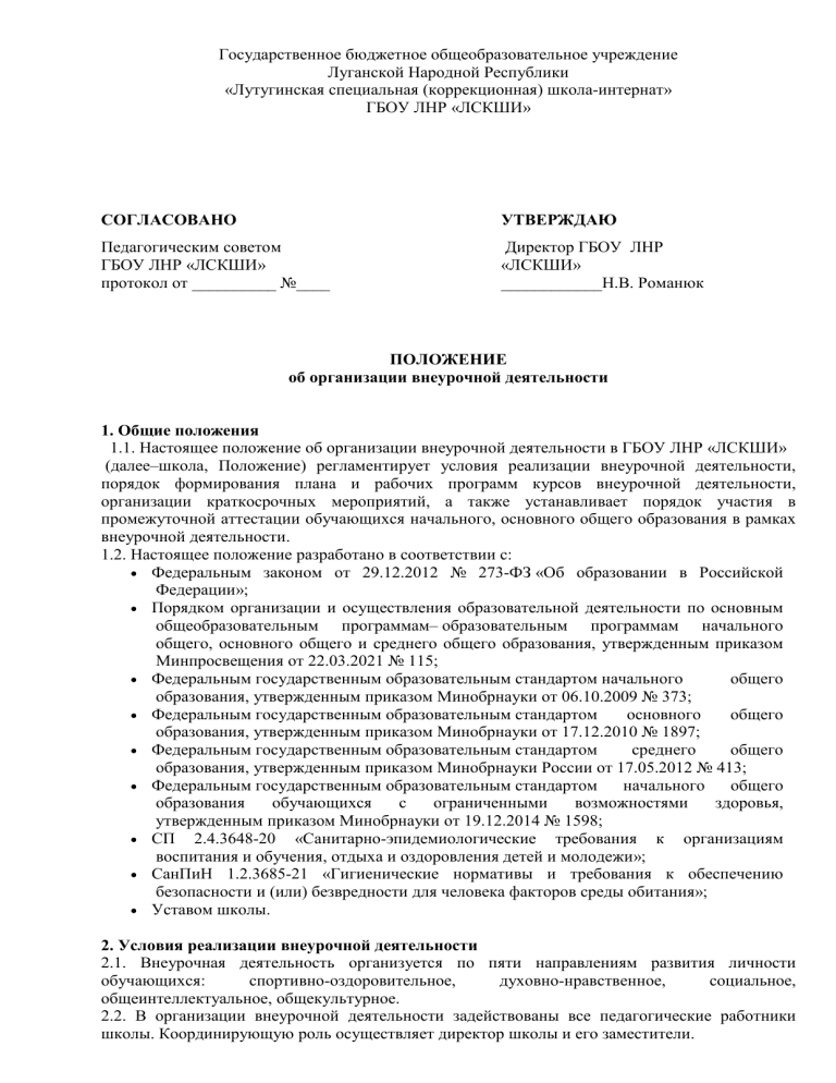 Государственное бюджетное общеобразовательное учреждение Луганской Народной Республики «Лутугинская специальная (коррекционная) школа-интернат» ГБОУ ЛНР «ЛСКШИ» СОГЛАСОВАНО УТВЕРЖДАЮ Педагогическим советом ГБОУ ЛНР «ЛСКШИ» протокол от __________ №____ Директор ГБОУ ЛНР «ЛСКШИ» ____________Н.В. Романюк ПОЛОЖЕНИЕ об организации внеурочной деятельности 1. Общие положения 1.1. Настоящее положение об организации внеурочной деятельности в ГБОУ ЛНР «ЛСКШИ» (далее–школа, Положение) регламентирует условия реализации внеурочной деятельности, порядок формирования плана и рабочих программ курсов внеурочной деятельности, организации краткосрочных мероприятий, а также устанавливает порядок участия в промежуточной аттестации обучающихся начального, основного общего образования в рамках внеурочной деятельности. 1.2. Настоящее положение разработано в соответствии с: Федеральным законом от 29.12.2012 № 273-ФЗ «Об образовании в Российской Федерации»; Порядком организации и осуществления образовательной деятельности по основным общеобразовательным программам– образовательным программам начального общего, основного общего и среднего общего образования, утвержденным приказом Минпросвещения от 22.03.2021 № 115; Федеральным государственным образовательным стандартом начального общего образования, утвержденным приказом Минобрнауки от 06.10.2009 № 373; Федеральным государственным образовательным стандартом основного общего образования, утвержденным приказом Минобрнауки от 17.12.2010 № 1897; Федеральным государственным образовательным стандартом среднего общего образования, утвержденным приказом Минобрнауки России от 17.05.2012 № 413; Федеральным государственным образовательным стандартом начального общего образования обучающихся с ограниченными возможностями здоровья, утвержденным приказом Минобрнауки от 19.12.2014 № 1598; СП 2.4.3648-20 «Санитарно-эпидемиологические требования к организациям воспитания и обучения, отдыха и оздоровления детей и молодежи»; СанПиН 1.2.3685-21 «Гигиенические нормативы и требования к обеспечению безопасности и (или) безвредности для человека факторов среды обитания»; Уставом школы. 2. Условия реализации внеурочной деятельности 2.1. Внеурочная деятельность организуется по пяти направлениям развития личности обучающихся: спортивно-оздоровительное, духовно-нравственное, социальное, общеинтеллектуальное, общекультурное. 2.2. В организации внеурочной деятельности задействованы все педагогические работники школы. Координирующую роль осуществляет директор школы и его заместители. 2.3. Внеурочная деятельность осуществляется в формах, отличных от урочных, в виде разовых и краткосрочных мероприятий, постоянных мероприятий и курсов. При реализации внеурочной деятельности могут использоваться аудиторные и внеаудиторные формы образовательновоспитательной деятельности. 2.4. Внеурочная деятельность реализуется школой как самостоятельно, так и посредством сетевых форм их реализации. При организации внеурочной деятельности обучающихся в школе используются учебные кабинеты, классы, общешкольные помещения, возможности структурного подразделения «Детский дом». 3. Порядок разработки и утверждения плана внеурочной деятельности 3.1. План внеурочной деятельности (далее–план) является основным организационным механизмом реализации основны